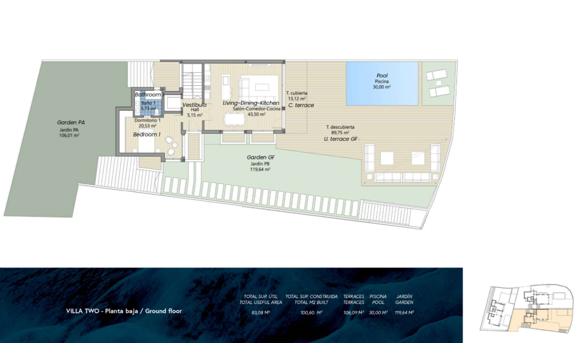 - Planta baja luminosa y abierta: El salón, la cocina y el comedor se funden en un único espacio abierto con acceso directo al jardín y a la piscina privada. Grandes ventanales llenan la casa de luz natural, mientras que el diseño interior combina confort y sofisticación. Aquí también se encuentra el dormitorio principal, con baño en suite y acceso a zonas exteriores privadas.