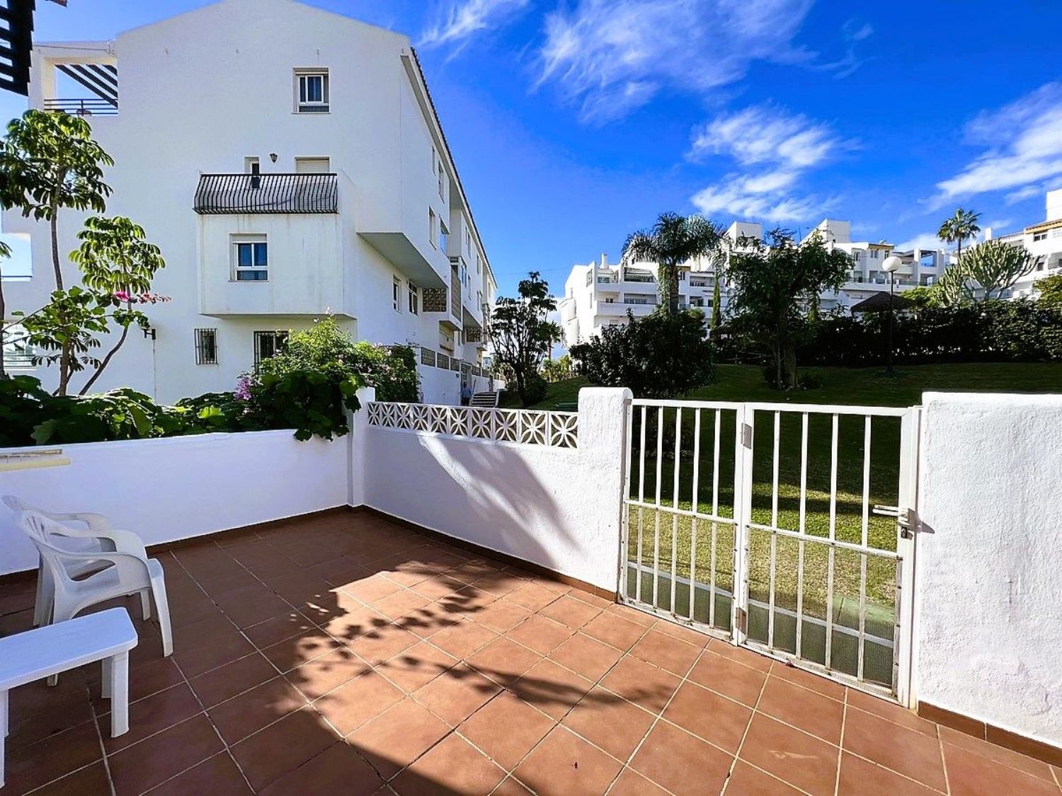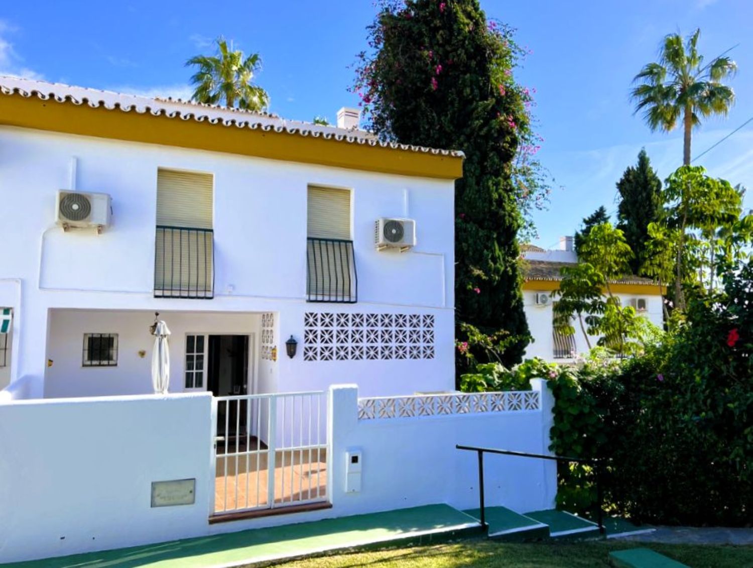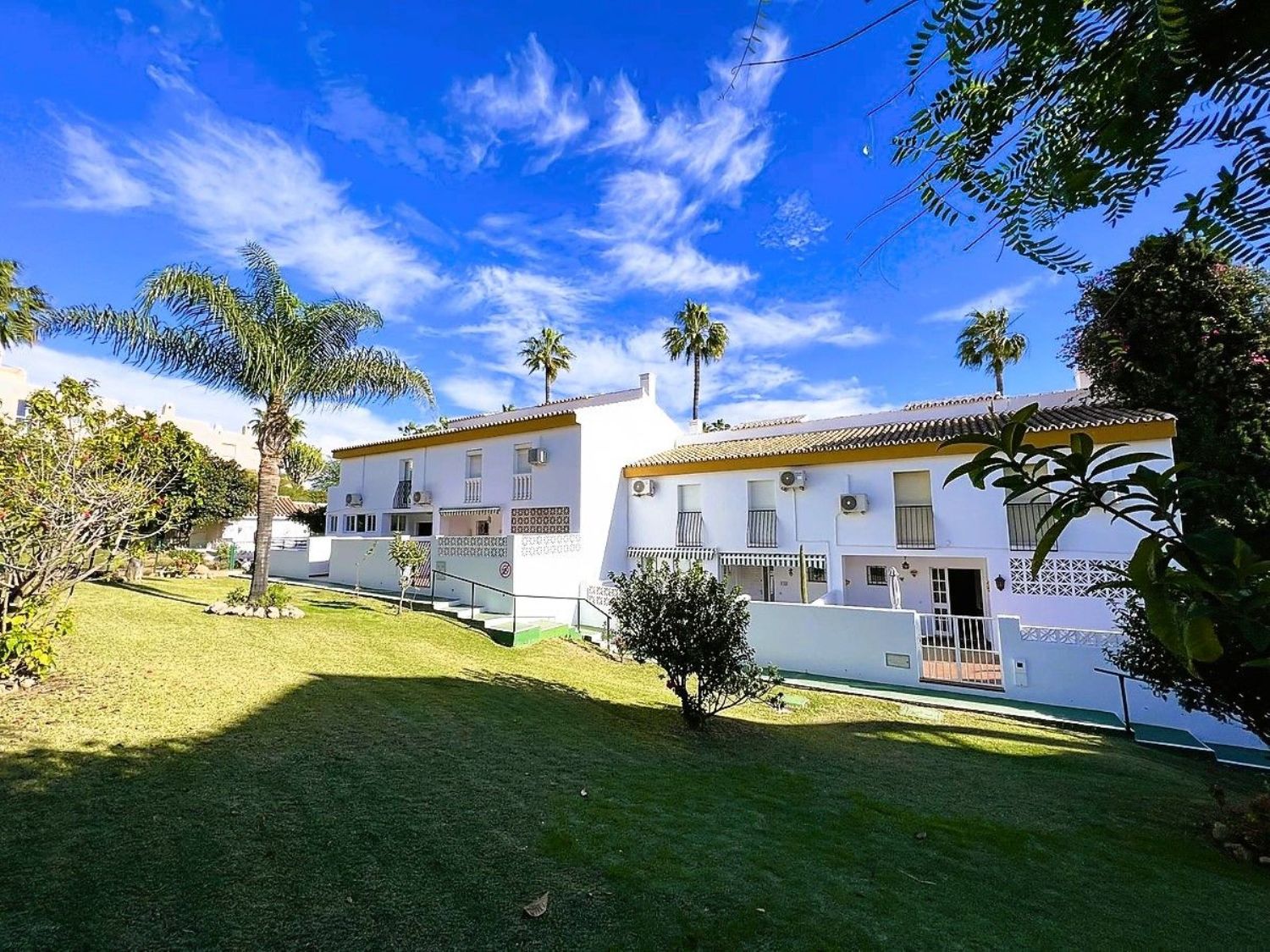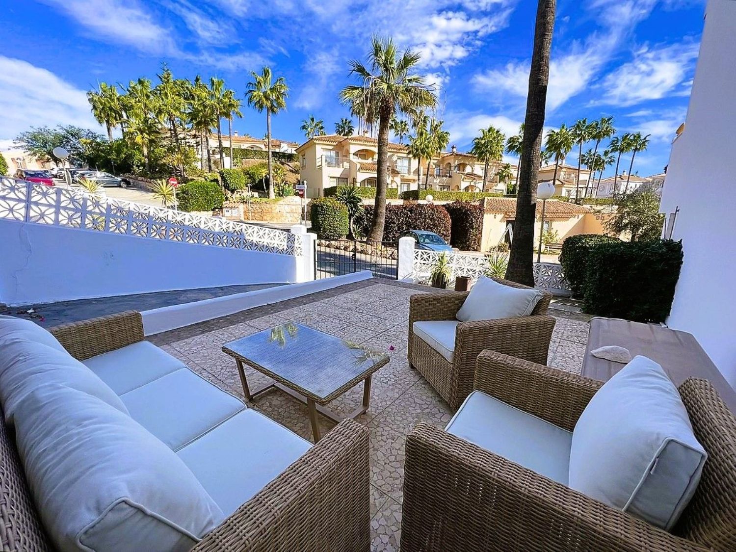 Le damos la bienvenida a esta encantadora casa adosada de cuatro habitaciones, dos baños y un aseo, situada en Mijas Costa, a poca distancia de la playa.La casa se encuentra en el complejo Wyndham (anteriormente Club La Costa) y se encuentra a una corta distancia de Fuengirola, el centro comercial Miramar, Castillon, restaurantes, tiendas y la playa. Además, en las afueras de la zona, se puede acceder a hermosos senderos para caminar y a excelentes rutas para andar en bicicleta, así como a canchas de pádel y tenis.La casa está situada en una de las calles más pequeñas de la zona y, si tiene un automóvil, puede estacionarlo en el amplio estacionamiento para invitados o en el estacionamiento privado dentro de la puerta, justo al lado de la propiedad. Frente a esta entrada, también encontrará una amplia terraza con sol de la mañana, donde podrá disfrutar de su desayuno si lo desea.Al entrar, encontrará la sala de estar y el comedor, ambos con puertas de vidrio que dan a la terraza. Una puerta doble conduce a un pequeño vestíbulo desde donde se puede acceder a la cocina, al aseo de invitados, a las escaleras que conducen a la planta superior y al patio trasero orientado al oeste. El patio cuenta con suficiente espacio para una mesa y tumbonas y, a través de la puerta, se accede al jardín verde lleno de árboles y plantas. Aquí también encontrará la zona de la piscina común.En la planta superior, encontrará cuatro amplias habitaciones y dos baños, siendo el principal de ellos en suite. El dormitorio principal también cuenta con un balcón privado con vistas a la zona.