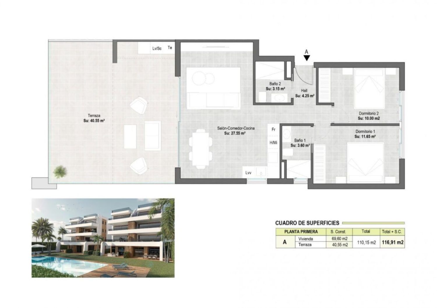 APARTAMENTOS DE OBRA NUEVA EN EL CAMPO DE GOLF DE CONDADO DE ALHAMA Complejo residencial de villas y apartamentos de nueva construcción en Condado de Alhama. Los 8 hermosos apartamentos se distribuyen entre planta baja, primera, segunda y tercera, con dos viviendas en cada planta y ascensor para pasar de un nivel a otro. Disponen de varias piscinas comunitarias, plaza de aparcamiento exterior para cada apartamento, trastero y terraza con cocina de verano. Las viviendas de la última planta tienen un solarium. Las dos viviendas de la planta baja tienen 3 dormitorios y 2 baños completos y el resto de las viviendas tienen 2 dormitorios y 2 baños completos también. Las viviendas han sido diseñadas con un estilo contemporáneo y un concepto abierto, compuesto por una cocina equipada y un salón-comedor. La promoción se encuentra en el Condado de Alhama, Murcia, dentro de un complejo turístico de lujo, con zonas deportivas y rodeado de naturaleza, todos los servicios, y varios Campos de Golf. La vivienda cumplirá con los más altos estándares y estará dotada de: Piscinas comunitarias con amplias zonas verdes. Cocina completamente amueblada y equipada con horno y microondas elevados y en columna, nevera y lavavajillas integrados, placa de inducción y campana extractora. Iluminación: en el interior de la vivienda (comedor, cocina, pasillos y baños), así como en las zonas exteriores. Armarios forrados con cajones y estantes. Cuartos de baño totalmente equipados con mueble de lavabo, inodoro suspendido, espejo, ducha mural y mamparas de ducha. Preinstalación de aire acondicionado por conductos. Cocina de verano en las terrazas. Solarium en las plantas superiores. Plaza de aparcamiento exterior con trastero. Ascensor (desde la planta baja hasta la 3ª planta). Condado de Alhama Golf Resort es un fantástico complejo de golf con muchas instalaciones y servicios. Un centro comercial, un centro deportivo, una variedad de bares y restaurantes, supermercados y más de 25 piscinas y jardines comunitarios. Condado de Alhama Golf Resort tiene su propio campo de golf diseñado por Jack Nicklaus y está a sólo 15 minutos de las hermosas playas de Bolnuevo y Mazarrón. Mazarrón tiene más de 35 km de costa, gran parte de la cual es costa virgen. Numerosas playas de la Bahía de Mazarrón han sido galardonadas con la Bandera Azul por su calidad. Condado de Alhama Golf Resort está a sólo 20 minutos del nuevo aeropuerto internacional de Corvera.