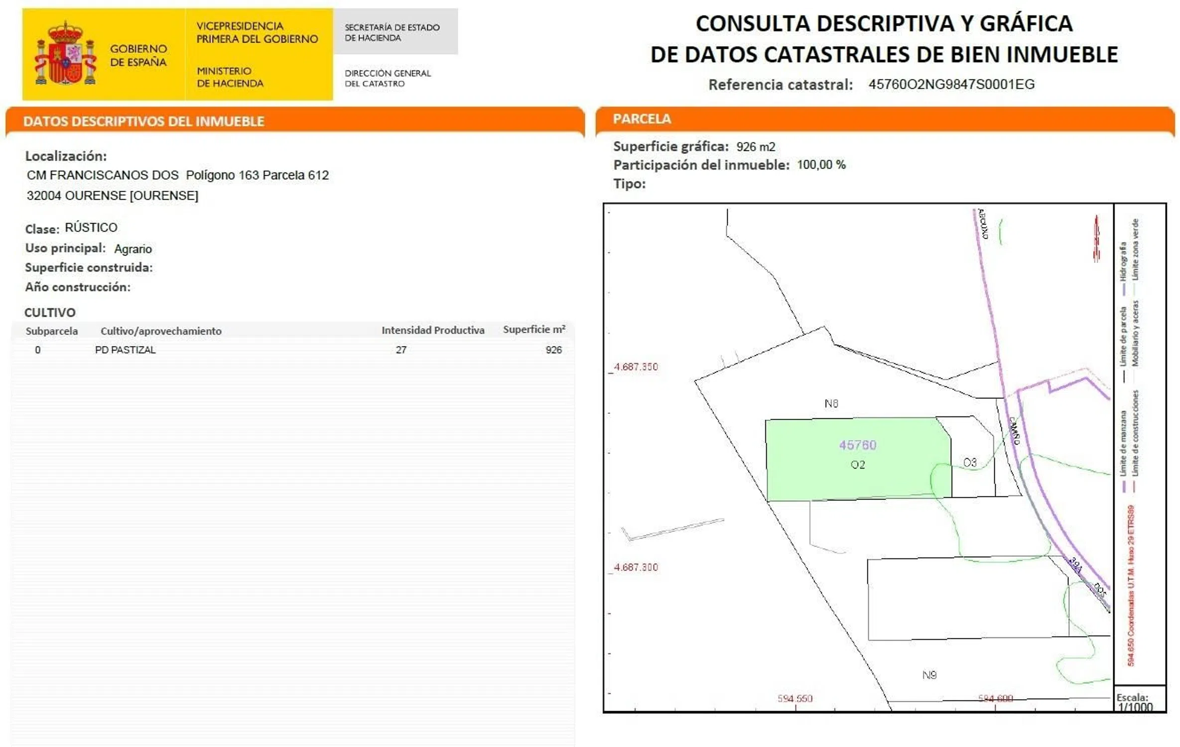 En el ayuntamiento de Orense, cerca del Botánico de Montealegre, se comercializan dos parcelas de resultado con una superficie de 1.926m²s (45760O1NG9847S0001JG y 45760O2NG9847S0001EG). Estas parcelas pertenecen al proyecto de equidistribución del Área de Reparto AR-20-E Barrocás, recogida dentro de la Ordenación Provisional Urbanística (DOG 03/10/11). No obstante, dicha ordenación provisional ha sido anulada por distintas sentencias de la sala del Contencioso Administrativo (sección primera) del Tribunal Supremo. Según PGOU de 1986 las parcelas se sitúan sobre un suelo rústico no urbanizable común. Al tratarse de un plan no adaptado a la Ley 2/2016, ni a la ley 9/2002, se le aplicará lo dispuesto en el artículo 2. d) de la disposición transitoria primera de la Ley 2/2016 del Suelo de Galicia, y por lo tanto las parcelas se sitúan sobre un suelo rústico de protección ordinaria. ¿Necesitas más información? Contacta con nosotros y te informaremos sin compromiso PARA MÁS INFO: Vicente **645** 95 * 69 ** 15 ** Ikesa tiene sus oficinas en: Velázquez Moreno, 17 1º VIGO Visítelo sin compromiso. 0% Comisión a compradores para este activo. IKESA Real Estate informa que no cobra comisión de ningún tipo por inmuebles procedentes de Entidades Financieras y Fondos de Inversión, así como producto de Obra Nueva. El precio no tiene incluido aquellos gastos que por Ley le pudiera corresponder a la parte adquirente, tales como ITP, IVA, Notaría y Registro. IKESA es una agencia homologada de diferentes Entidades Financieras, disponemos de una amplia cartera de Activos Inmobiliarios, consúltenos sin compromiso.