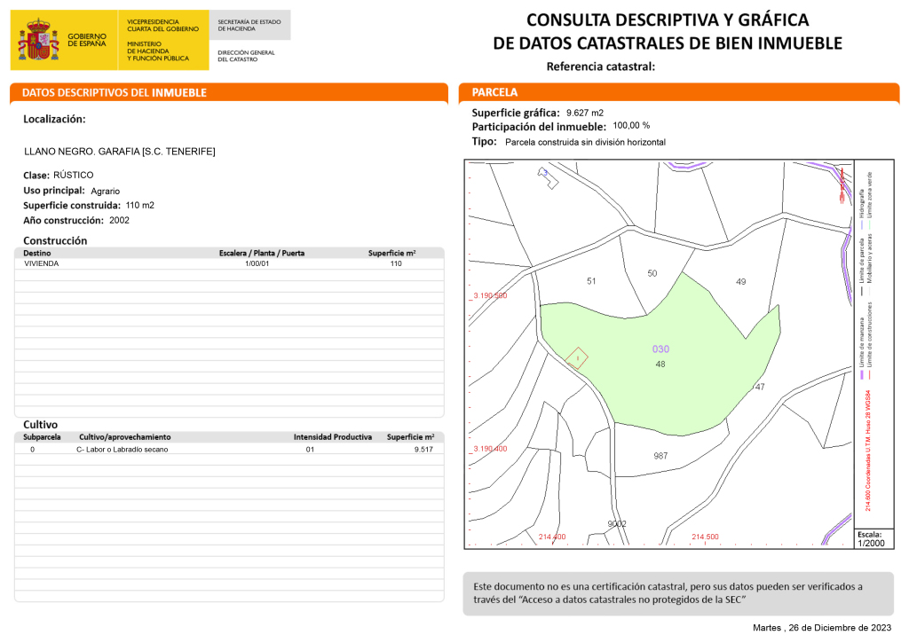 ID-545 En venta finca con vivienda muy cómoda, ubicada cerca de la carretera y en las proximidades de Llano Negro. La casa es amplia y la finca está preparada para el cultivo, cuenta con varios frutales ya plantados como limones, limas, mandarinas y naranjas. Además, dispone de buenos bancales y dos acciones de agua para el riego. La vivienda se distribuye en salón-comedor-cocina, 2 dormitorios y 1 baño. Aunque se encuentra en buenas condiciones, requiere algunos acabados y la conexión eléctrica aún está pendiente. No obstante, existe la posibilidad de terminarla según los gustos del comprador. La superficie construida es de aproximadamente 110 m², mientras que la parcela total abarca unos 39.520 m², de los cuales 9.627 m² corresponden a la parcela con la casa y 10.133 m² son terreno sin preparar. La altitud es de 874 m sobre el nivel del mar. Además, cuenta con terraza, aparcamientos exteriores y una acción de agua de El Cedro. El estado del inmueble es de segunda mano en buen estado. La orientación es noroeste y tiene acceso rodado. La carpintería es de aluminio y no dispone de alumbrado público, pero sí de agua. Los muebles están incluidos en el precio, a excepción de los enseres y muebles personales. Contamos con una amplia variedad de propiedades en las dos provincias de las Islas Canarias, España. Además, ofrecemos la posibilidad de búsqueda personalizada para el comprador.