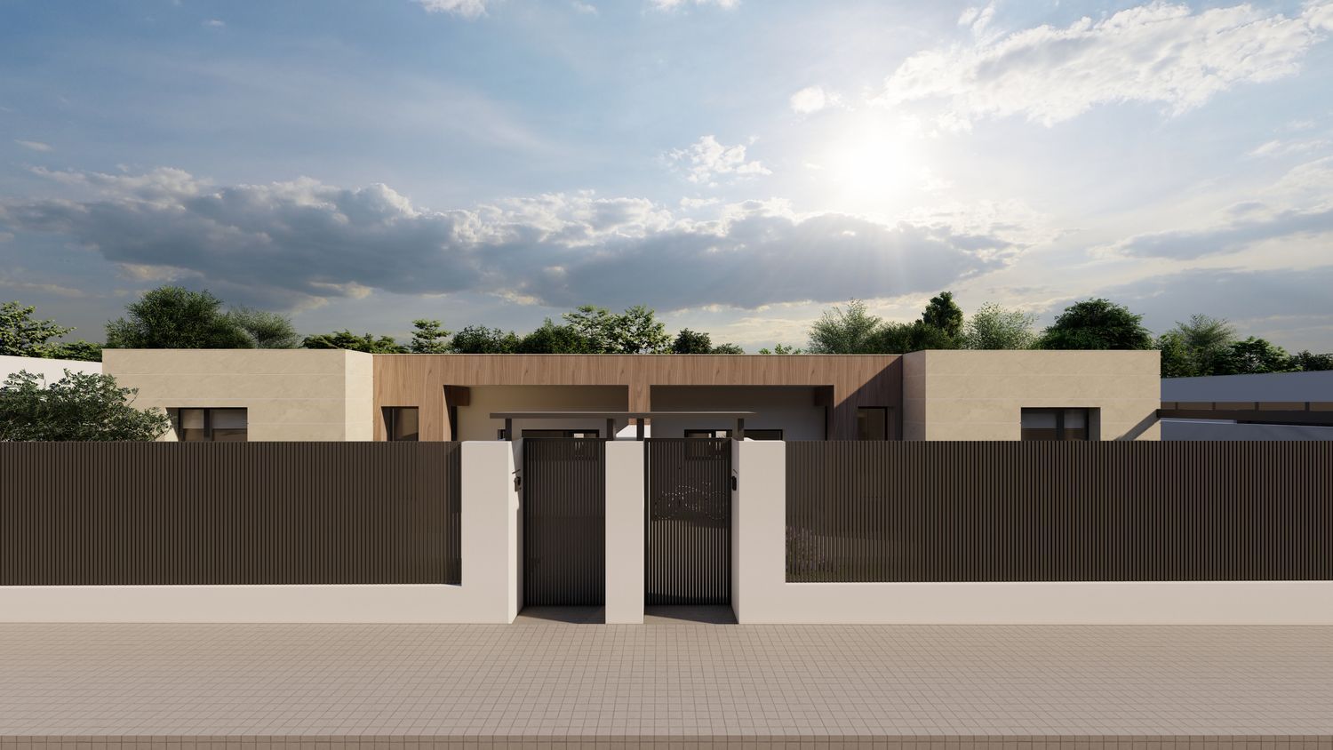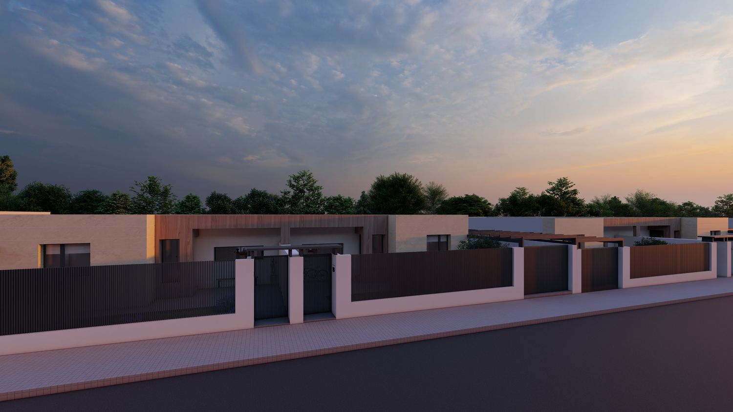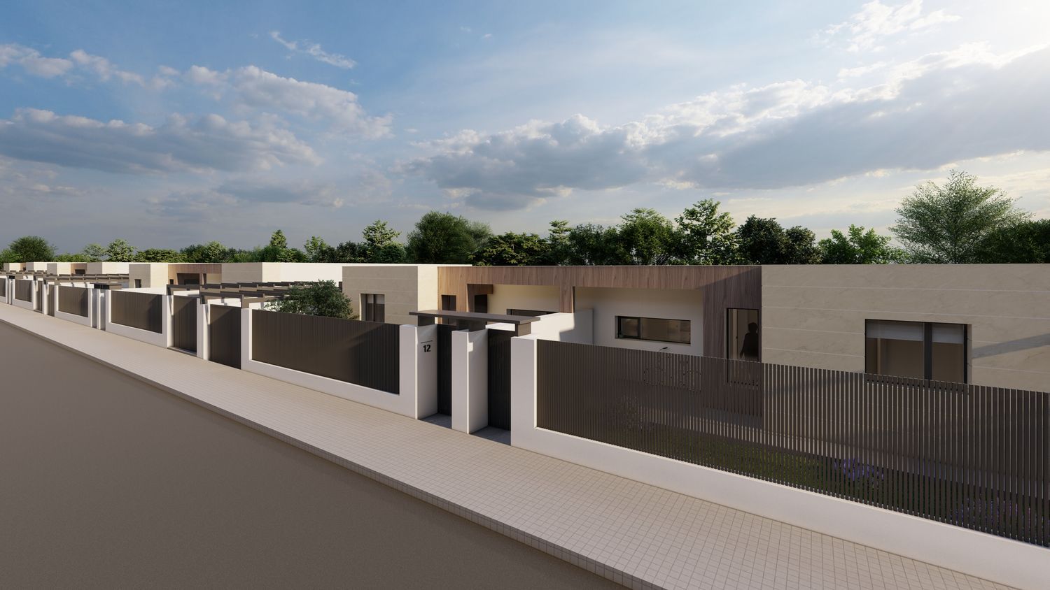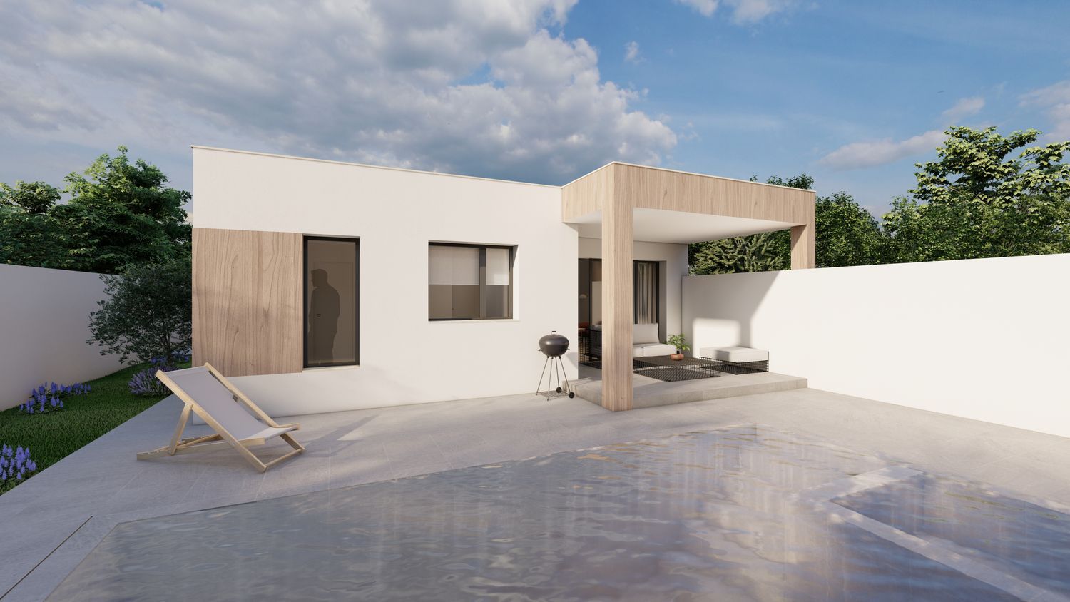 Cómoda distribución en una planta: salón – comedor, 3 dormitorios, 2 baños, el dormitorio principal en suite con su baño y vestidor. Viviendas muy prácticas, sin escaleras interiores. Porche delantero y terraza salida de salón.El garaje en superficie frente de casa en el patio delantero. Gran ventaja de chalet pareado: gozando de intimidad y amplio jardín en la parcela de 300 m2.Acabados modernos sujetas a personalizaciones (alicatados, suelos y pintura), aerotermia incluida.En el precio se incluye todo: parcela, equipo técnico (arquitecto y arquitecto técnico), licencia municipal y construcción – el proyecto llave en mano en la fórmula de autopromoción. La piscina y arreglo de jardín no están incluidos en el precio.Las fotos mostradas en el anuncio son mezcla de renders (iconografías hechas por ordenador como va a quedar la casa) y fotos de otras promociones como ejemplo de acabados que se puede emplear (no reflejan la distribución de esta casa). Las fotos del exterior también son SOLO ejemplo como puede quedar el jardín con la piscina y césped que no están incluidos en el precio.