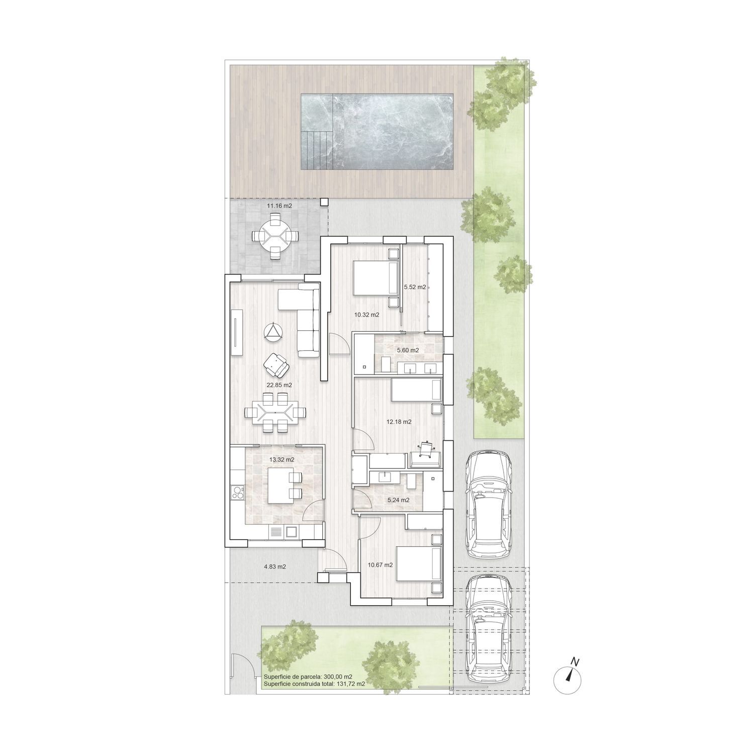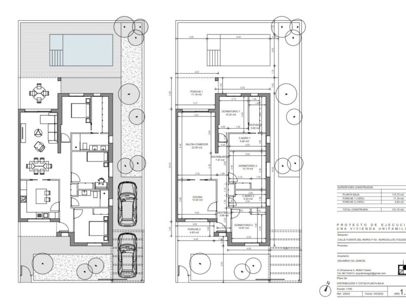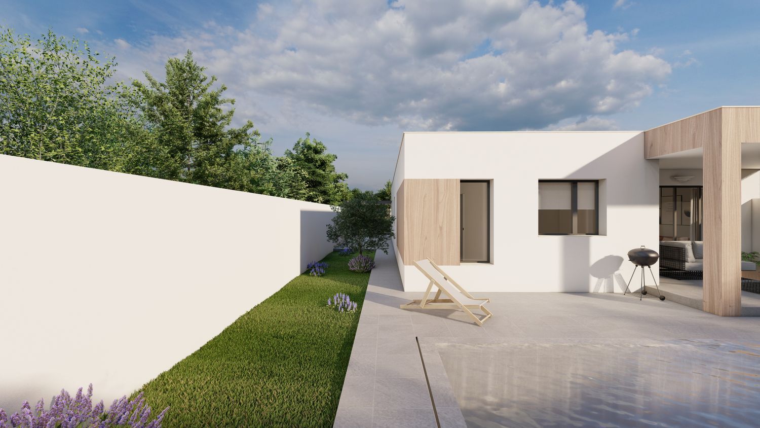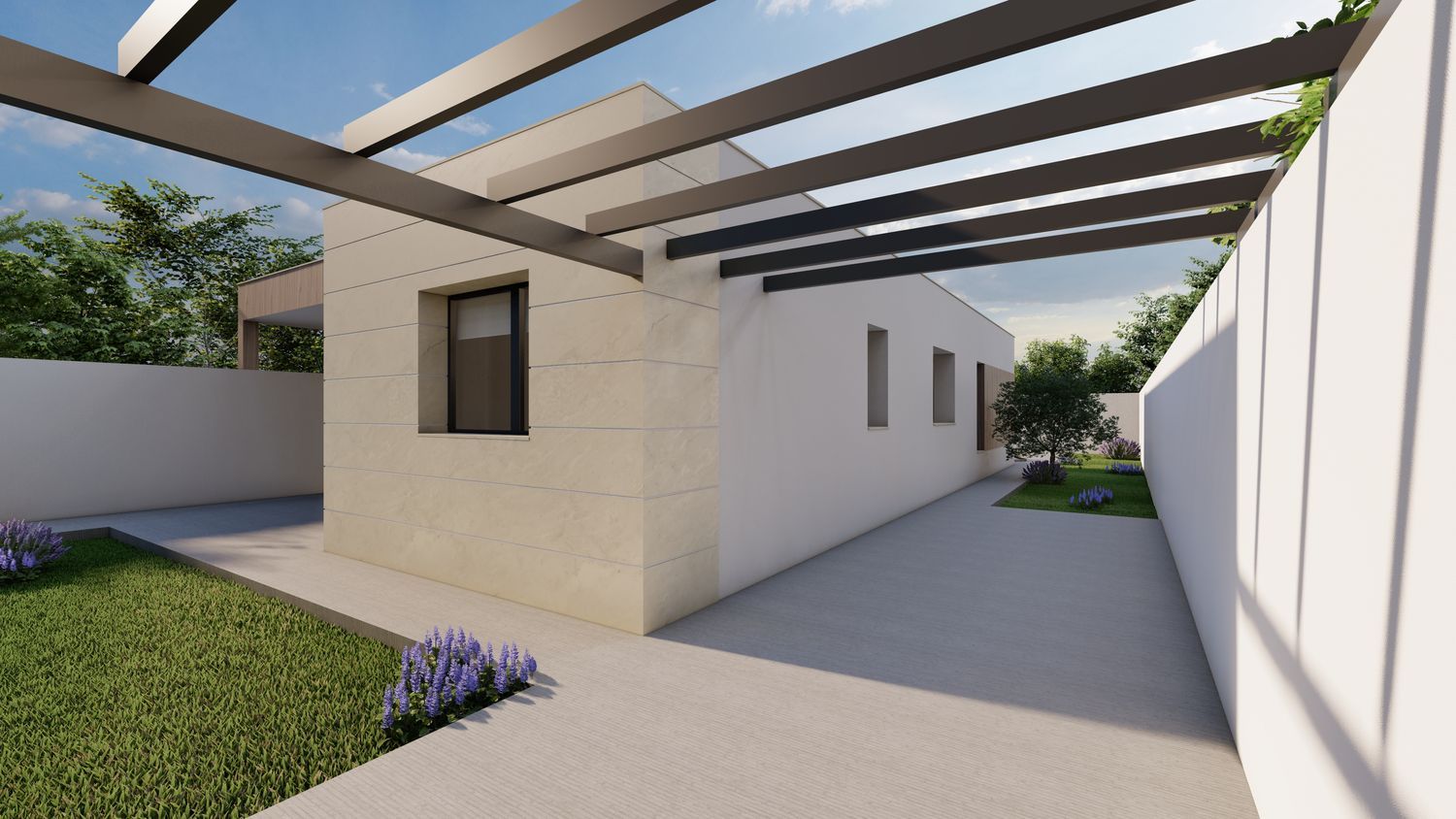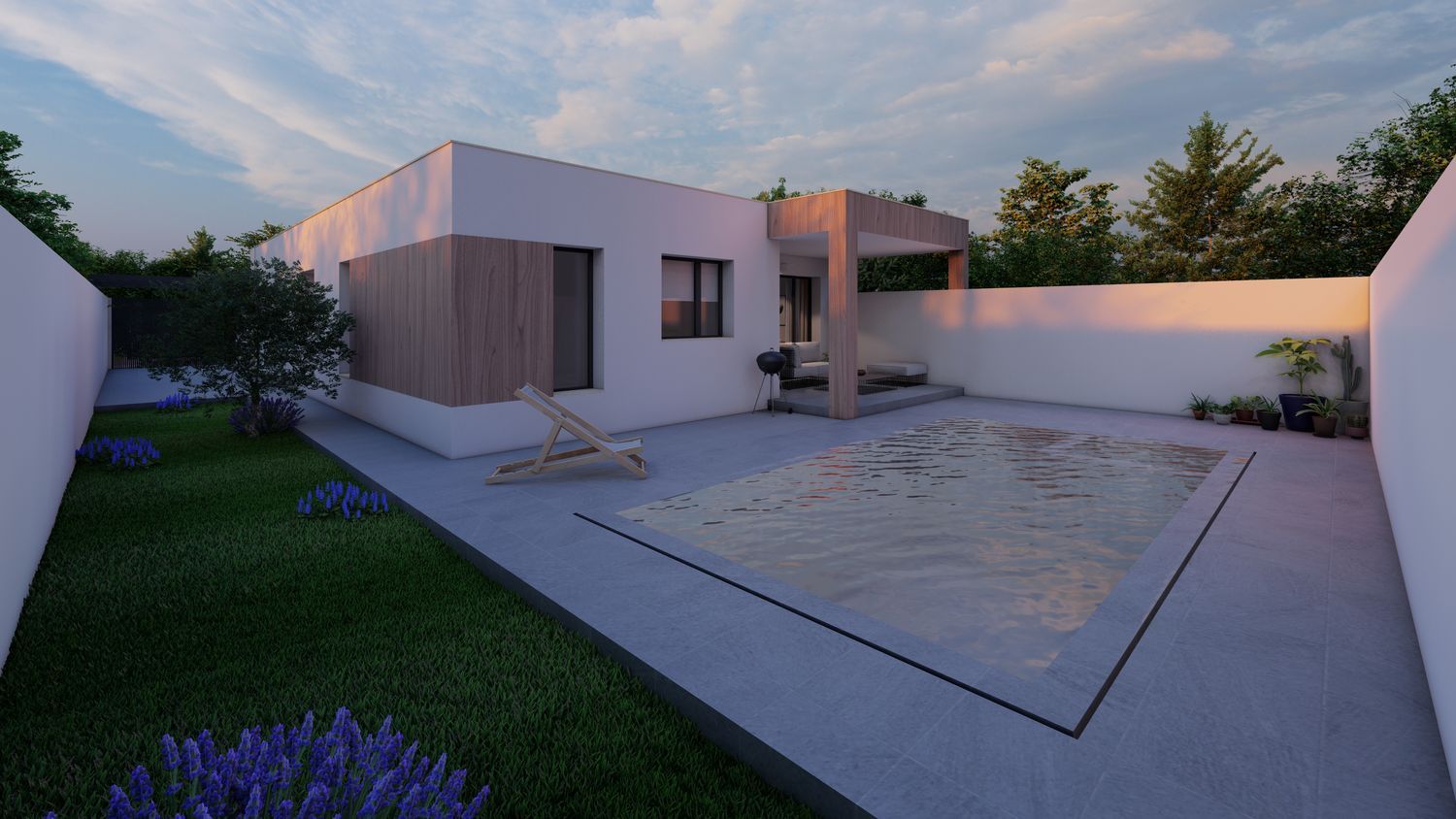 Cómoda distribución en una planta: salón – comedor, 3 dormitorios, 2 baños, el dormitorio principal en suite con su baño y vestidor. Viviendas muy prácticas, sin escaleras interiores. Porche delantero y terraza salida de salón.El garaje en superficie frente de casa en el patio delantero. Gran ventaja de chalet pareado: gozando de intimidad y amplio jardín en la parcela de 300 m2.Acabados modernos sujetas a personalizaciones (alicatados, suelos y pintura), aerotermia incluida.En el precio se incluye todo: parcela, equipo técnico (arquitecto y arquitecto técnico), licencia municipal y construcción – el proyecto llave en mano en la fórmula de autopromoción. La piscina y arreglo de jardín no están incluidos en el precio.Las fotos mostradas en el anuncio son mezcla de renders (iconografías hechas por ordenador como va a quedar la casa) y fotos de otras promociones como ejemplo de acabados que se puede emplear (no reflejan la distribución de esta casa). Las fotos del exterior también son SOLO ejemplo como puede quedar el jardín con la piscina y césped que no están incluidos en el precio.