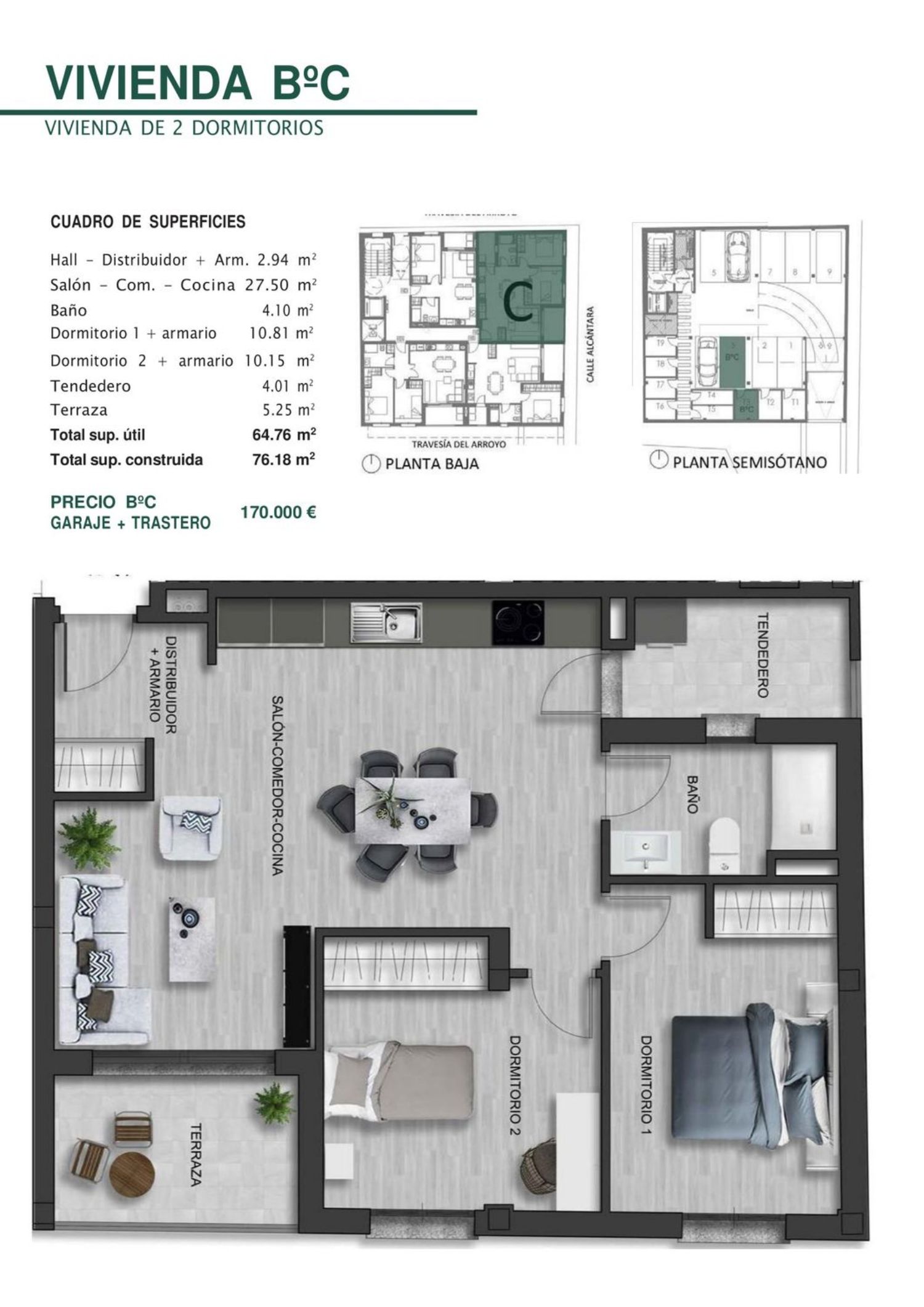 Se trata de un proyecto de 12 viviendas de uno y dos dormitorios con plaza de garaje y trastero. Alicatado con plaqueta cerámica en cocina y baños. • Pavimento de gres porcelánico en toda la vivienda. • Pintura plástica lisa sobre yeso color blanco en el resto de estancias de la vivienda. • Rodapié blanco en cuartos secos. • Gres antideslizante en terrazas y tendederos. Carpintería exterior de aluminio con rotura de puente térmico bicolor (marrón al exterior y blanco en interior) con doble acristalamiento de baja emisividad y cámara con gas argón para conseguir una alta eficiencia energética. Incluye sistema de microventilación. Climatización a través de suelo radiante y refrescante producido por instalación de Aerotermia, con producción mixta de agua caliente sanitaria y refrigeración.