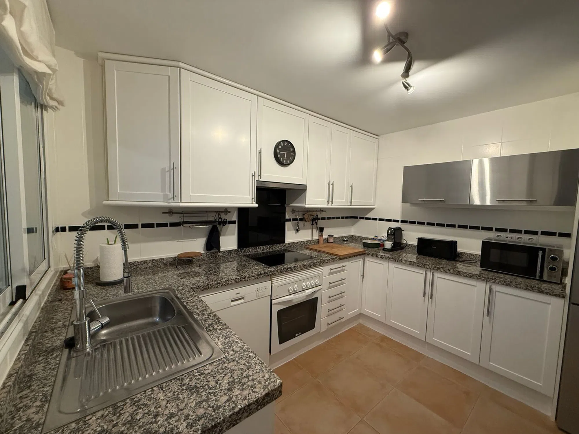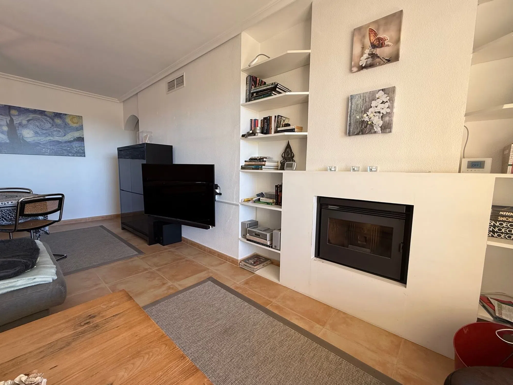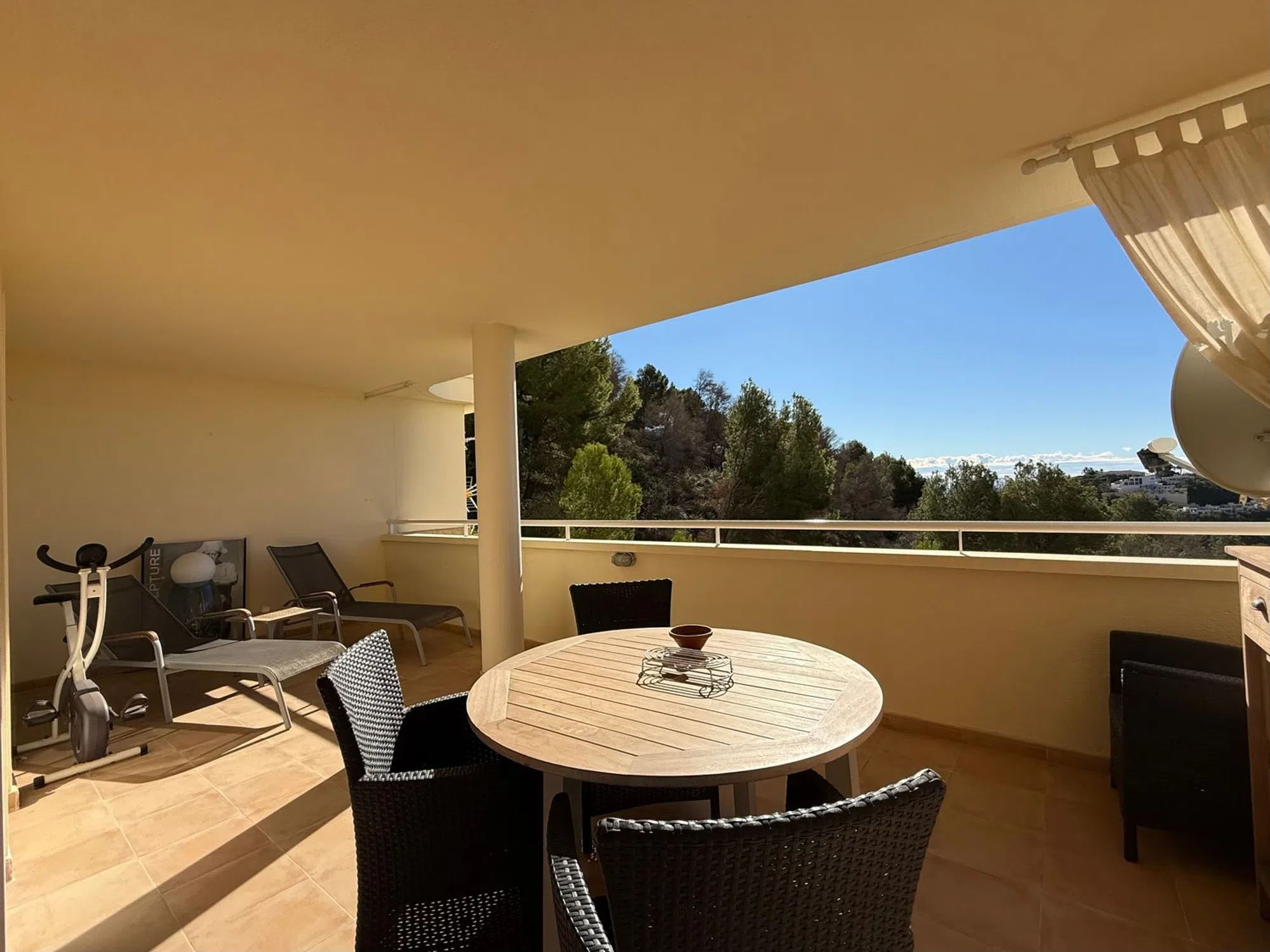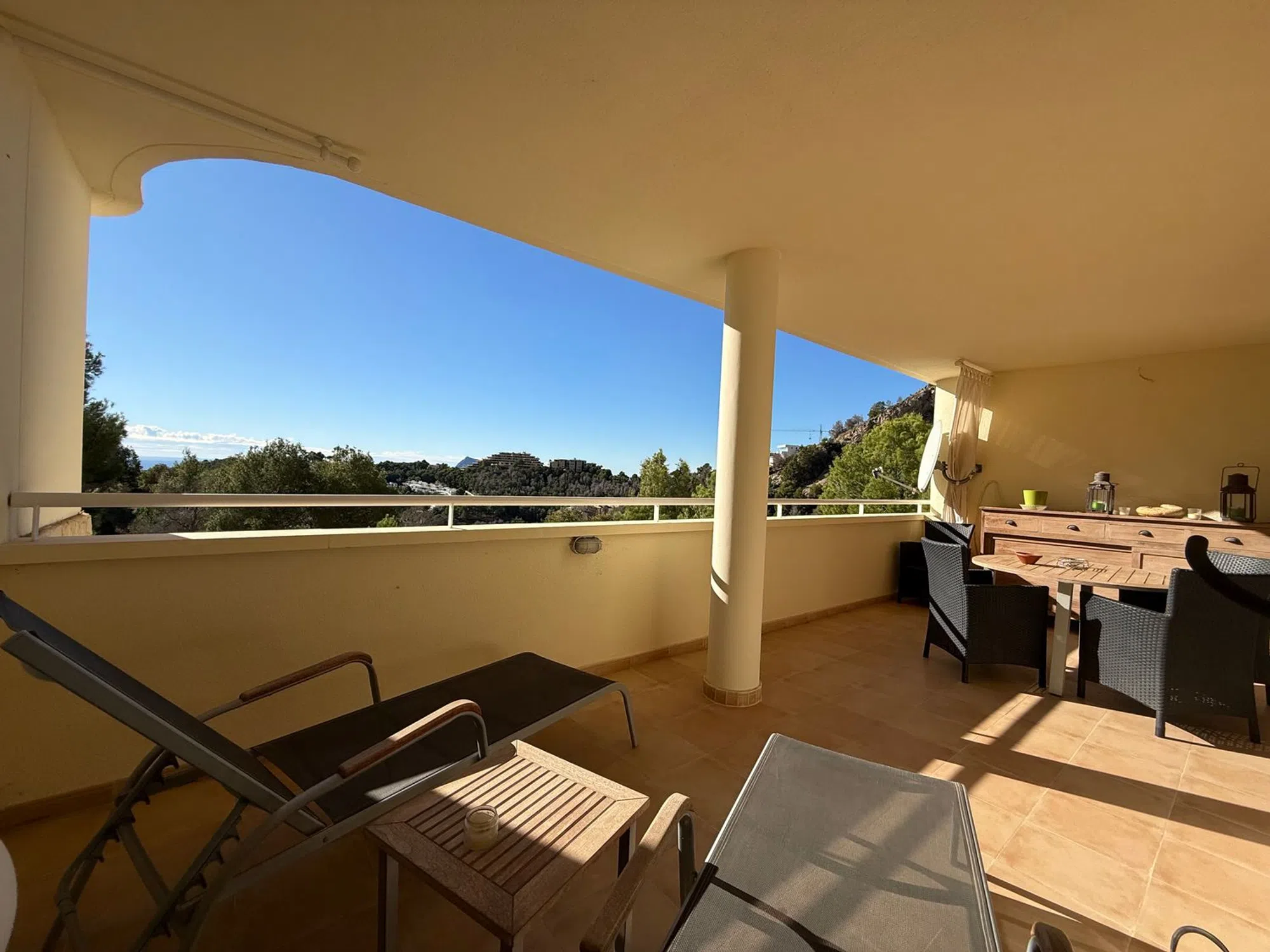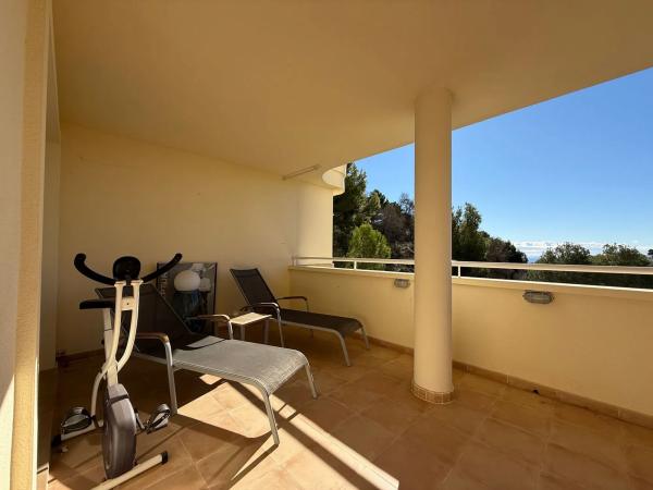 Luminoso, amplio y cómodo apartamento con piscina en Altea Hills. El apartamento se compone de: patio, cocina independiente, salón-comedor, terraza con vistas, dos dormitorios, un baño en suite y un baño independiente. Plaza de parking. Piscina y jardín comunitarios. El apartamento cuenta con un patio interior desde el que se accede a través de la cocina. El salón-comedor tiene acceso a una amplia terraza con vistas y una chimenea de pellets. Tiene dos dormitorios; el dormitorio principal con baño en suite conecta con la terraza. El otro dormitorio tiene una ventana que da al patio. El edificio cuenta con una piscina comunitaria con vistas al mar, un terreno con jardín, una plaza de parking por apartamento. La fachada acaba de pintarse. Muebles y plantas incluidos en el precio. Ibi 600€ Comunidad 1200€ anuales + 500 € de reserva Basura 44€ cada 6 meses Disponible para visitas.