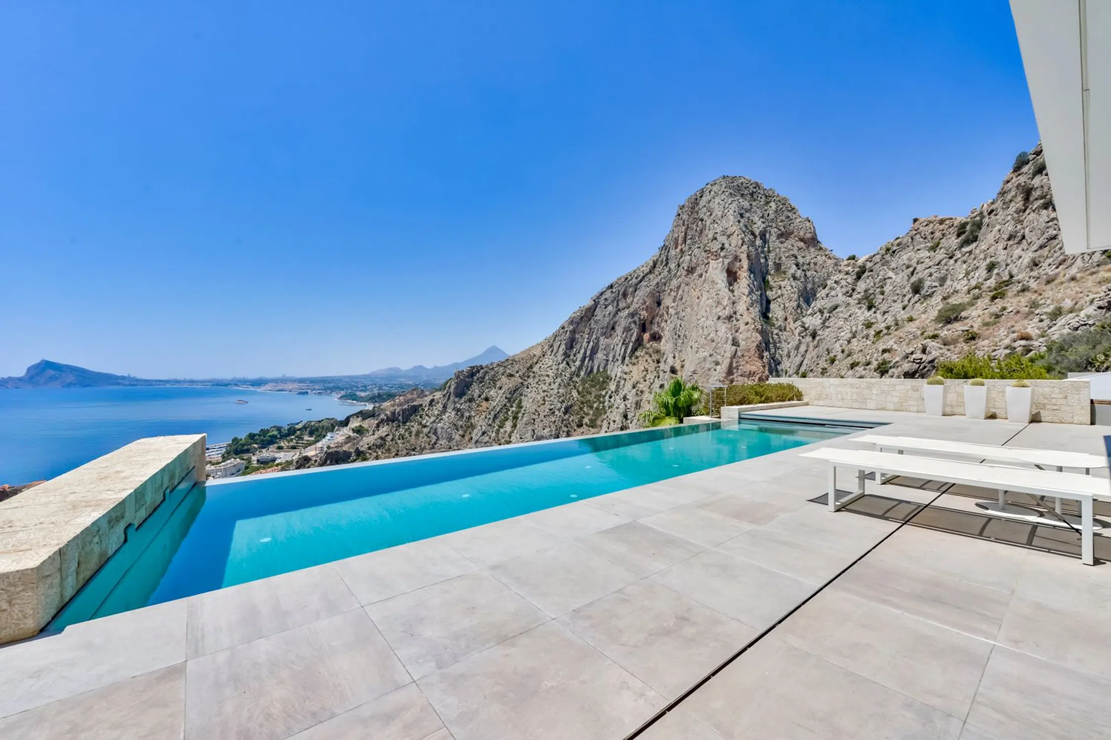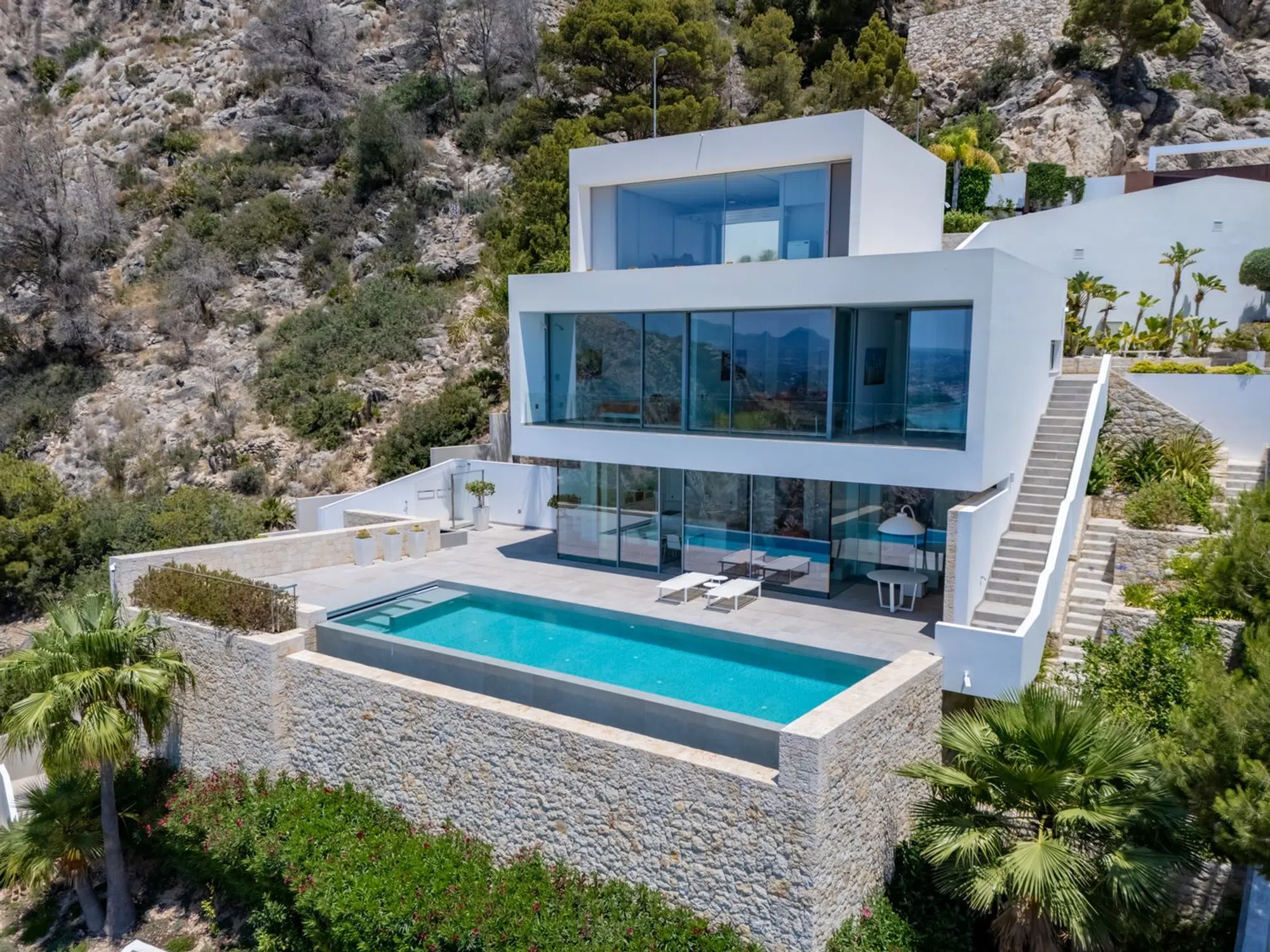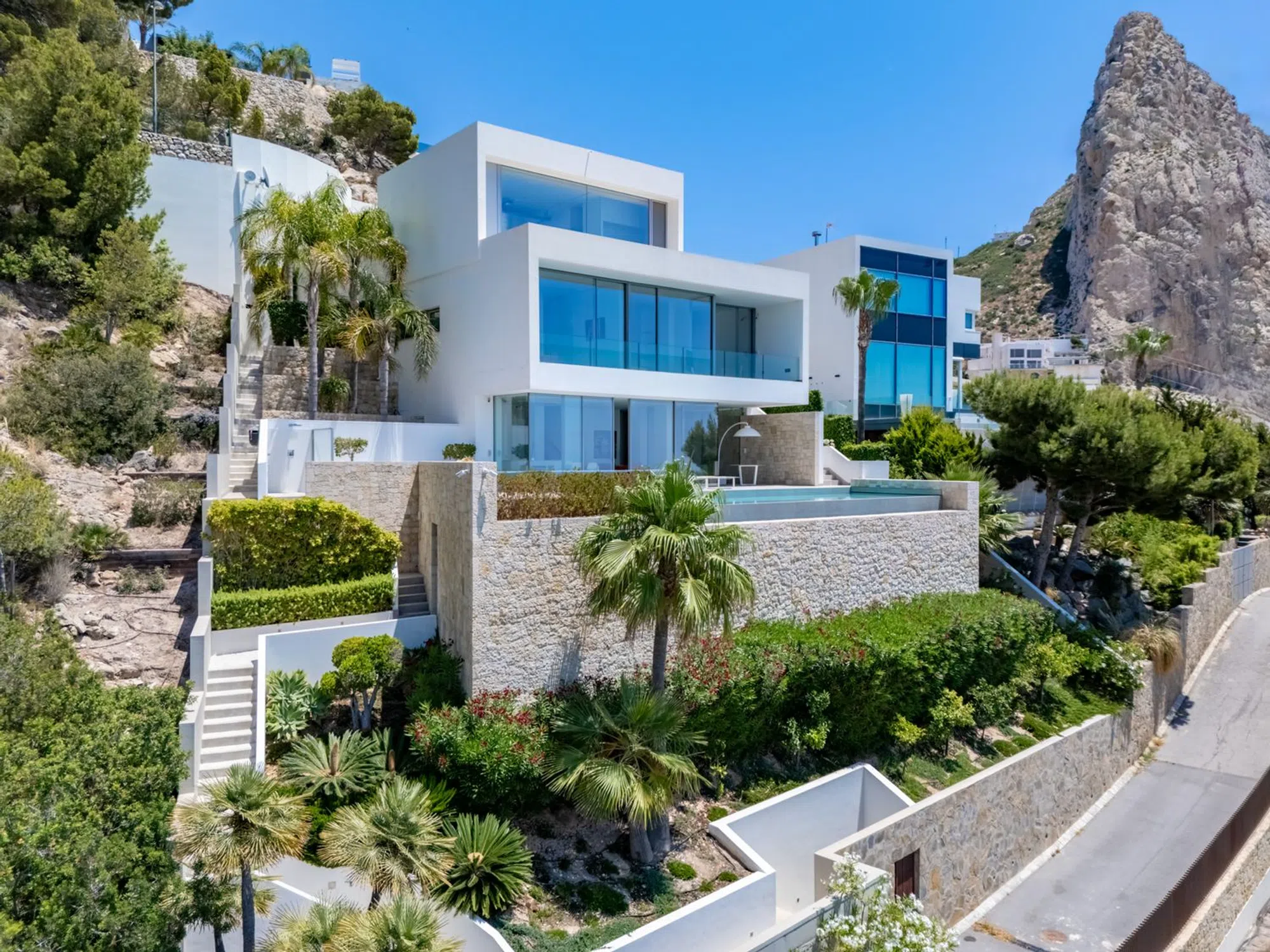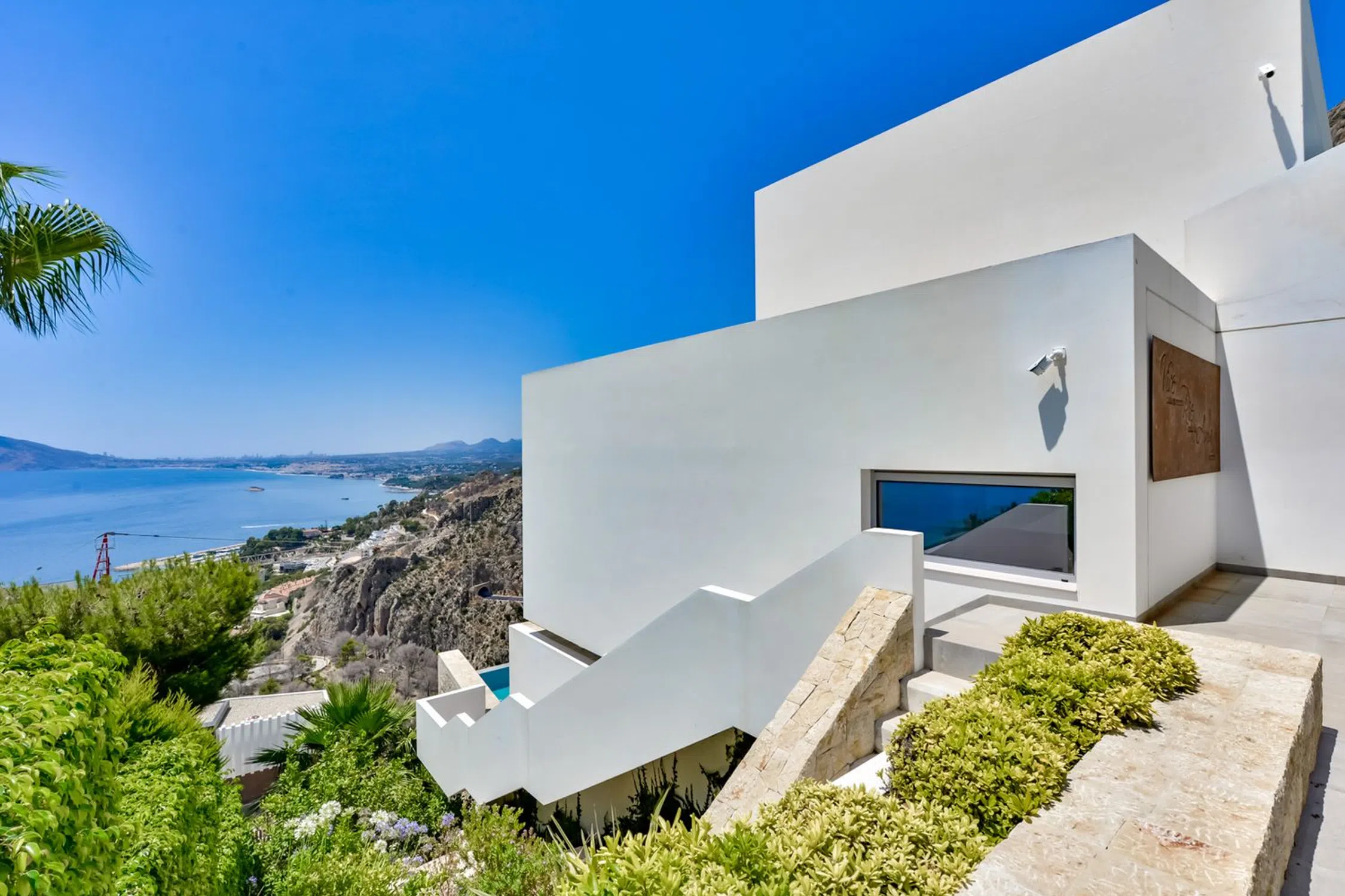 Villa de lujo en Mascarat, Altea, con amplias vistas al mar. Esta exclusiva y moderna villa de lujo, diseñada por el reconocido arquitecto Ramón Gandía Bruel, ofrece impresionantes vistas panorámicas a la bahía de Altea. Desde la colina donde se encuentra la villa, se puede disfrutar de una amplia vista del mar Mediterráneo y, a sus pies, la playa y el puerto deportivo de Campomanus, con restaurantes, centro de motos acuáticas y escuela de vela, a solo 5 minutos en coche. La villa está construida sobre una amplia parcela de 1638 m², que incluye la parcela adyacente, para garantizar su privacidad. La casa tiene una superficie construida de 296 m² y se distribuye en 3 plantas, conectadas por ascensor y escaleras desde la planta superior del aparcamiento. La puerta de entrada automática de esta casa da acceso al garaje para un coche con fantásticas vistas al mar y amplio espacio de almacenamiento. La planta inferior del garaje alberga los tres amplios dormitorios, que dan a la terraza cubierta. El dormitorio principal tiene baño en suite y los otros dos comparten un baño. Techos altos de 3 metros, armarios empotrados y amplios ventanales son característicos de esta casa. Una planta más abajo, se accede al salón, con fantásticas vistas al mar. Aquí se encuentra un espacio que ahora se utiliza como despacho con un baño completo, que podría utilizarse como dormitorio adicional. La lujosa cocina abierta, hecha a medida y con isla de cocción, cuenta con encimera de silestone y está equipada con vaporera, horno, microondas y cafetera Miele, además de una campana extractora de 4 módulos integrada en el techo. Detrás de la cocina se encuentra un práctico lavadero con lavadora, secadora, vinoteca, congelador y frigorífico adicional. También hay un amplio trastero independiente. El diseño de esta elegante villa es ante todo práctico, a petición de los propietarios, residentes en España desde hace años, y los espacios se han aprovechado al máximo para disfrutar de las hermosas vistas al mar desde todas las plantas. Desde el salón se accede a la terraza solárium con piscina infinita climatizada de agua salada de 12 x 3,5 metros, cubierta automática y sistema de limpieza automático. El lugar ideal para relajarse y disfrutar de una ubicación única en la Costa Blanca, con un microclima especial y suave, con 300 días de sol y una temperatura media de 20 grados. Justo debajo de la piscina se encuentra un amplio sótano multifuncional, que puede personalizarse a su gusto. La villa cuenta con tecnología avanzada y está equipada con materiales de alta calidad, como calefacción por suelo radiante, aire acondicionado frío/calor con control individual por habitación, mosquiteras automáticas, sistema de música Sonos, alarma, etc. Toda la casa cuenta con un sistema de aspiración integrado. El precioso jardín cuenta con plantas autóctonas, limoneros y naranjos, y funciona con un sistema de riego automático. En el lateral derecho de la casa (accesible por una escalera exterior) hay una hermosa terraza solárium, ideal para disfrutar de las cálidas tardes de verano o como rincón de desayuno. También dispone de una habitación adicional que puede convertirse en un amplio estudio o en un lavadero. Ubicada a solo 1,2 km de la playa, a 7 km del pintoresco pueblo de Altea y a 5 km del campo de golf de Don Cayo, ofrece fácil acceso al aeropuerto de Alicante (a 71 km) a través de la autopista A7 y la carretera nacional N-332. Una villa especial y de alta calidad en una ubicación única.