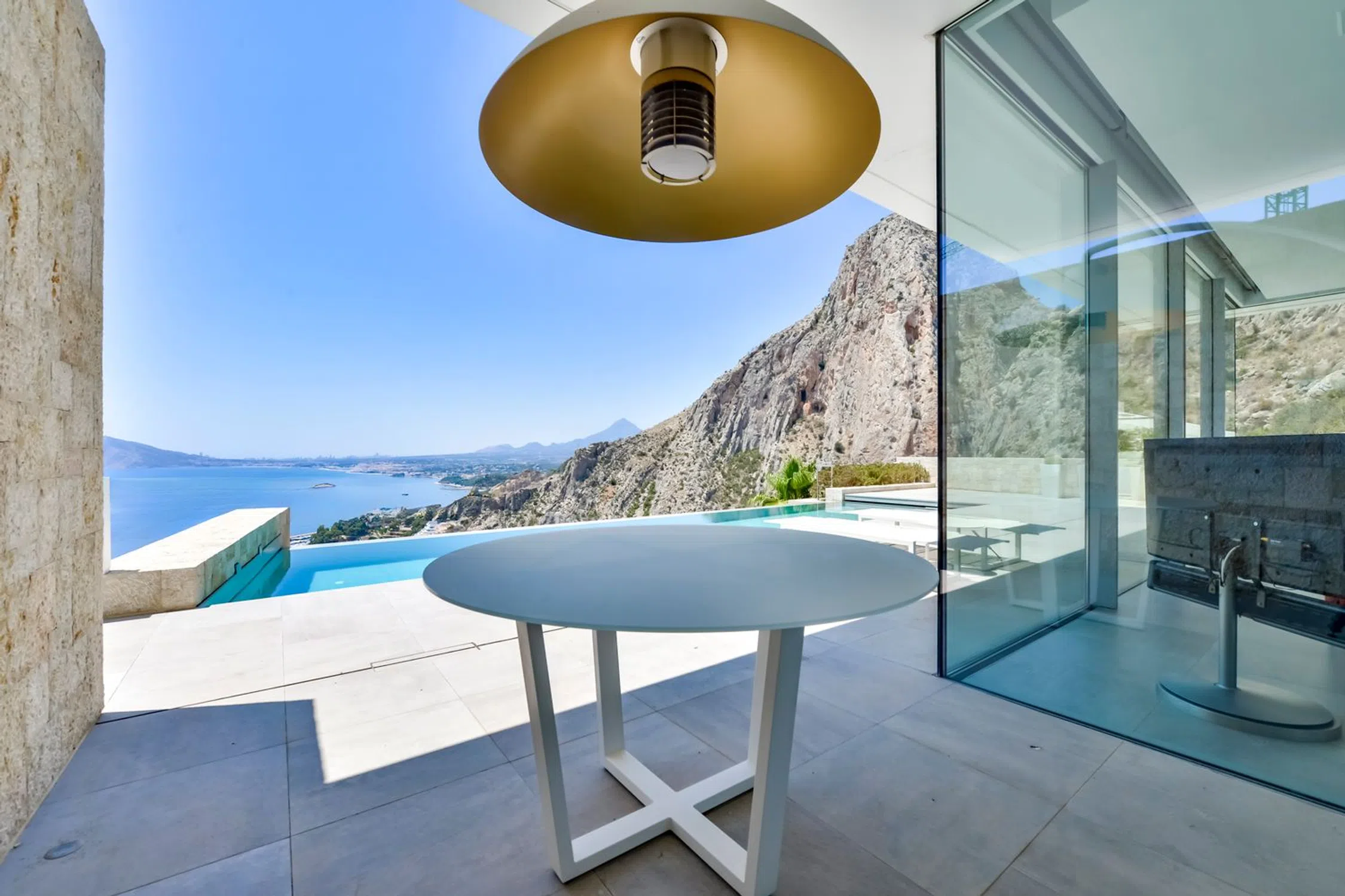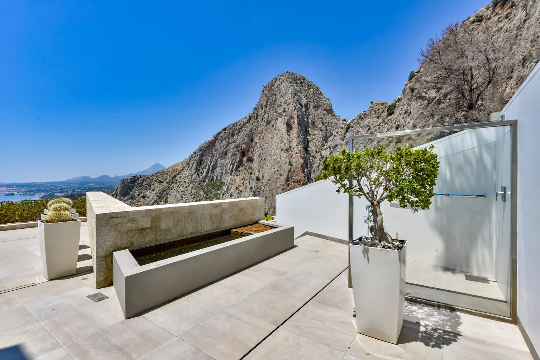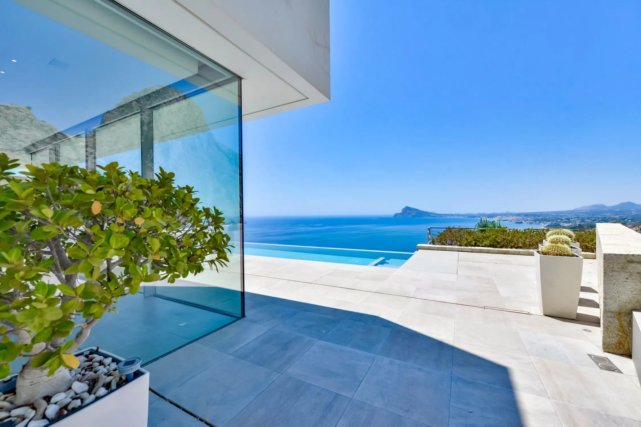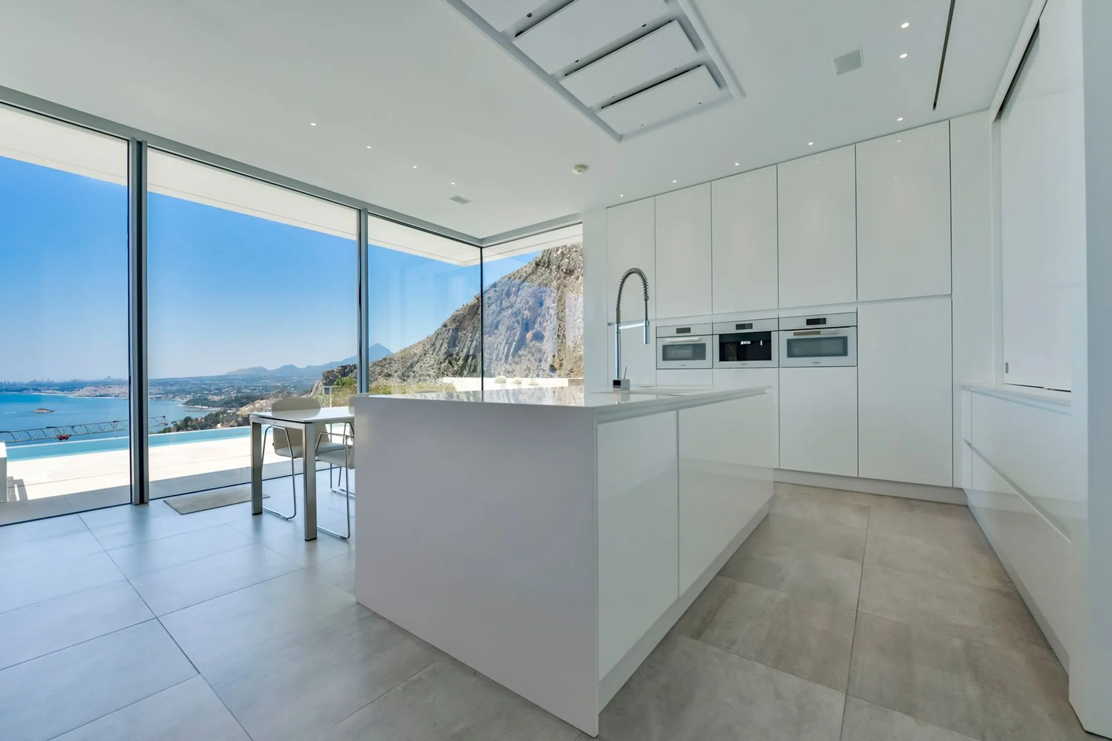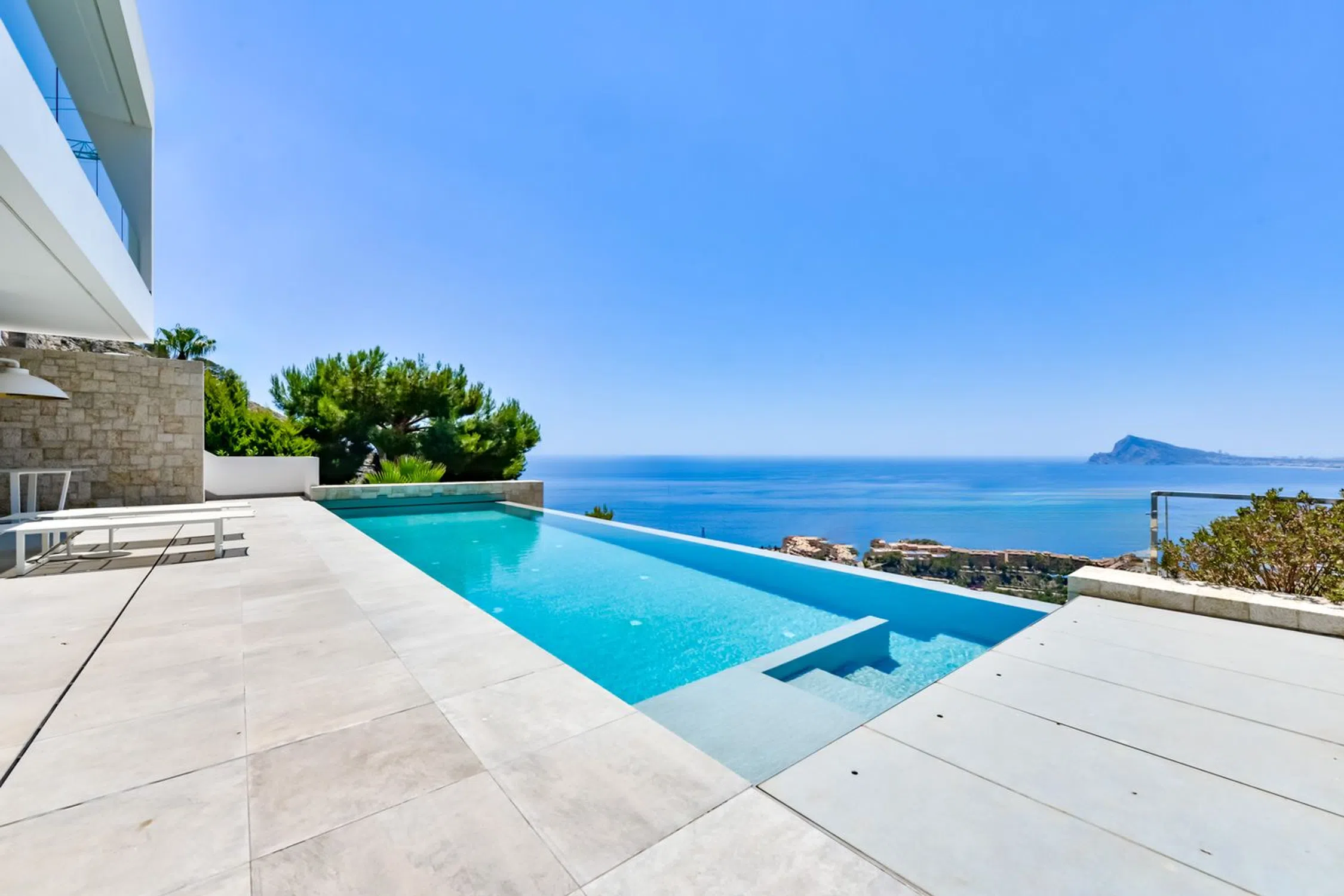 Villa de lujo en Mascarat, Altea, con amplias vistas al mar. Esta exclusiva y moderna villa de lujo, diseñada por el reconocido arquitecto Ramón Gandía Bruel, ofrece impresionantes vistas panorámicas a la bahía de Altea. Desde la colina donde se encuentra la villa, se puede disfrutar de una amplia vista del mar Mediterráneo y, a sus pies, la playa y el puerto deportivo de Campomanus, con restaurantes, centro de motos acuáticas y escuela de vela, a solo 5 minutos en coche. La villa está construida sobre una amplia parcela de 1638 m², que incluye la parcela adyacente, para garantizar su privacidad. La casa tiene una superficie construida de 296 m² y se distribuye en 3 plantas, conectadas por ascensor y escaleras desde la planta superior del aparcamiento. La puerta de entrada automática de esta casa da acceso al garaje para un coche con fantásticas vistas al mar y amplio espacio de almacenamiento. La planta inferior del garaje alberga los tres amplios dormitorios, que dan a la terraza cubierta. El dormitorio principal tiene baño en suite y los otros dos comparten un baño. Techos altos de 3 metros, armarios empotrados y amplios ventanales son característicos de esta casa. Una planta más abajo, se accede al salón, con fantásticas vistas al mar. Aquí se encuentra un espacio que ahora se utiliza como despacho con un baño completo, que podría utilizarse como dormitorio adicional. La lujosa cocina abierta, hecha a medida y con isla de cocción, cuenta con encimera de silestone y está equipada con vaporera, horno, microondas y cafetera Miele, además de una campana extractora de 4 módulos integrada en el techo. Detrás de la cocina se encuentra un práctico lavadero con lavadora, secadora, vinoteca, congelador y frigorífico adicional. También hay un amplio trastero independiente. El diseño de esta elegante villa es ante todo práctico, a petición de los propietarios, residentes en España desde hace años, y los espacios se han aprovechado al máximo para disfrutar de las hermosas vistas al mar desde todas las plantas. Desde el salón se accede a la terraza solárium con piscina infinita climatizada de agua salada de 12 x 3,5 metros, cubierta automática y sistema de limpieza automático. El lugar ideal para relajarse y disfrutar de una ubicación única en la Costa Blanca, con un microclima especial y suave, con 300 días de sol y una temperatura media de 20 grados. Justo debajo de la piscina se encuentra un amplio sótano multifuncional, que puede personalizarse a su gusto. La villa cuenta con tecnología avanzada y está equipada con materiales de alta calidad, como calefacción por suelo radiante, aire acondicionado frío/calor con control individual por habitación, mosquiteras automáticas, sistema de música Sonos, alarma, etc. Toda la casa cuenta con un sistema de aspiración integrado. El precioso jardín cuenta con plantas autóctonas, limoneros y naranjos, y funciona con un sistema de riego automático. En el lateral derecho de la casa (accesible por una escalera exterior) hay una hermosa terraza solárium, ideal para disfrutar de las cálidas tardes de verano o como rincón de desayuno. También dispone de una habitación adicional que puede convertirse en un amplio estudio o en un lavadero. Ubicada a solo 1,2 km de la playa, a 7 km del pintoresco pueblo de Altea y a 5 km del campo de golf de Don Cayo, ofrece fácil acceso al aeropuerto de Alicante (a 71 km) a través de la autopista A7 y la carretera nacional N-332. Una villa especial y de alta calidad en una ubicación única.