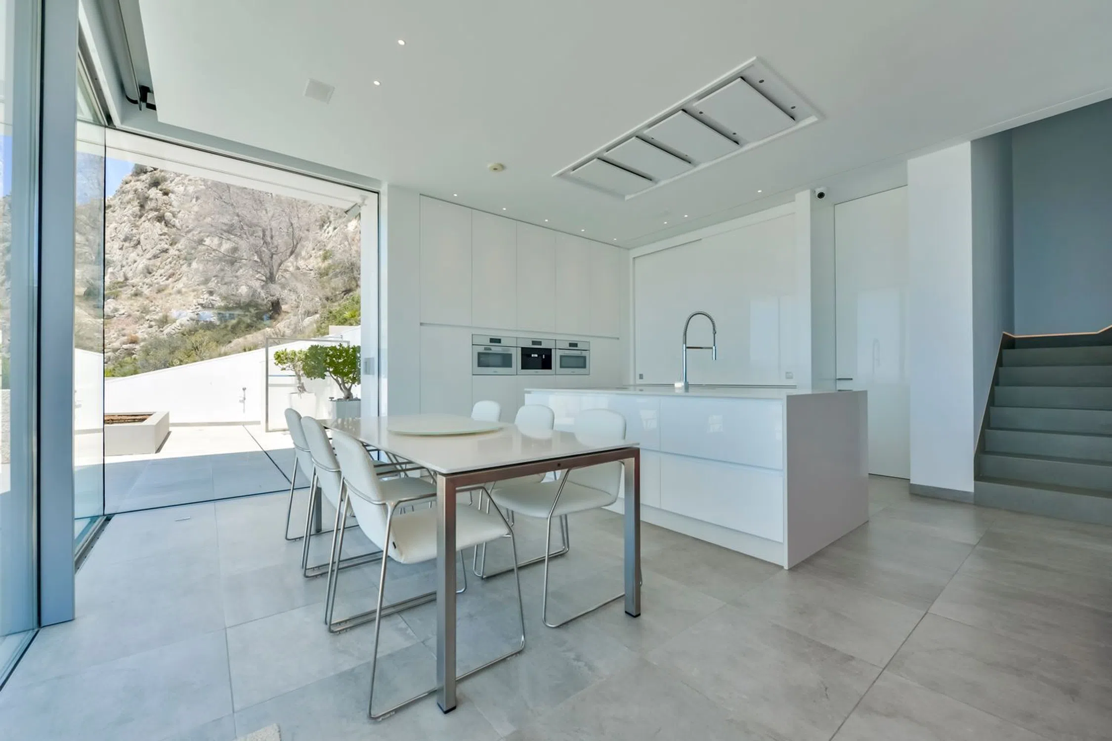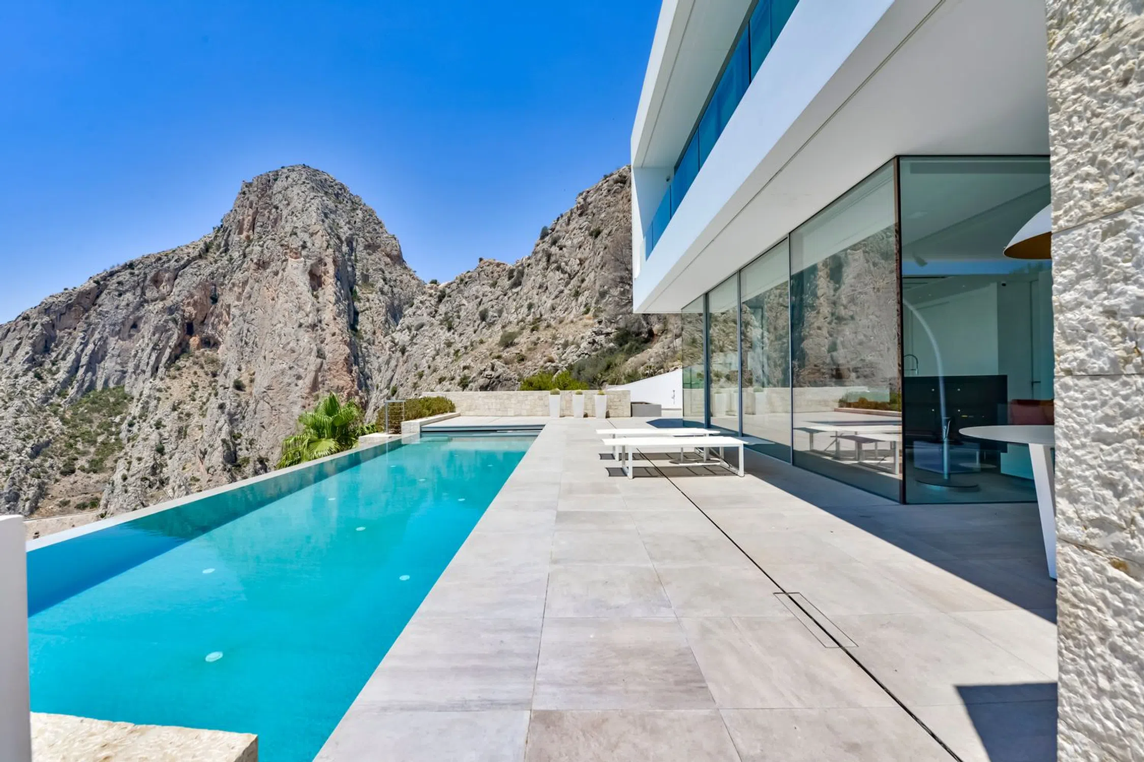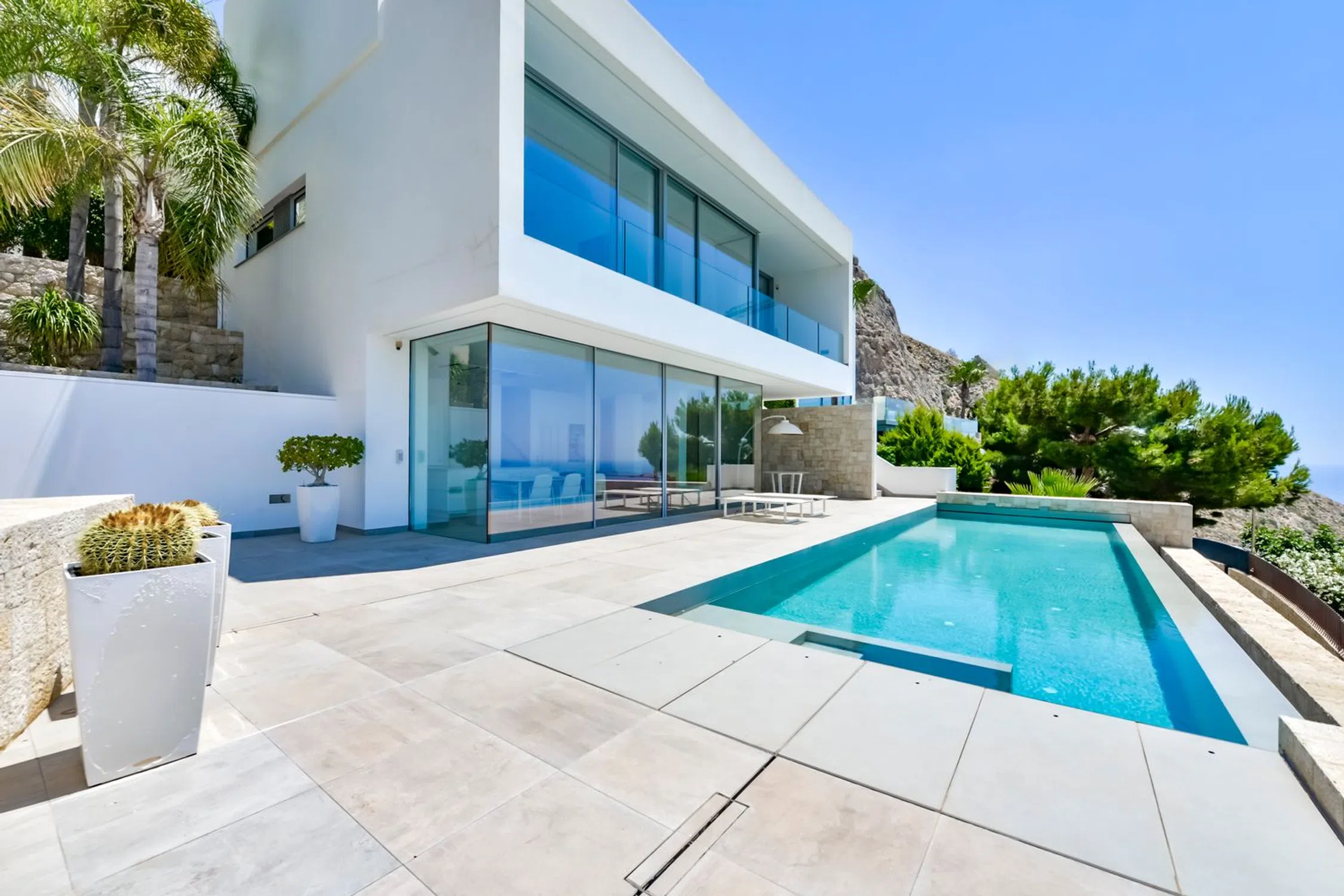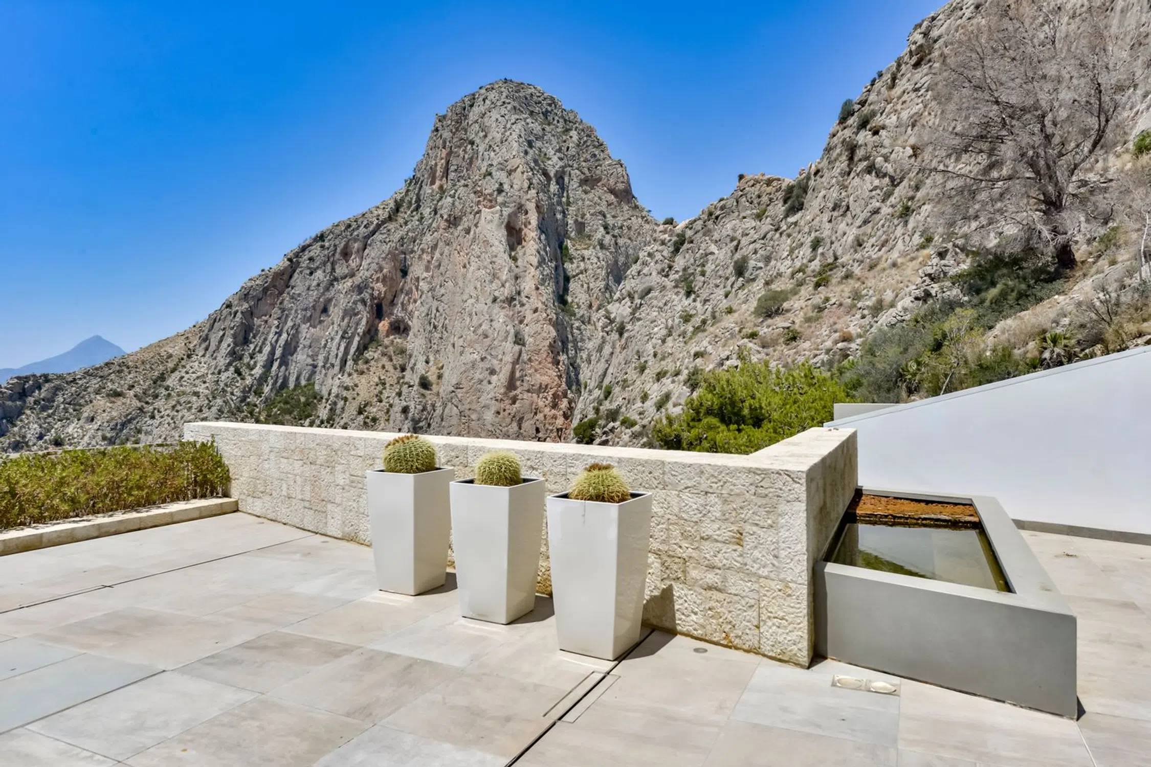 Villa de lujo en Mascarat, Altea, con amplias vistas al mar. Esta exclusiva y moderna villa de lujo, diseñada por el reconocido arquitecto Ramón Gandía Bruel, ofrece impresionantes vistas panorámicas a la bahía de Altea. Desde la colina donde se encuentra la villa, se puede disfrutar de una amplia vista del mar Mediterráneo y, a sus pies, la playa y el puerto deportivo de Campomanus, con restaurantes, centro de motos acuáticas y escuela de vela, a solo 5 minutos en coche. La villa está construida sobre una amplia parcela de 1638 m², que incluye la parcela adyacente, para garantizar su privacidad. La casa tiene una superficie construida de 296 m² y se distribuye en 3 plantas, conectadas por ascensor y escaleras desde la planta superior del aparcamiento. La puerta de entrada automática de esta casa da acceso al garaje para un coche con fantásticas vistas al mar y amplio espacio de almacenamiento. La planta inferior del garaje alberga los tres amplios dormitorios, que dan a la terraza cubierta. El dormitorio principal tiene baño en suite y los otros dos comparten un baño. Techos altos de 3 metros, armarios empotrados y amplios ventanales son característicos de esta casa. Una planta más abajo, se accede al salón, con fantásticas vistas al mar. Aquí se encuentra un espacio que ahora se utiliza como despacho con un baño completo, que podría utilizarse como dormitorio adicional. La lujosa cocina abierta, hecha a medida y con isla de cocción, cuenta con encimera de silestone y está equipada con vaporera, horno, microondas y cafetera Miele, además de una campana extractora de 4 módulos integrada en el techo. Detrás de la cocina se encuentra un práctico lavadero con lavadora, secadora, vinoteca, congelador y frigorífico adicional. También hay un amplio trastero independiente. El diseño de esta elegante villa es ante todo práctico, a petición de los propietarios, residentes en España desde hace años, y los espacios se han aprovechado al máximo para disfrutar de las hermosas vistas al mar desde todas las plantas. Desde el salón se accede a la terraza solárium con piscina infinita climatizada de agua salada de 12 x 3,5 metros, cubierta automática y sistema de limpieza automático. El lugar ideal para relajarse y disfrutar de una ubicación única en la Costa Blanca, con un microclima especial y suave, con 300 días de sol y una temperatura media de 20 grados. Justo debajo de la piscina se encuentra un amplio sótano multifuncional, que puede personalizarse a su gusto. La villa cuenta con tecnología avanzada y está equipada con materiales de alta calidad, como calefacción por suelo radiante, aire acondicionado frío/calor con control individual por habitación, mosquiteras automáticas, sistema de música Sonos, alarma, etc. Toda la casa cuenta con un sistema de aspiración integrado. El precioso jardín cuenta con plantas autóctonas, limoneros y naranjos, y funciona con un sistema de riego automático. En el lateral derecho de la casa (accesible por una escalera exterior) hay una hermosa terraza solárium, ideal para disfrutar de las cálidas tardes de verano o como rincón de desayuno. También dispone de una habitación adicional que puede convertirse en un amplio estudio o en un lavadero. Ubicada a solo 1,2 km de la playa, a 7 km del pintoresco pueblo de Altea y a 5 km del campo de golf de Don Cayo, ofrece fácil acceso al aeropuerto de Alicante (a 71 km) a través de la autopista A7 y la carretera nacional N-332. Una villa especial y de alta calidad en una ubicación única.