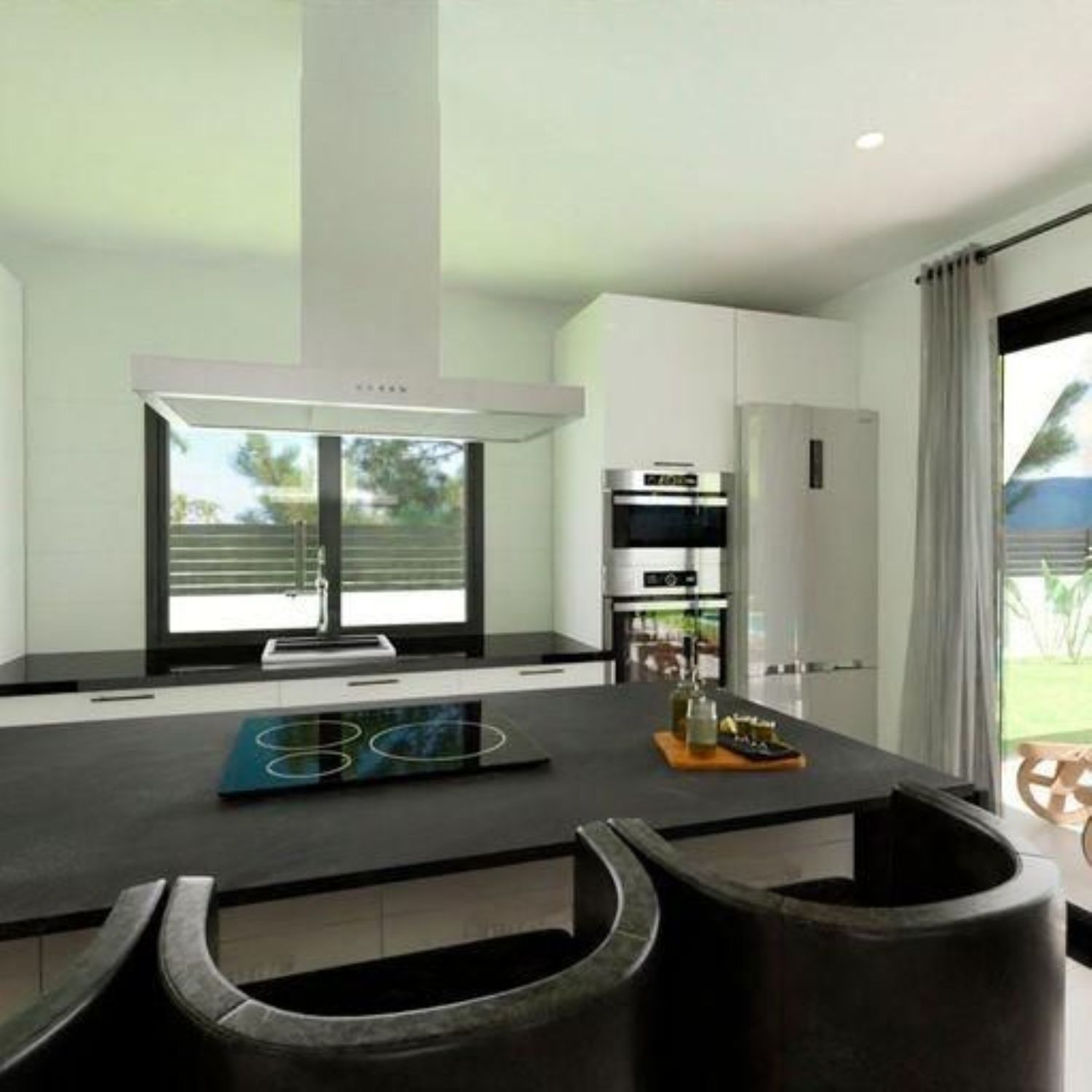 Wnętrze domu zostało podzielone na dwie główne strefy. W strefie dziennej znajduje się przestronny salon z jadalnią oraz otwartą kuchnią, która łączy się z dużym nowoczesnym tarasem za pośrednictwem dużych okien, prowadzących do strefy ogrodowej, a także do potencjalnego basenu. Jasność wypełnia każdy kąt dzięki dużym przeszkleniom, które otwierają przestrzeń na świeżym powietrzu. Wyobraź sobie spędzanie popołudni z rodziną i przyjaciółmi w spokojnym, naturalnym otoczeniu. Dodatkowo, w przestrzeni zostało zaaranżowane miejsce na pralnię, które jest łatwo dostępne z każdego punktu domu.
