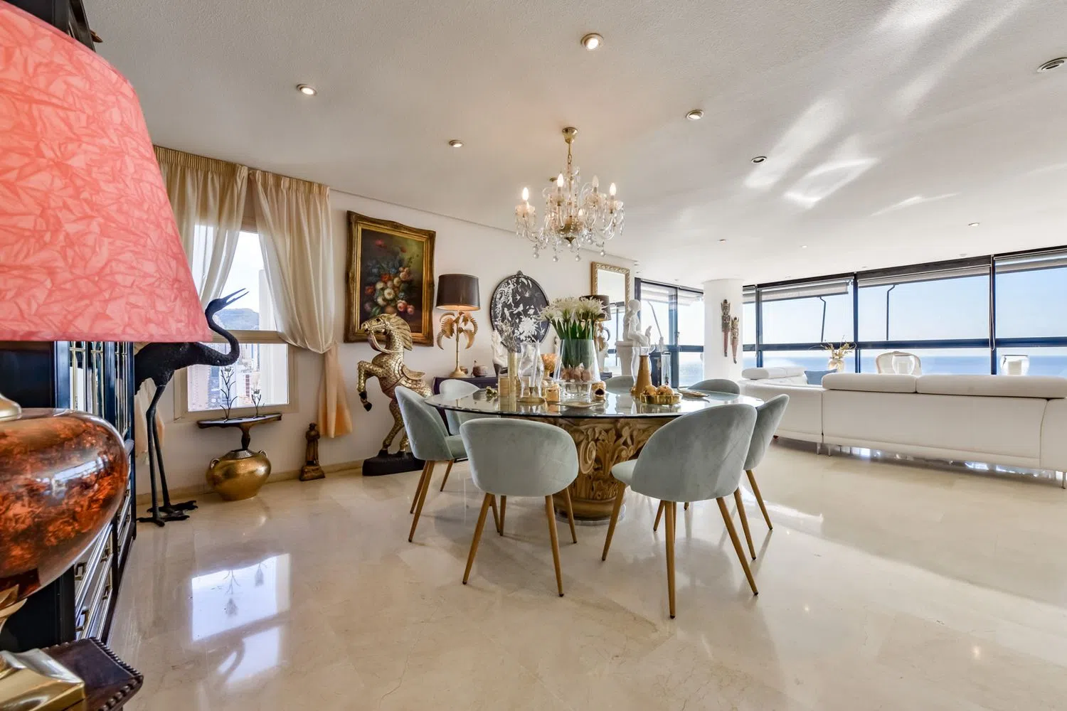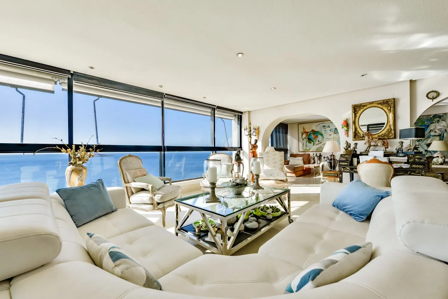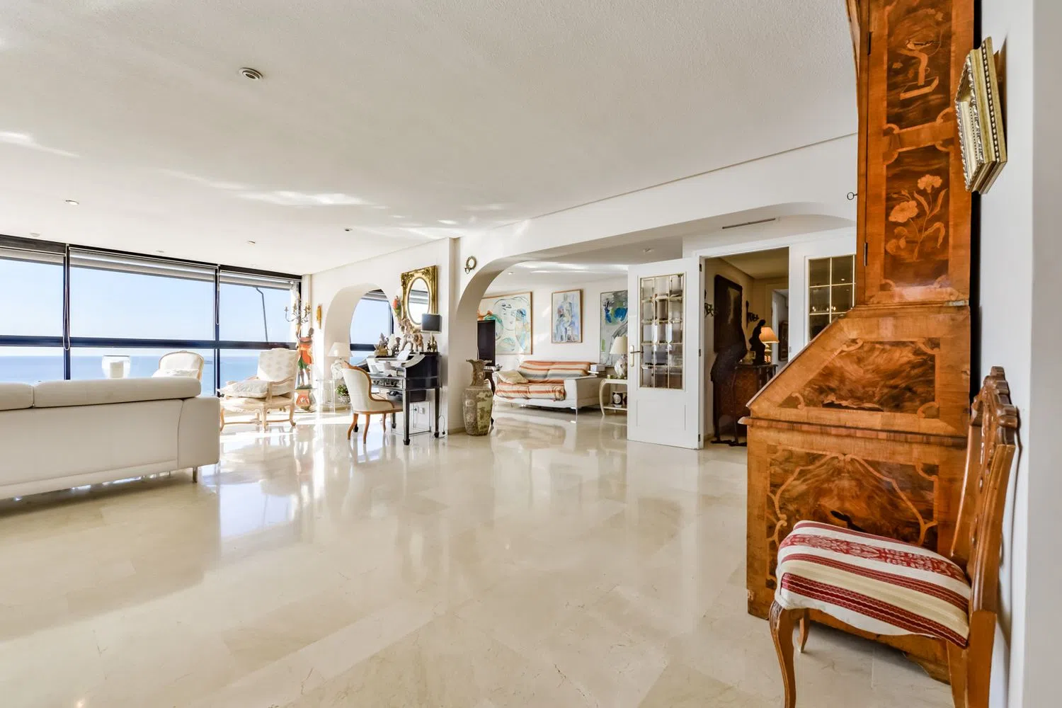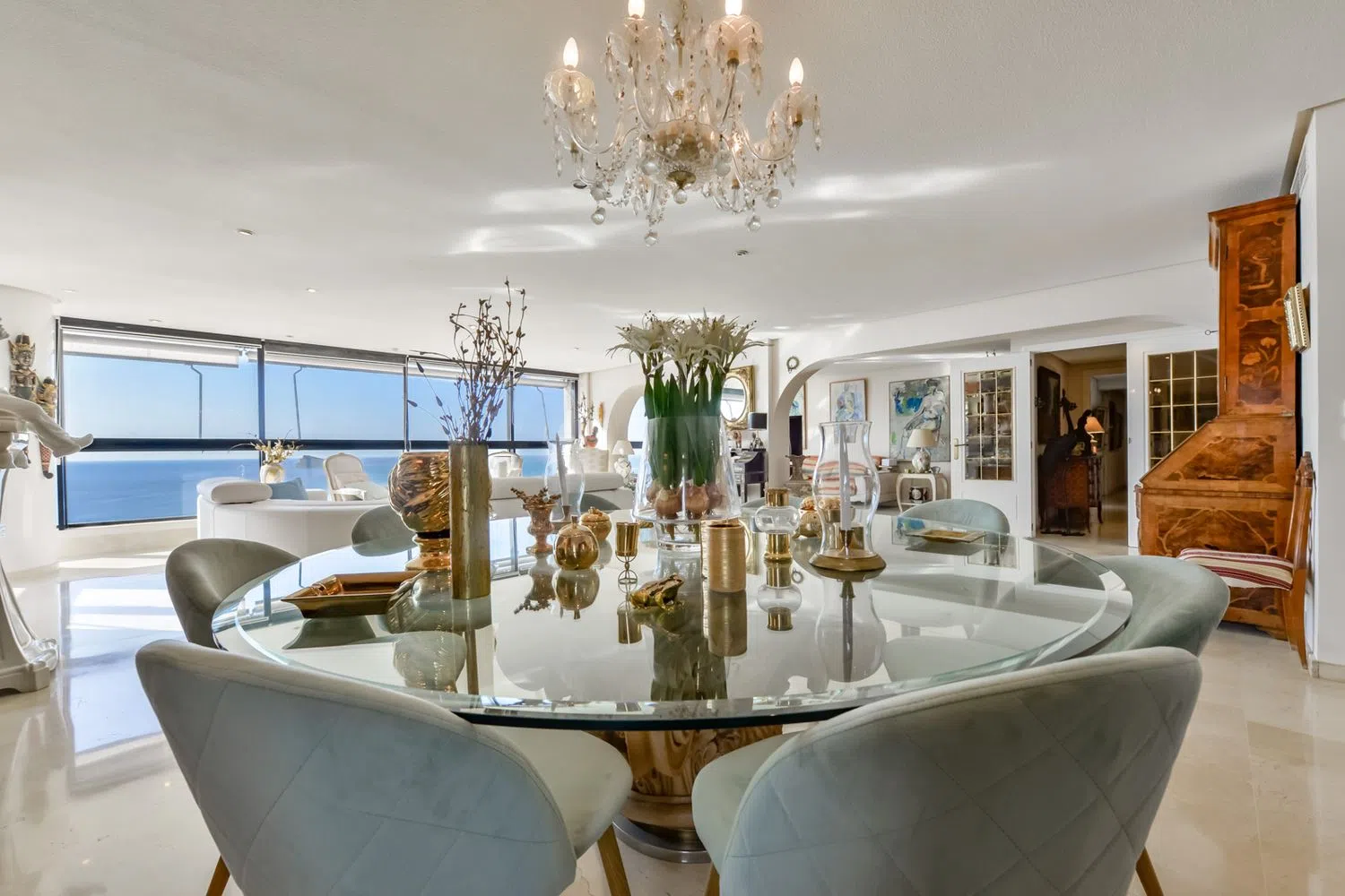 Rozkład mieszkania jest niezwykle przestronny i elegancki, z gustownie urządzonym salonem i jadalnią, w których duże okna od podłogi do sufitu wpuszczają naturalne światło i oferują nieprzerwane widoki na morze. W pełni wyposażona, niezależna kuchnia, 7 sypialni oraz 5 łazienek (w tym trzy z prywatnymi łazienkami) tworzą atmosferę komfortu i intymności. To idealne miejsce do życia w bliskości Morza Śródziemnego.