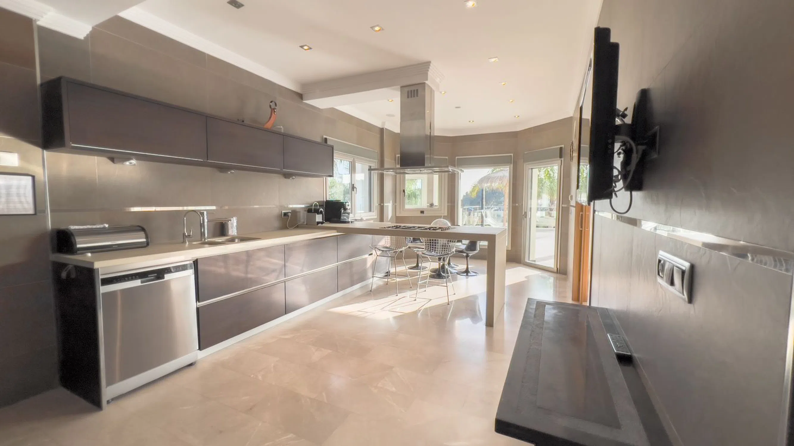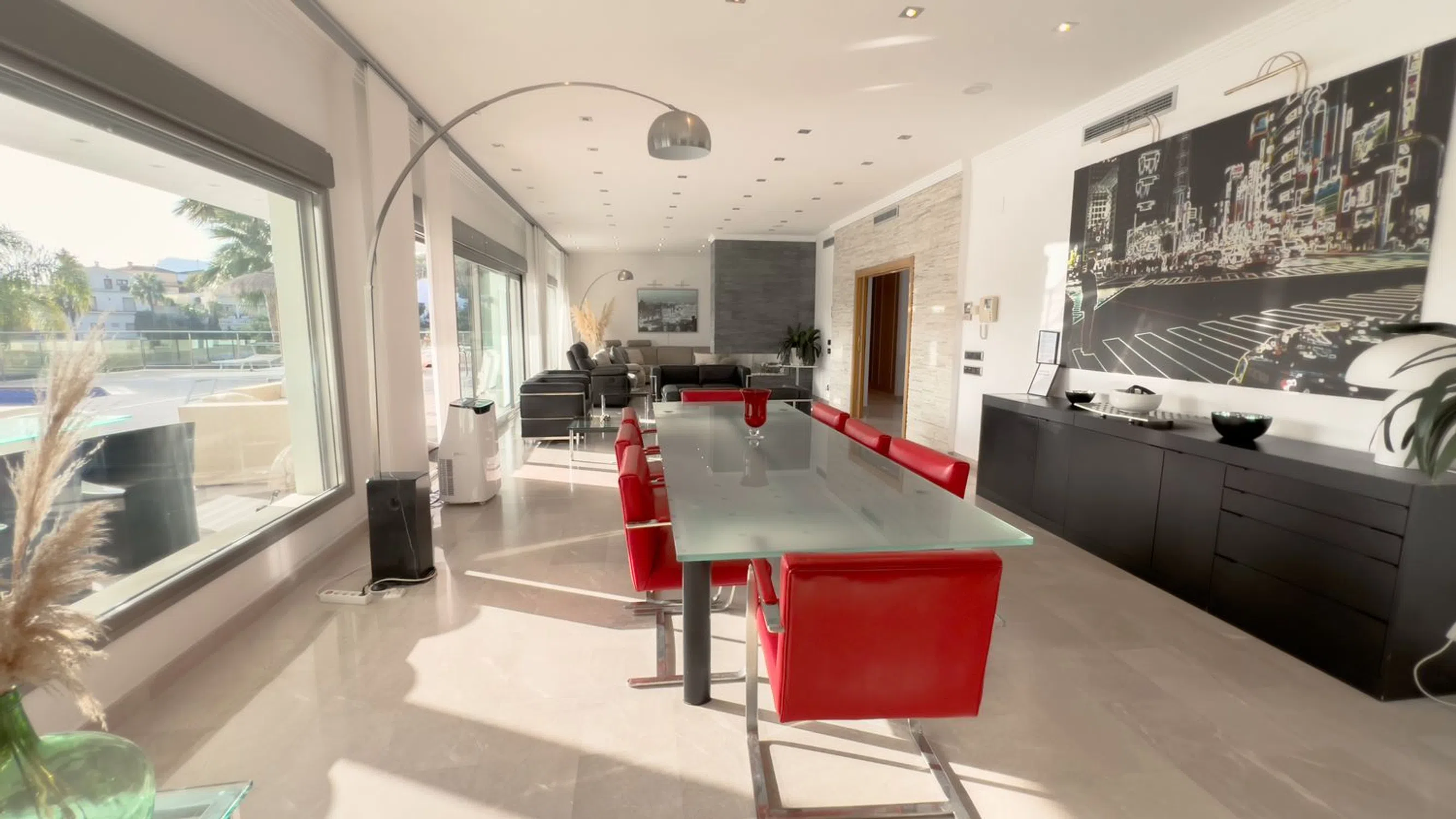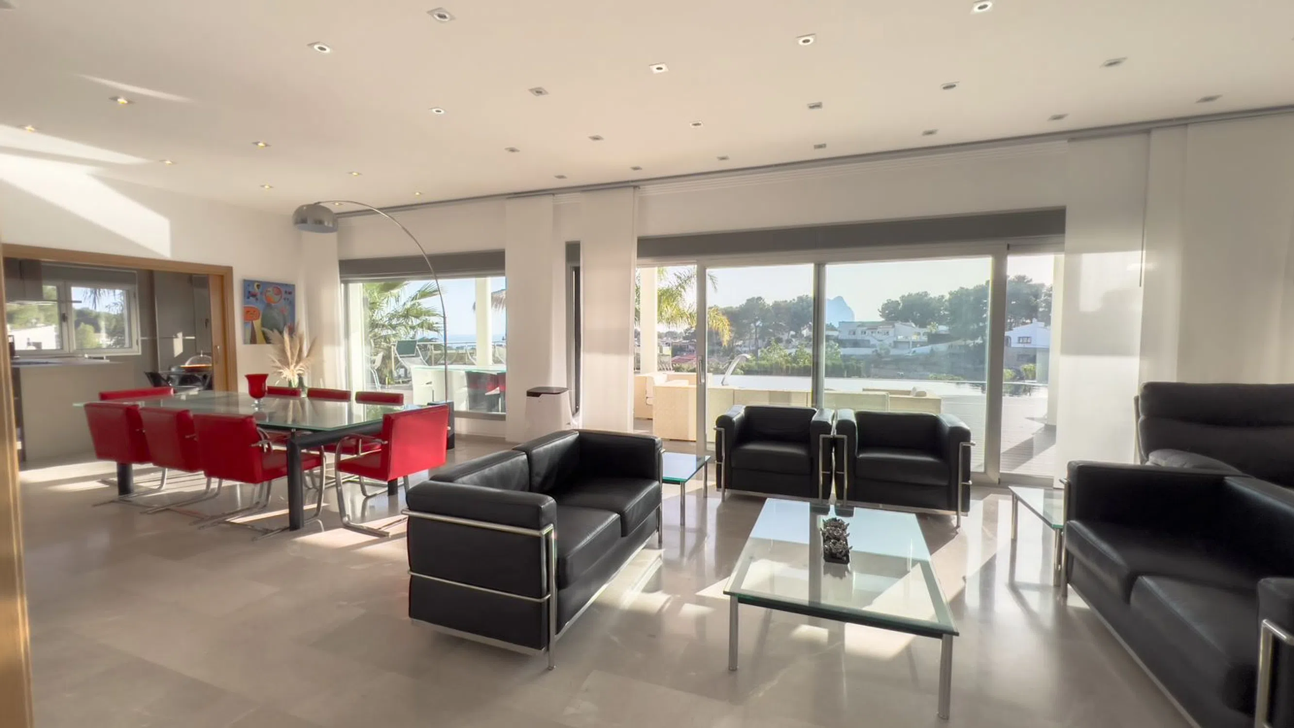 Moderna, espaciosa y lujosa mansión con vistas al mar y spa en Benissa Ubicada en la prestigiosa urbanización La Fustera, a solo 10 minutos de Calpe y 15 minutos de Moraira, esta impresionante mansión ofrece lo último en confort y lujo. Principales características: Vistas al Mar y Privacidad: Vistas panorámicas del mar Mediterráneo desde varias áreas de la propiedad. Amplios Espacios Habitables: Entrada principal con una majestuosa escalera imperial y elegantes suelos de mármol en toda la casa. Espacios Abiertos: Gran salón con tres zonas distintas: comedor formal, sala de estar y acogedora sala de TV con chimenea de gas. Oasis al Aire Libre: Amplia terraza con áreas para comer y relajarse, cocina al aire libre, piscina con jacuzzi y cascada. Instalaciones de Bienestar: Spa totalmente equipado con gimnasio, sauna, piscina cubierta y jacuzzi, ideal para relajarse durante todo el año. Listo para Entretenimiento: Elegante área de bar perfecta para reuniones o disfrutar de una copa con amigos. Apartamento Privado: Apartamento independiente con entrada propia, ideal para invitados, familia o personal. Dormitorios de Lujo: Cuatro amplios dormitorios, todos con baño en suite; el principal incluye vestidor, terraza privada y bañera. Oficina en Casa: Espacio dedicado para trabajar desde casa, con una gran terraza y vistas impresionantes. Esta mansión está diseñada para vivir todo el año y se encuentra a solo 1,5 km de la playa de La Fustera. Para obtener más información o programar una visita, contáctenos hoy mismo. ¡No pierda la oportunidad de hacer suya esta extraordinaria propiedad!