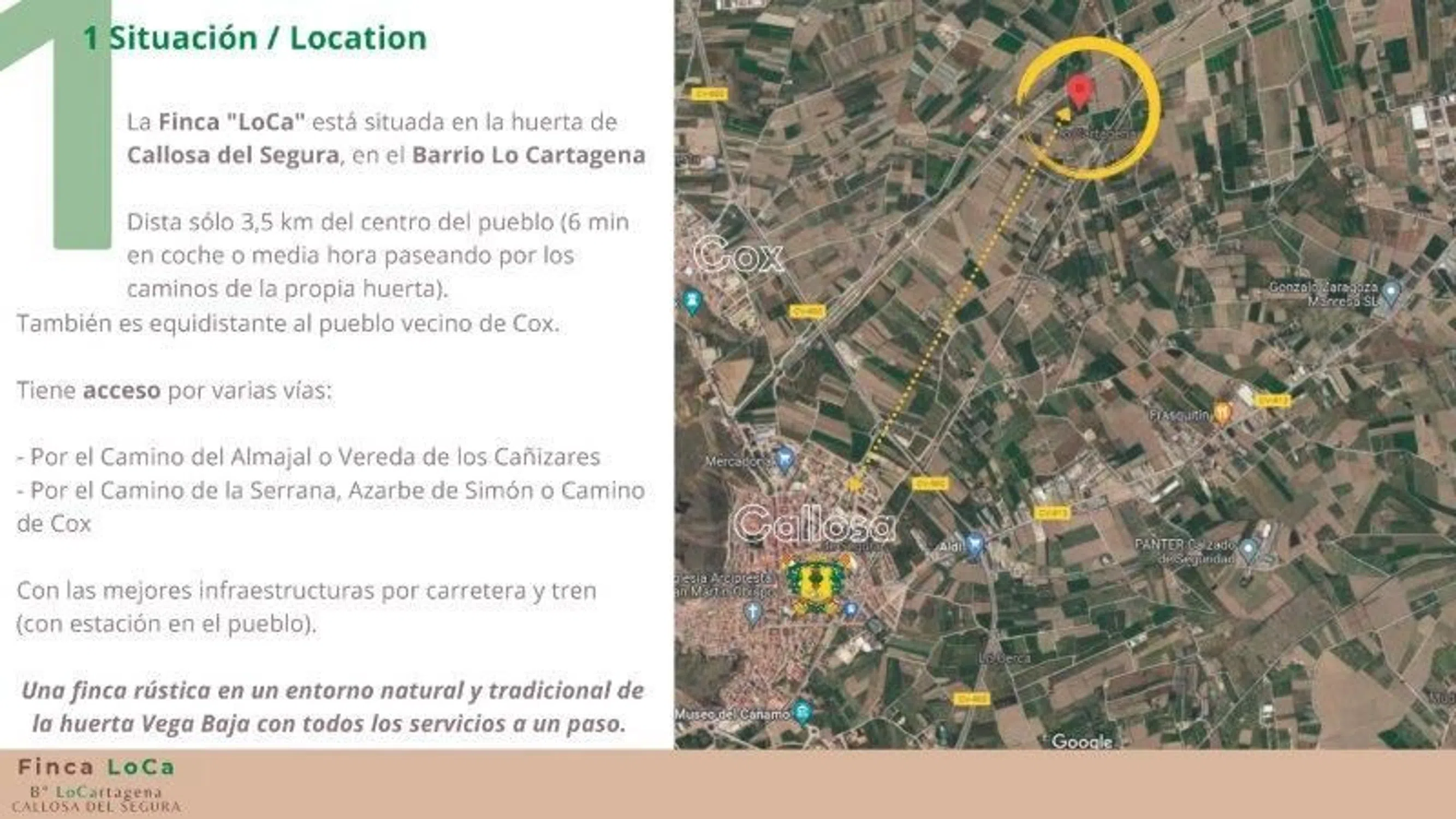 Finca rústica de 46.816 m2 (el mínimo para construir una vivienda legal es de 10.000 m2) con casa para reformar y dotación de agua más que suficiente para regarla toda. Situada a 3 km del centro de Callosa de Segura y de Cox, con todos los servicios. Finca de recreo, para vivir y o pasar temporadas Explotación agrícola. Con dotación de agua para plantar los cultivos típicos de la huerta: cítricos, hortalizas, verduras... Se podría ampliar la superficie construida porque se permite una edificabilidad del 2% del suelo (casi 1000 m2) en dos alturas, planta baja y primera y sólo hay 100 m2 en la casa existente. A unos minutos de montaña de Callosa, con rutas de senderismo, trekking, su vía ferrata, etc. También cerca del centro histórico monumental de la ciudad de Orihuela. A 25 minutos de la playas (Guardamar, La Mata, Orihuela Costa) Costa Blanca. Tiene 2 accesos con coche y está cerca de otras casas. Excelente vistas a la montaña y al paisaje de huerta de la Vega Baja. Distancia aeropuerto de Alicante 40 km.
