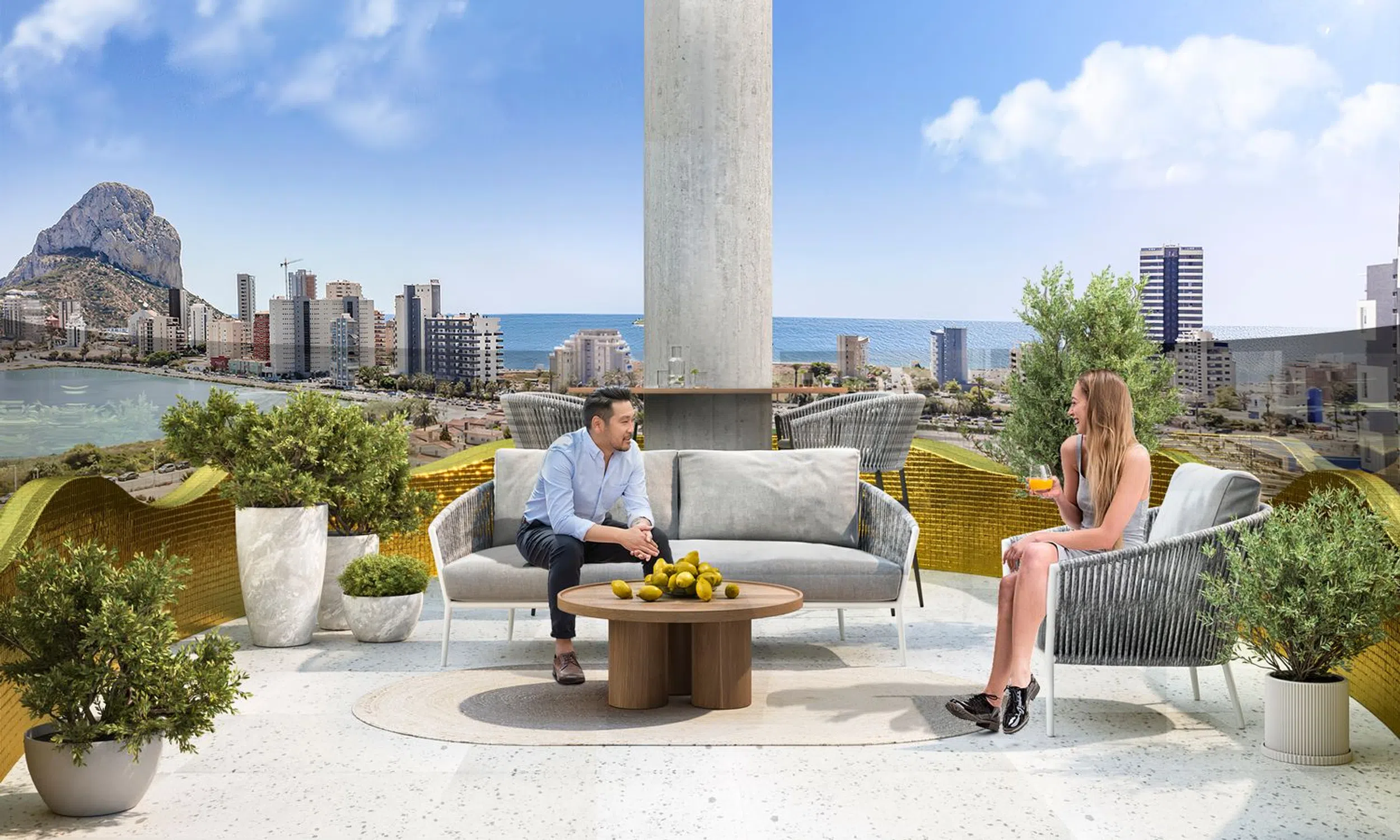 ¡Últimas viviendas a la venta! Cada vivienda tiene una gran terraza, una mirada circular a todo lo mejor de Calpe: la playa del Arenal, la playa de la Fossa, la laguna de Las Salinas, y por supuesto el Peñón de Ifach. Cada mañana, cada tarde, … vivir integrado en el cielo de Calpe… Tiene piscina, pádel, gimnasio, zona de calistenia y juegos infantiles en unas espaciosas zonas comunes. Y su excepcional estética brilla desde un eje, un tronco, con aplacado cerámico en texturas blancas y doradas, marmóreas. Del cual brotan, como hojas, unas terrazas esmaltadas en un impactante dorado luminoso y valiente. ¡Tu Casa, Tu Vida! Oficina de ventas (y piso piloto) situada en Finestrat, C/ Bolivia 2. Abierta de lunes a viernes de 10 a 14h y de 16 a 19h y los sábados de 10 a 14h.