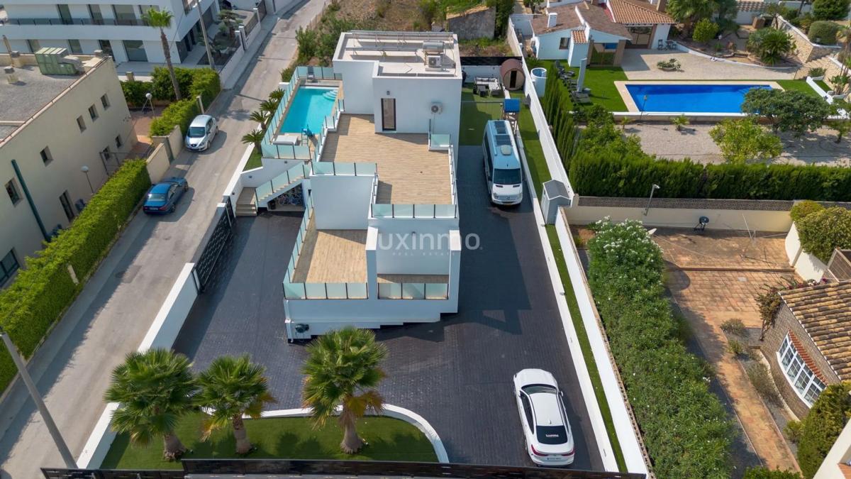 Descubra la mezcla perfecta de lujo, confort y comodidad en esta impresionante casa unifamiliar de 4 dormitorios en venta en la codiciada zona de Calpe. Esta propiedad cuenta con un impresionante 261m2 de espacio habitable útil, una generosa parcela de 835m2, y una superficie total construida de 421m2. Esta moderna casa ofrece impresionantes vistas a la ciudad y está lista para que usted se mude y disfrute. CARACTERÍSTICAS Y EQUIPAMIENTOS: Disfrute de una serie de características de primera clase y el equipo que esta propiedad tiene para ofrecer, incluyendo una amplia terraza, balcón, aparcamiento privado, y cuatro garajes privados para todas sus necesidades de vehículos y almacenamiento. La cocina americana se completa con electrodomésticos de alta calidad, mientras que el lavadero independiente proporciona mayor comodidad. El sótano de la casa ofrece un amplio espacio de almacenamiento o se puede transformar en una zona de ocio. La propiedad también cuenta con un solarium, zona de barbacoa, vestidor y un jardín privado, perfecto para relajarse y entretenerse al aire libre. Manténgase cómodo todo el año con aire acondicionado y calefacción por split, y disfrute de la comodidad de armarios empotrados y un sistema de domótica de última generación. La propiedad también cuenta con paneles solares, ayudando a reducir sus costos de energía. La piscina privada, el jacuzzi y la sauna ofrecen lo último en relajación, mientras que el sistema de alarma, la seguridad 24 horas, la puerta blindada, las persianas eléctricas y el doble acristalamiento proporcionan tranquilidad y seguridad para usted y su familia. ZONA: Situado en la pintoresca localidad de Calpe, esta propiedad ofrece fácil acceso a una variedad de servicios, incluyendo tiendas, restaurantes e instalaciones recreativas. La playa más cercana, Playa del Arenal-Bol, está a sólo 2,5 km, perfecta para pasar un día de relax junto al mar. Además, el aeropuerto de Alicante está aproximadamente a 79 km de la propiedad, asegurando opciones de viaje convenientes para usted y sus invitados. No se pierda esta increíble oportunidad de poseer un lujoso chalet de 4 dormitorios en el corazón de Calpe. Póngase en contacto con nosotros hoy mismo para programar una visita o para obtener más información asobre esta propiedad excepcional.