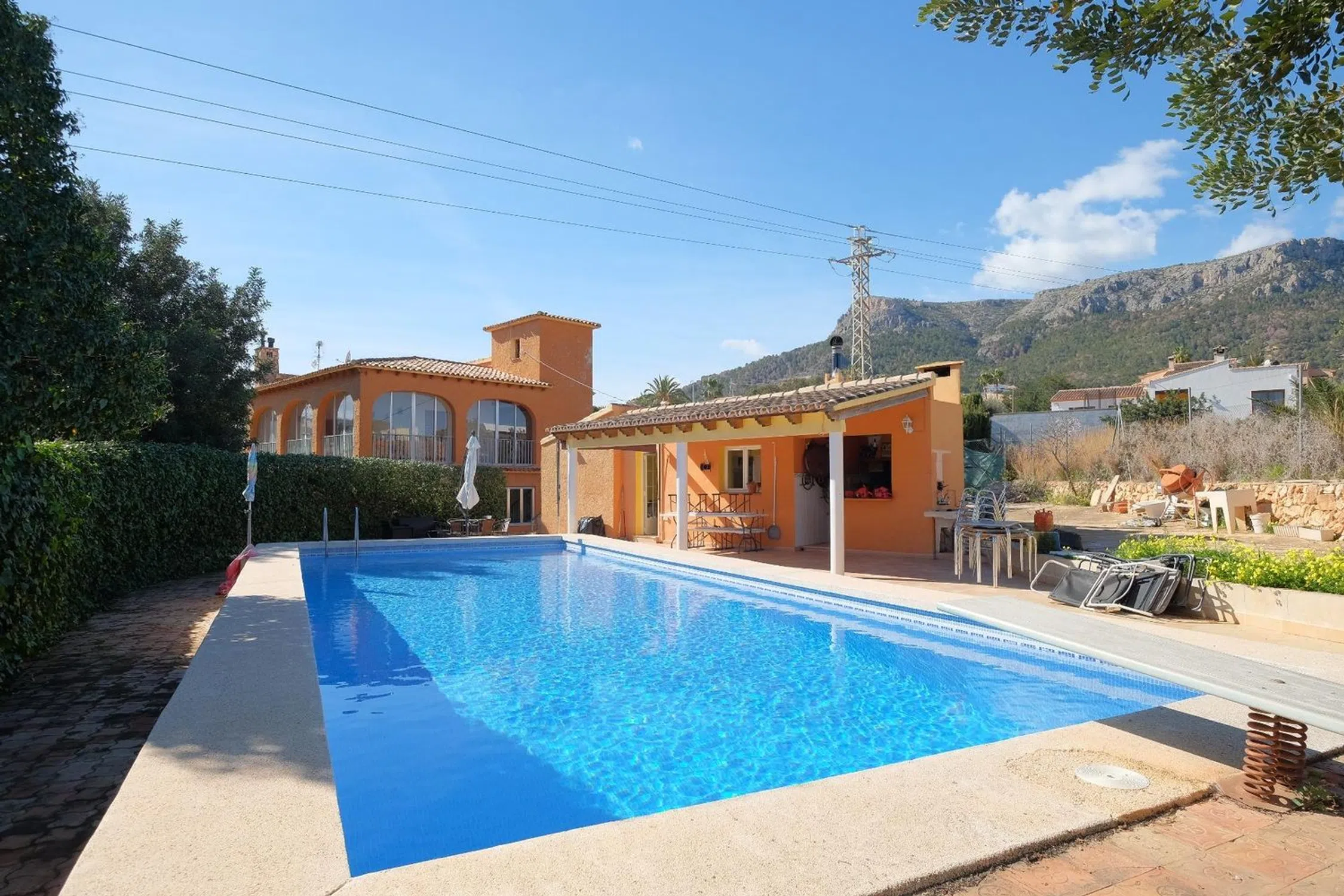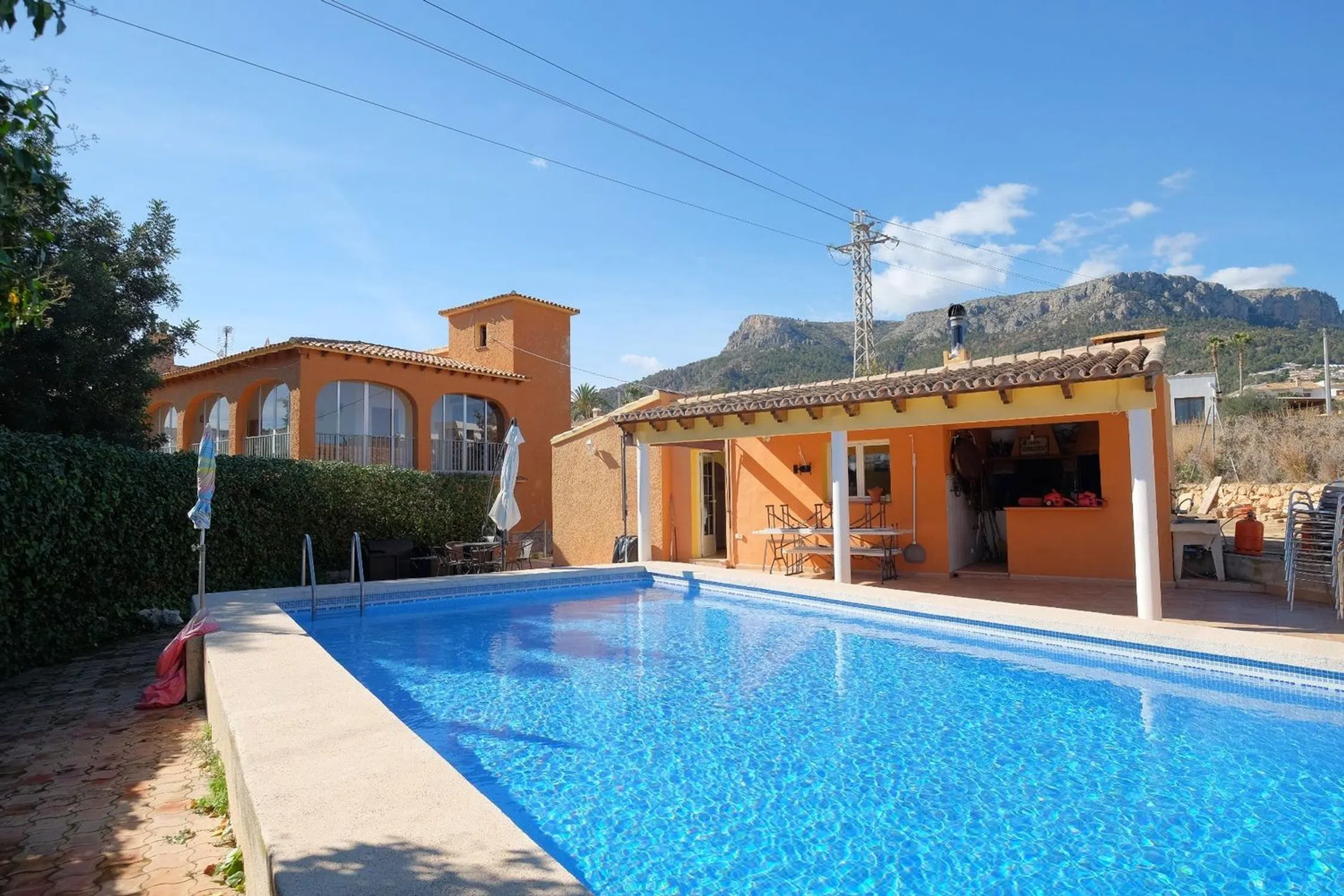 Villa de 426m2 con amplia parcela de 2.752m2 cerca del centro de Calpe. Esta espectacular villa tiene muchas posibilidades: es ideal para alojar a una gran familia, dedicarla a alquiler turístico o incluso convertirla en un encantador hotel. Su ubicación es magnífica, a solo 500 metros del centro de Calpe y a 1,5km de las playas; los supermercados y colegios están a menos de 1km, por lo que se puede acceder a ellos andando sin problema, no encontrará una casa tan amplia y cercana de todos los servicios en Calpe. Actualmente la villa tiene está separada en dos construcciones, una casa principal con 391m2 y un apartamento de invitados junto a la piscina con una superficie de 35m2. La distribución de la vivienda principal consta de dos plantas independientes con idéntica distribución: Amplio salón-comedor con chimenea, 4 dormitorios dobles, 2 cuartos de baño, cocina independiente y una gran terraza acristalada con una superficie aproximada de 40m2. En la planta baja se han reformado tanto la cocina como uno de los cuartos de baño. En la planta alta hay un solarium con mucha privacidad y que cuenta con unas destacadas vistas al Peñón de Ifach y las montañas que rodean a Calpe. La distribución del apartamento de invitados consta de un salón-comedor, cocina americana, un dormitorio y un cuarto de aseo con ducha. Este apartamento dispone de una amplia terraza cubierta con acceso a la piscina de 13x5m2 donde disfrutar de grandes momentos en compañía. Además hay una barbacoa exterior y zonas ajardinadas. La villa está totalmente orientada al Sur y está soleada todo el día, cuenta con mucha facilidad de aparcamiento en su interior, se pueden aparcar unos 8 coches sin problema, no tendrá problemas de aparcamiento al invitar a sus amigos y familiares. Una ventaja añadida de esta villa es que existe la posibilidad de segregar la parcela de 2.752m2 para construir una segunda casa en ella, hay mucho espacio disponible.