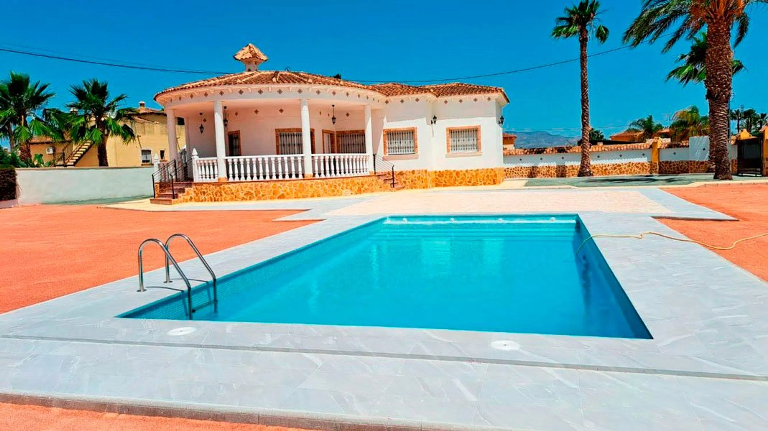 Esta villa independiente de tres dormitorios, con orientación sur y lista para entrar a vivir, se encuentra en Catral, en el corazón de la hermosa campiña, ofreciendo tranquilidad y privacidad a tan solo 5 minutos en coche de los servicios de Catral y Dolores. Las impresionantes playas y una amplia gama de excelentes campos de golf se encuentran a unos 20 minutos, lo que la convierte en un lugar ideal tanto para relajarse como para disfrutar del ocio en la Costa Blanca Sur. Esta espaciosa villa de una sola planta cuenta con 147 m² construidos y se asienta sobre una generosa parcela ajardinada de 2.048 m². Una encantadora terraza circular cubierta da la bienvenida a la vivienda, que da paso a un luminoso y confortable salón. La cocina americana equipada tiene acceso directo a la parte trasera de la propiedad, ideal para una perfecta integración de la vida interior y exterior. Dispone de tres dormitorios dobles, todos con armarios empotrados, y dos modernos baños con ducha, uno de ellos en suite en el dormitorio principal. La parcela, con un hermoso diseño paisajístico, está diseñada para facilitar su mantenimiento y cuenta con un amplio aparcamiento exterior, además de una impresionante piscina privada de 10 x 5 metros, ideal para disfrutar del sol. Unas escaleras exteriores conducen a un solárium privado en la azotea, con vistas panorámicas a las montañas y al campo circundante. Entre las ventajas adicionales se incluyen la preinstalación de aire acondicionado y un perímetro completamente amurallado y seguro, lo que garantiza privacidad y tranquilidad. Esta villa, lista para entrar a vivir, es una oportunidad excepcional para disfrutar de una vida espaciosa y moderna en un entorno rural tranquilo, pero cerca de todo lo que la Costa Blanca Sur tiene para ofrecer.