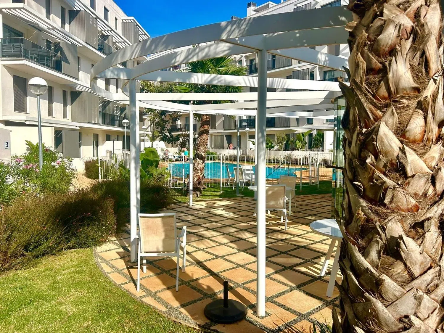 Wewnątrz mieszkania znajduje się korytarz prowadzący do pełnej łazienki oraz trzech przestronnych sypialni, każda z wbudowanymi szafami. Główna sypialnia dysponuje własną łazienką. Obiekt oferuje wiele atrakcji, w tym dwie baseny, tereny zielone, siłownię oraz wspólne pomieszczenia do spotkań.
