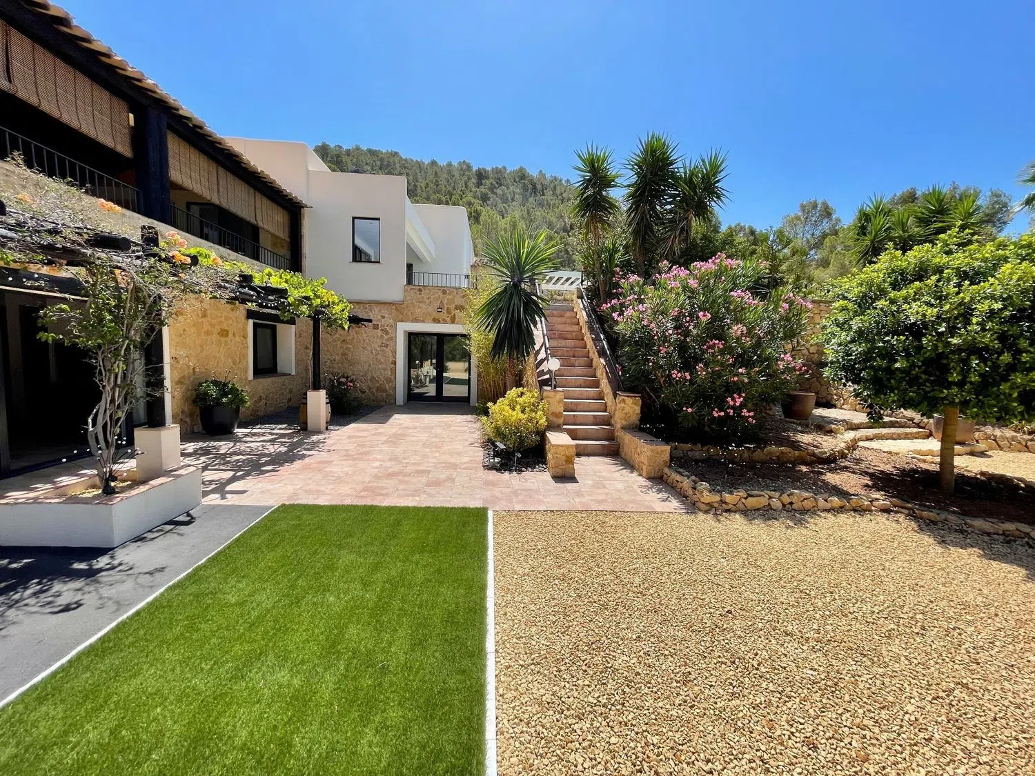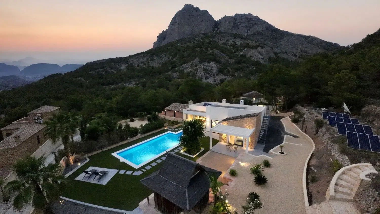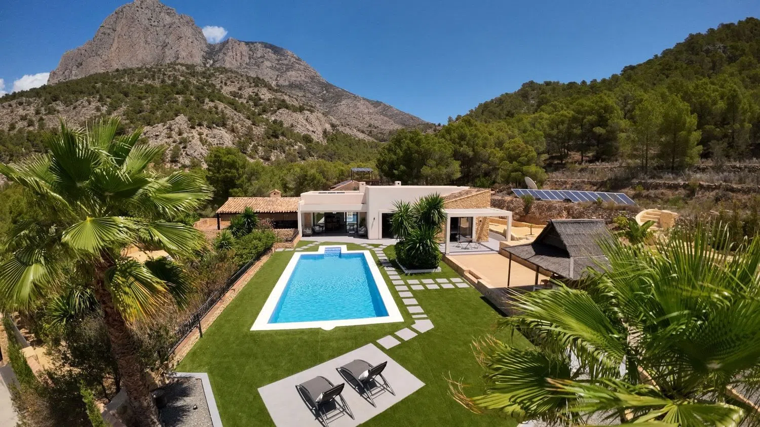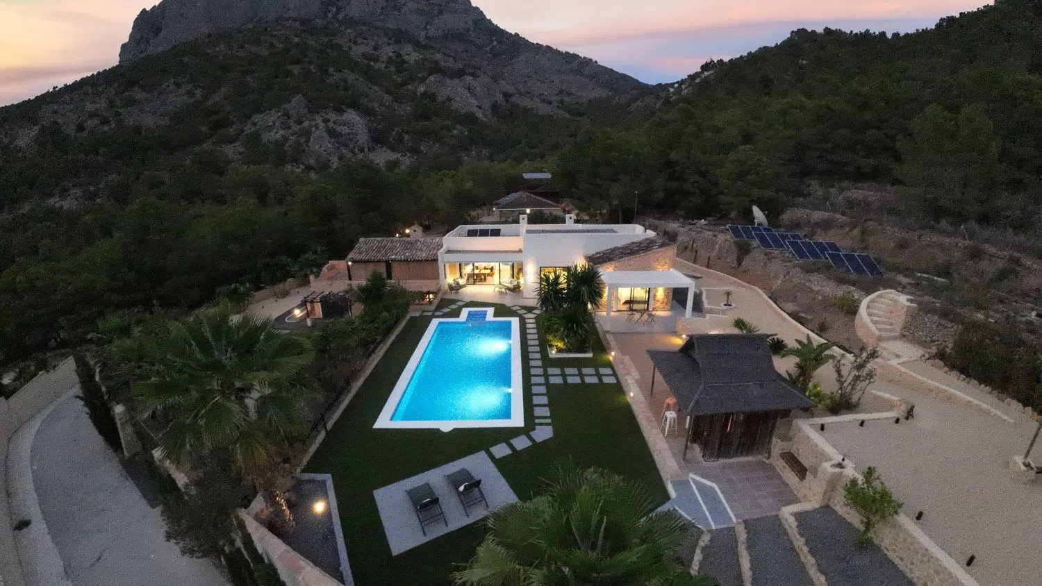 Witamy w idealnym miejscu, które można nazwać domem marzeń. Ta wspaniała, nowoczesna willa jest przekształconą tradycyjną posiadłością, oferującą luksusowe standardy życia dostosowane do współczesnych potrzeb. Położona w cichej okolicy, sprzyjającej pieszym wędrówkom i jeździe na rowerze po malowniczych szlakach górskich, znajduje się zaledwie pięć minut jazdy od pięknych plaż, takich jak La Cala, Villajoyosa i Benidorm.