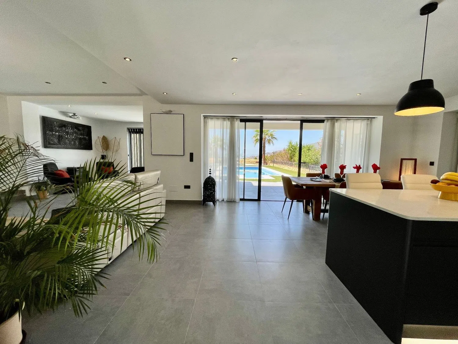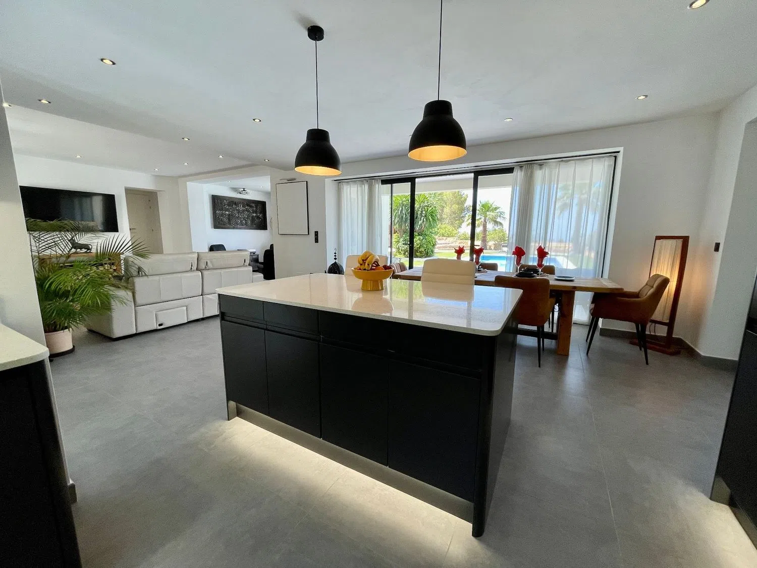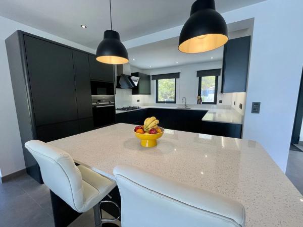 - Nowoczesny Luksus: Przestronna współczesna willa posiada zachwycającą kuchnię z wbudowanymi urządzeniami oraz wyspą.
