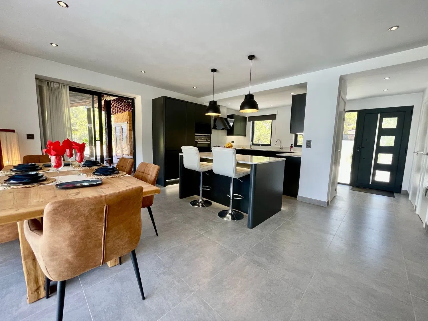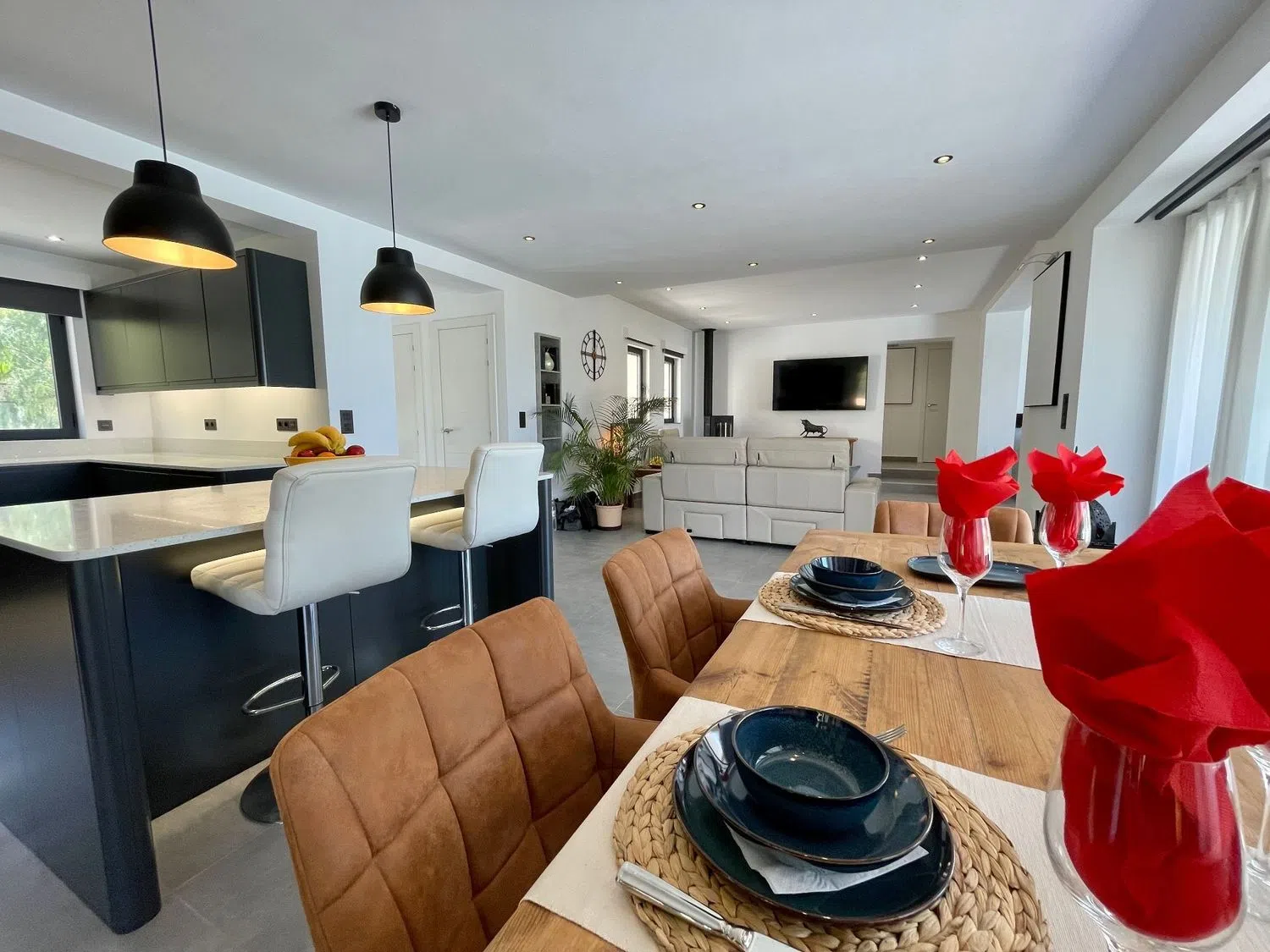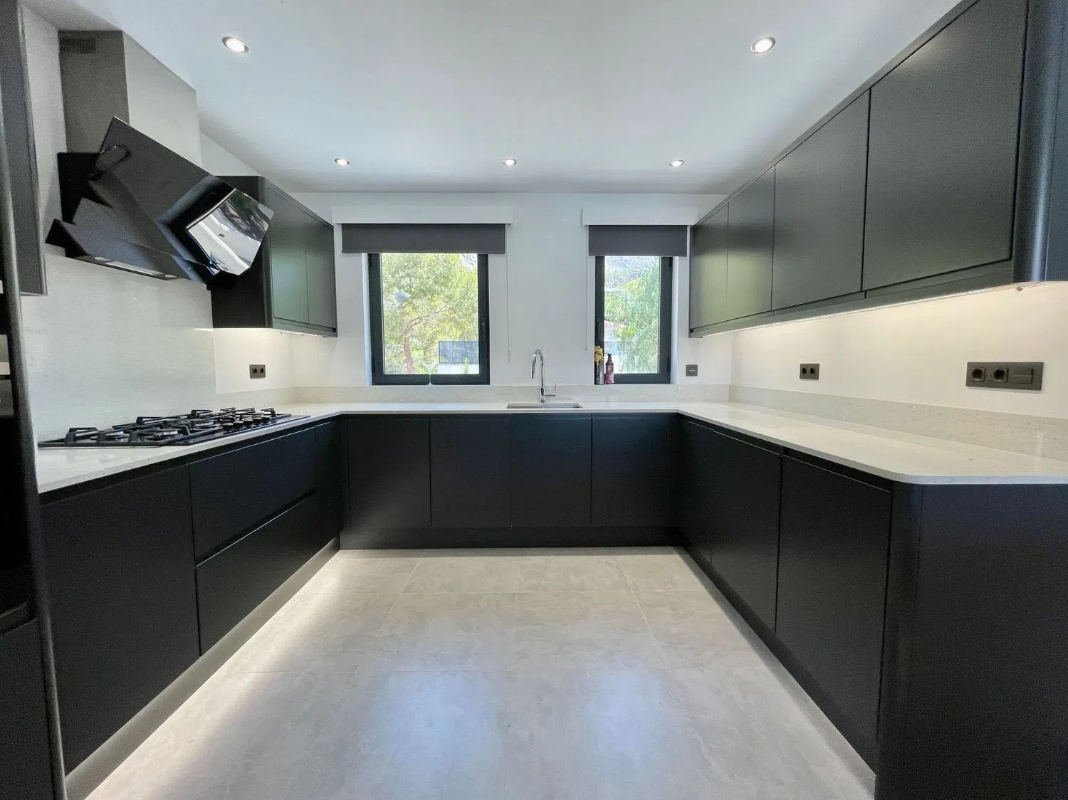 - Nowoczesny Luksus: Przestronna współczesna willa posiada zachwycającą kuchnię z wbudowanymi urządzeniami oraz wyspą.