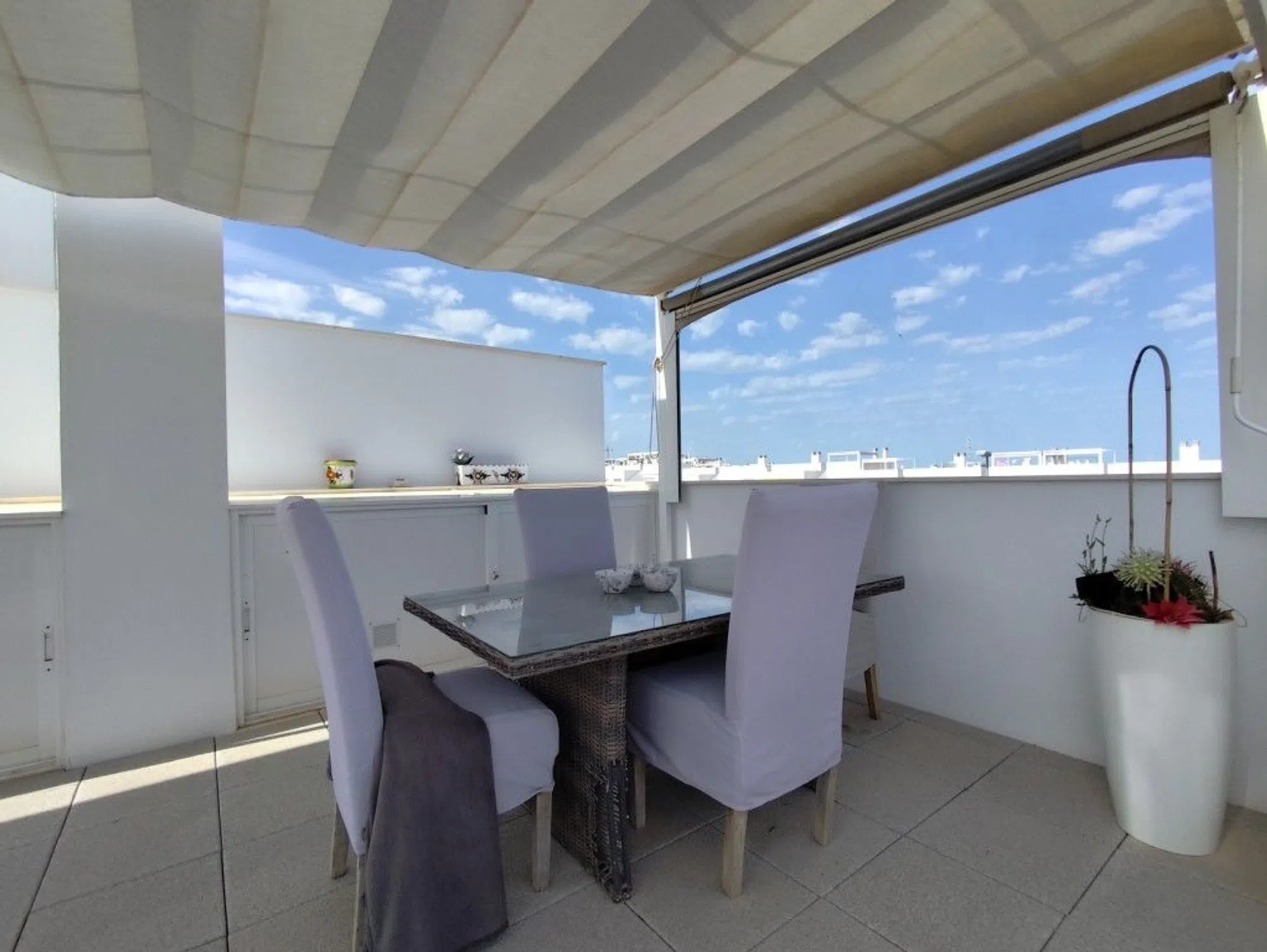 Moderno ático con solárium y jacuzzi en Vistabella Golf Ubicación: Vistabella Golf, Costa Blanca Sur Este ático de dos dormitorios con orientación oeste, en la popular urbanización Vistabella Golf, ofrece comodidad, espacio y una ubicación privilegiada. A solo 5 minutos a pie de bares, restaurantes y un supermercado, esta propiedad goza de una ubicación ideal para la comodidad diaria. En coche, se encuentra a solo 5 minutos de Los Montesinos, a 10 minutos de Quesada y Benijófar, y a unos 20 minutos de las impresionantes playas de la Costa Blanca. Construido en 2019, el apartamento cuenta con un amplio y luminoso salón con grandes puertas correderas que dan a una amplia terraza con vistas a los impecables jardines comunitarios. La cocina americana, totalmente equipada, incluye una amplia barra de desayuno, ideal para comidas informales o para recibir invitados. Hay dos dormitorios dobles, ambos con armarios empotrados. El dormitorio principal tiene baño en suite y también hay un segundo baño familiar moderno con ducha. Desde la terraza, unas escaleras exteriores conducen a su solárium privado, donde encontrará un jacuzzi —incluido en la venta— y una zona de sombra con toldos, creando un entorno ideal para cenar al aire libre y relajarse mientras disfruta de vistas panorámicas y puestas de sol. Las características adicionales incluyen: Aire acondicionado por conductos Cuatro paneles solares Parcialmente amueblado Piscina comunitaria Plaza de aparcamiento comunitaria asignada Esta propiedad bien mantenida ofrece un estilo de vida equilibrado de comodidad, relajación y accesibilidad, ideal como refugio de vacaciones, inversión de alquiler o hogar permanente bajo el sol español. Contacto ¿Te interesa ver o saber más€ Contacta con nosotros. ¡Con gusto te ayudaremos a encontrar tu lugar ideal! ☀️.