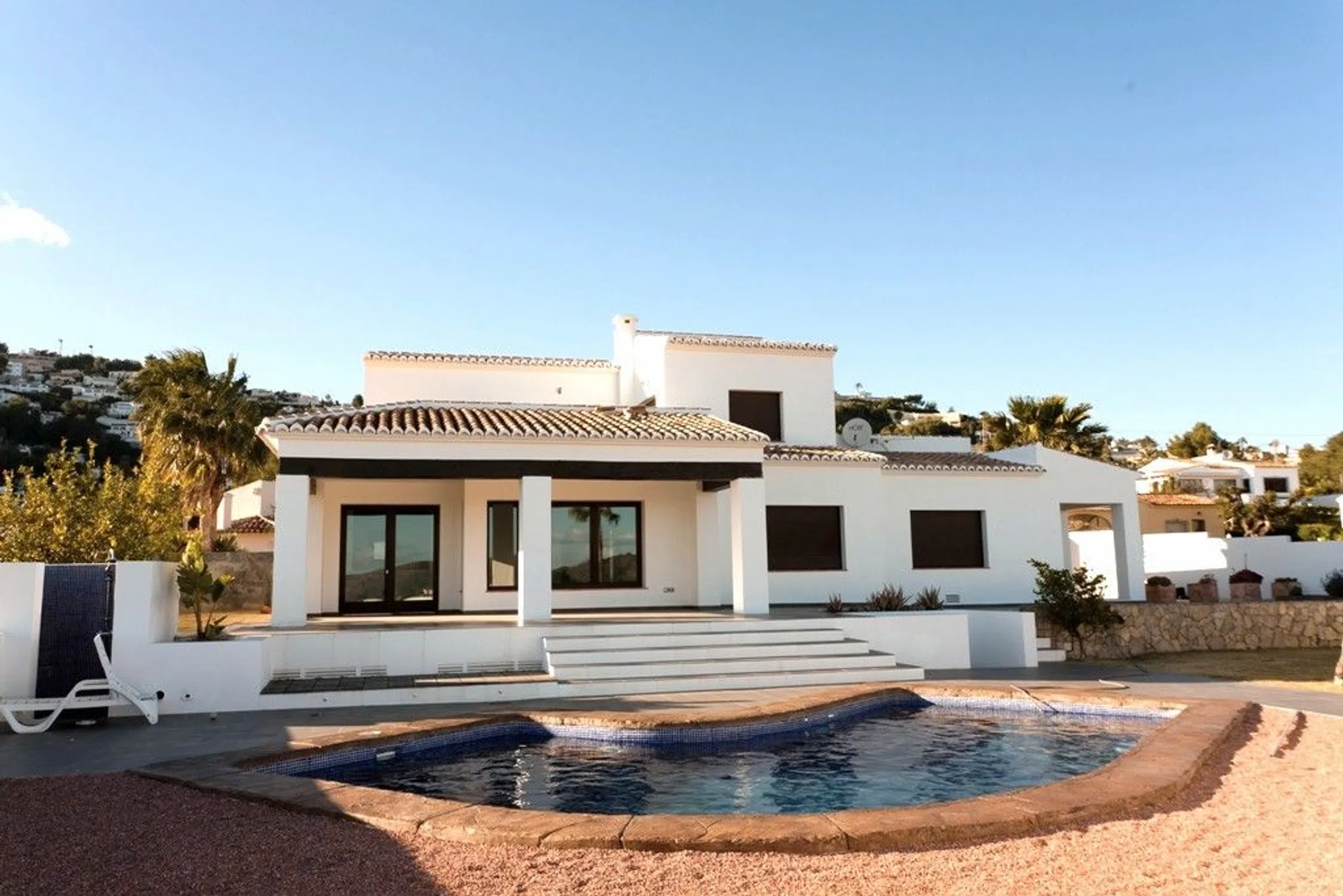 Amplia villa familiar nueva con piscina privada y terraza en la azotea con preciosas vistas al mar, a poca distancia en coche de Moraira. Preciosa villa de estilo mediterráneo en venta con impresionantes vistas panorámicas al Cap d'Or, la costa y el mar Mediterráneo. Ubicada en una zona privilegiada de Moraira, en la Costa Blanca, la propiedad se encuentra a poca distancia en coche del animado centro, las playas y una amplia variedad de supermercados, bares y restaurantes. Distribuida en dos niveles sobre una parcela elevada, esta villa de cuatro dormitorios ofrece espacios diáfanos, piscina privada y jardines de fácil mantenimiento. Con sol durante todo el día, la terraza y la piscina ofrecen privacidad y un ambiente tranquilo, ideales para relajarse o recibir invitados. La villa, reformada, cuenta con interiores modernos y preinstalación de fontanería y electricidad, lo que le permite personalizar los acabados a su gusto. Con amplios espacios interiores y una excelente ubicación, representa una magnífica oportunidad para crear un hogar acogedor bajo el sol. DETALLES COMPLETOS Encaramada en una colina con impresionantes vistas al mar, esta villa moderna de estilo mediterráneo, orientada al sureste, está a la venta y combina privacidad, confort y estilo. Ubicada en una amplia parcela llana de dos plantas, la propiedad cuenta con acceso a través de una puerta automática o peatonal que conduce a una entrada con amplio aparcamiento. La planta baja da la bienvenida a un luminoso salón-comedor con una acogedora chimenea, además de espacio para crear una cocina a medida y una lavandería, ya equipadas con preinstalación de fontanería y electricidad. Un baño con ducha completa esta planta. Anexo a la casa principal se encuentra un apartamento versátil con entrada independiente. Este espacio incluye un salón-comedor que podría funcionar como suite principal, una habitación que se puede convertir en cocina o vestidor, un dormitorio y un baño; todo ello enmarcado por una encantadora puerta antigua de madera restaurada. En la planta superior, dos dormitorios y un baño dan a una soleada terraza acristalada, ideal para disfrutar de vistas panorámicas al Mediterráneo. Desde todas las estancias principales se divisa el jardín, la terraza y la piscina de diseño exclusivo, que incluye una ducha exterior. El jardín, de fácil mantenimiento, cuenta con riego automático, lo que facilita disfrutar del exterior sin complicaciones. La villa está equipada con acabados de alta calidad, incluyendo carpintería exterior de aluminio con vidrio Climalit, armarios empotrados con puertas correderas, persianas y mosquiteras en los dormitorios (con persianas motorizadas en la planta superior), calefacción central por radiadores e iluminación regulable en toda la vivienda. Ideal para vivir todo el año o como casa de vacaciones, esta villa de nueva construcción ofrece un amplio margen para personalizar los acabados y convertirla en la casa de sus sueños. Con una ubicación ideal a poca distancia a pie de un pequeño supermercado, restaurantes y bares, y a un corto trayecto en coche del animado centro de Moraira, combina a la perfección tranquilidad y accesibilidad. El prestigioso colegio internacional Lady Elizabeth se encuentra a tan solo 15 minutos en coche, lo que resulta ideal para familias que buscan establecerse definitivamente. Experimente el estilo de vida mediterráneo en su máxima expresión. Contáctenos hoy para programar una visita a esta excepcional villa.