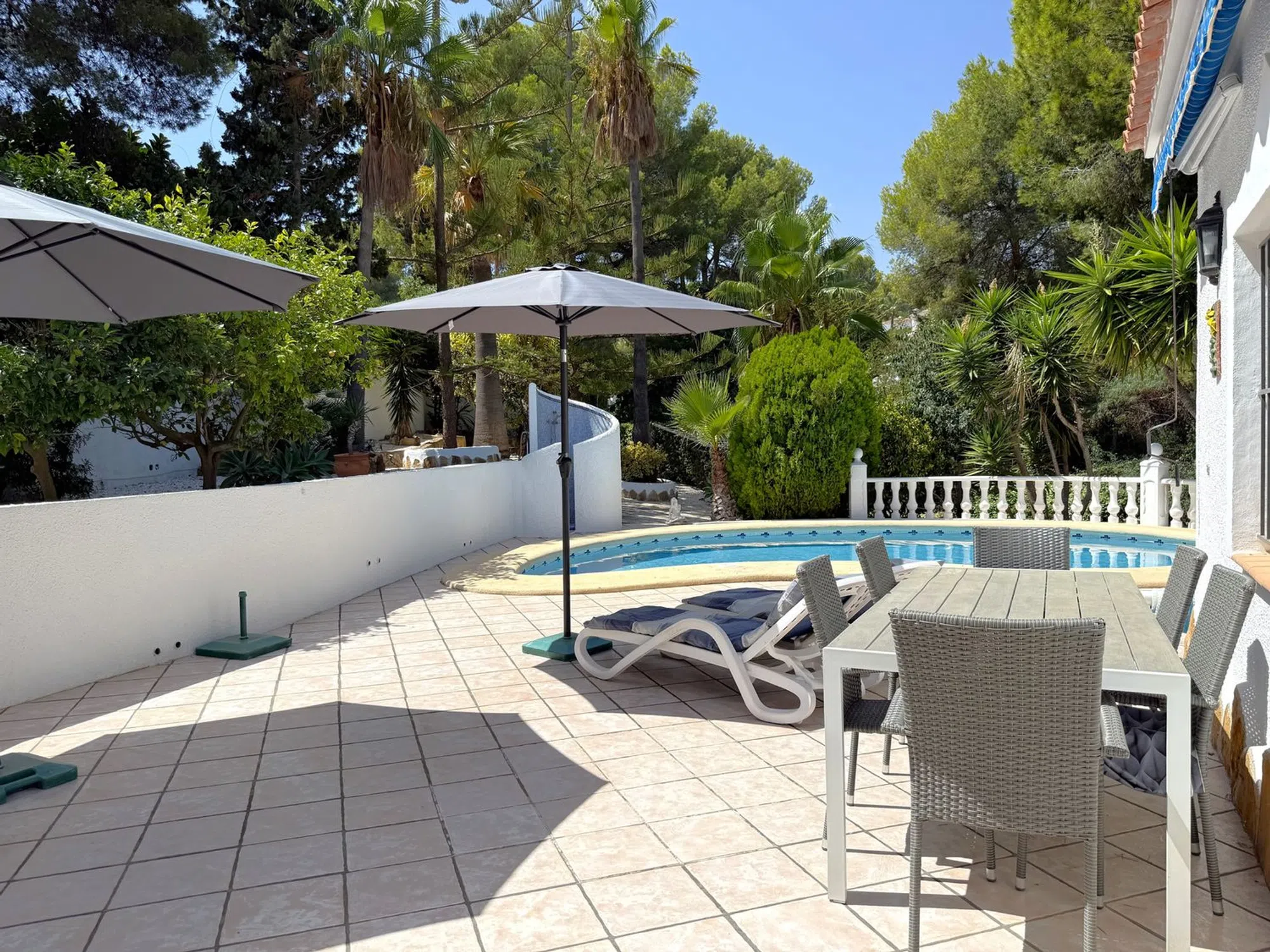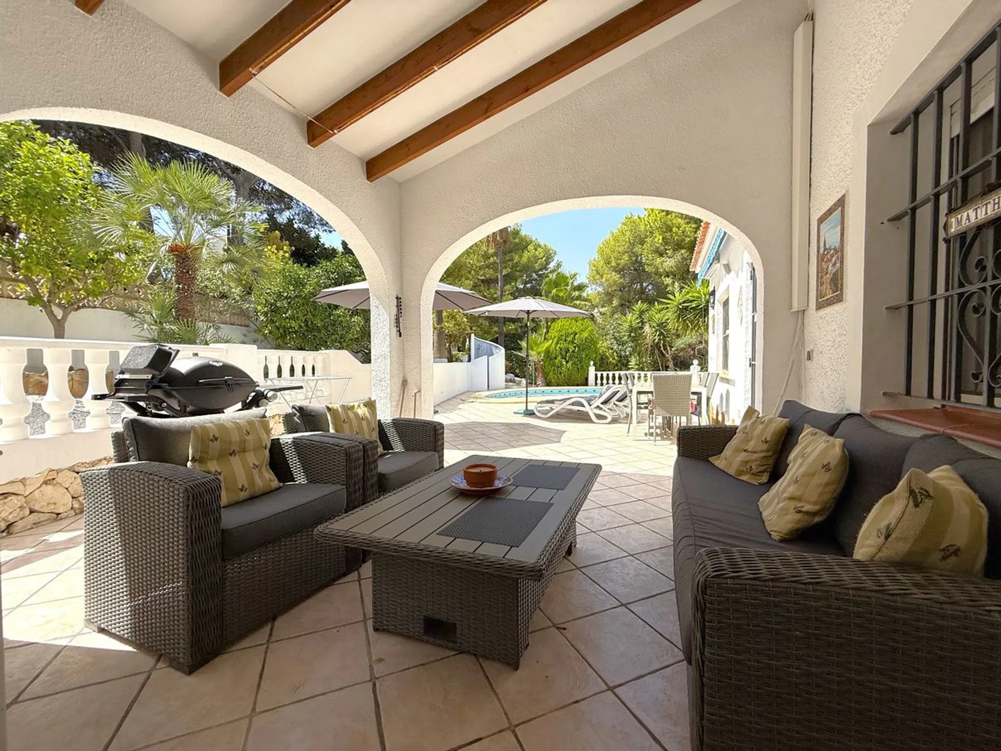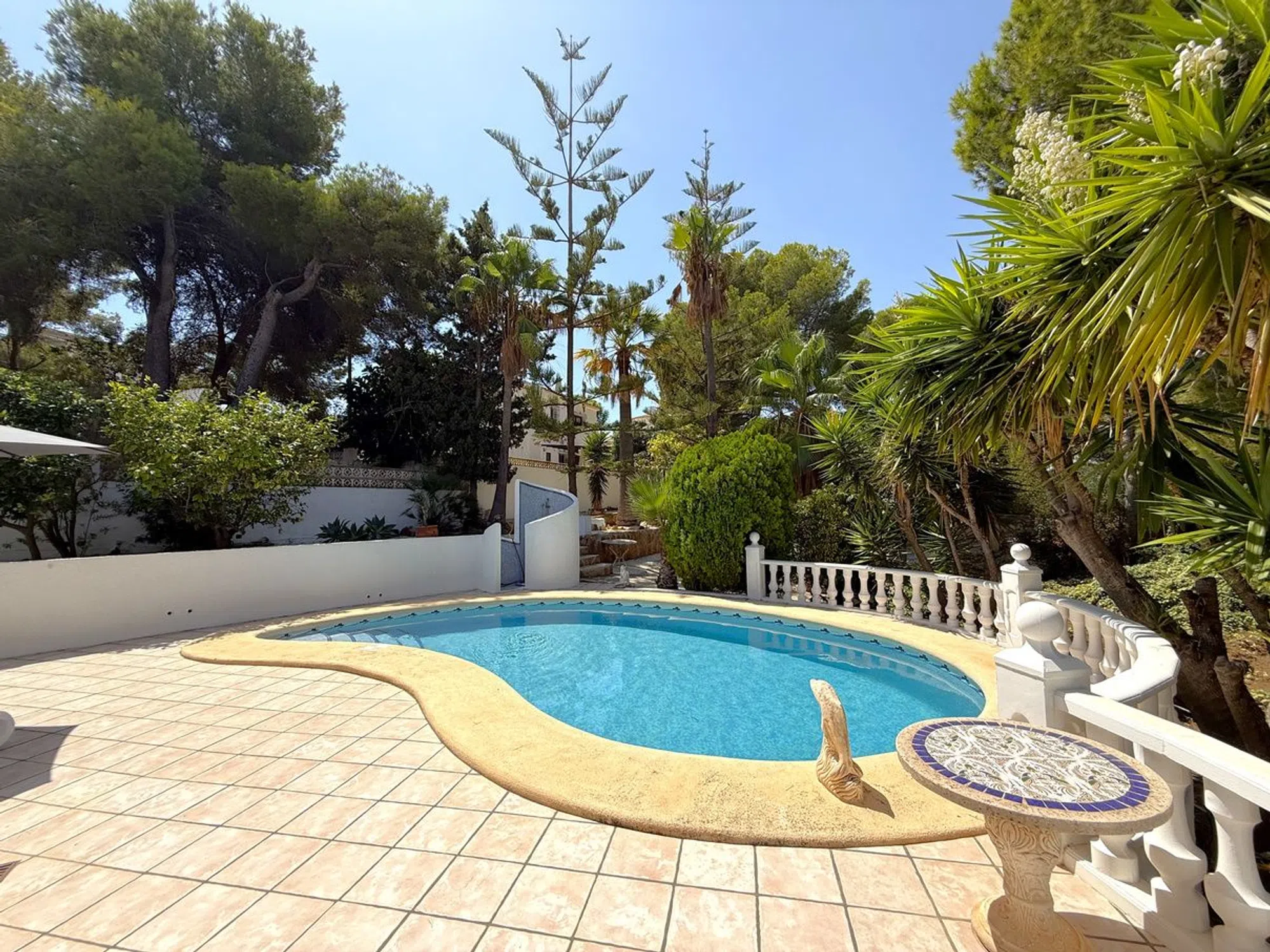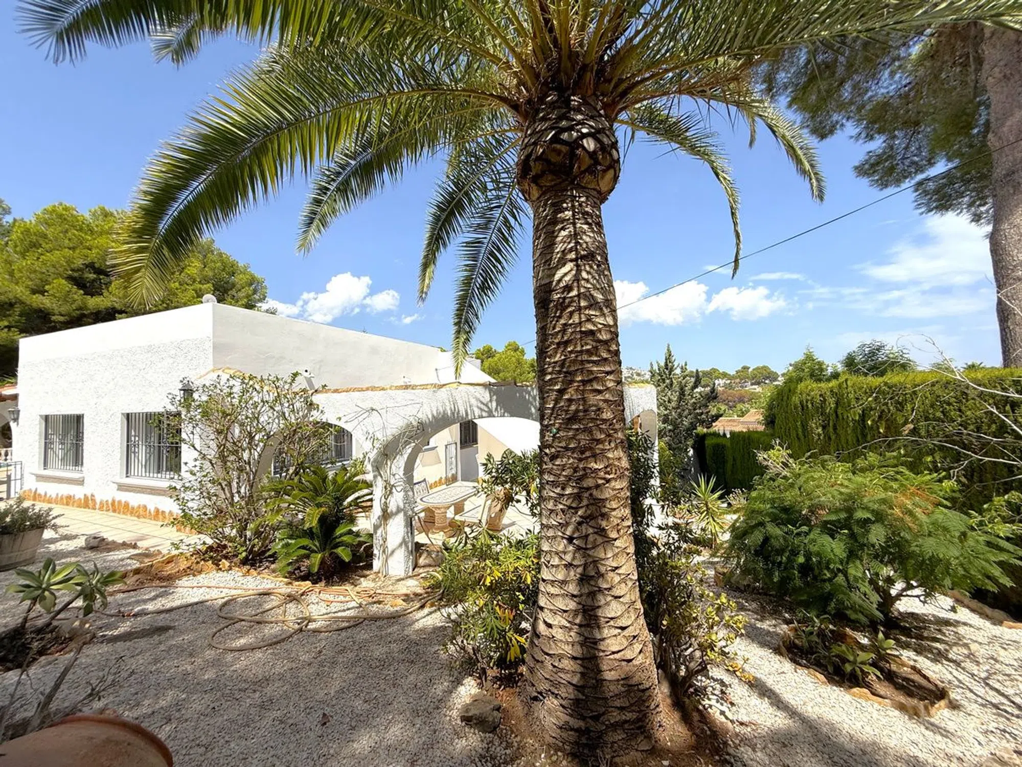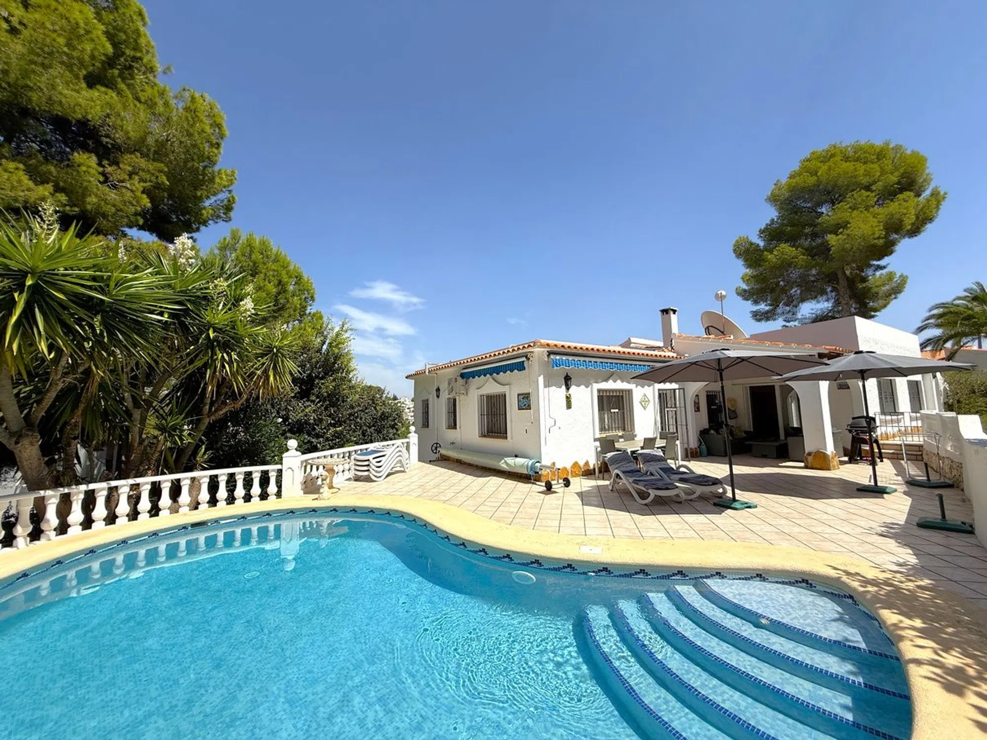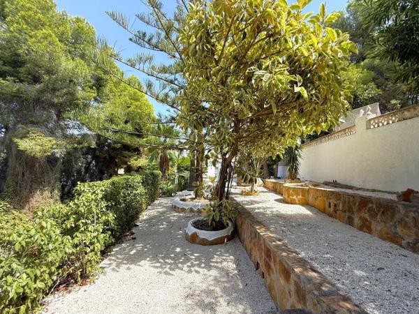 Esta villa de tres dormitorios y dos baños, cuidadosamente mantenida, se encuentra a un corto paseo del centro de Moraira y ofrece el equilibrio perfecto entre comodidad moderna y encanto mediterráneo. Una entrada privada conduce a un amplio aparcamiento, dos garajes y un gran taller. Unas escaleras ascienden a un distintivo patio en terrazas, creando una entrada acogedora. En el interior, la cocina de concepto abierto está totalmente equipada con amplias superficies de trabajo, despensa y lavandería, conectando con un luminoso comedor. Las puertas acristaladas se abren a una terraza cubierta con vistas a la piscina en forma de riñón de 8 x 4, soleadas terrazas y jardines maduros. El amplio salón cuenta con una chimenea central y acceso directo a una terraza con bonitas vistas. La suite principal incluye vestidor y baño en suite, mientras que otros dos amplios dormitorios comparten un elegante baño familiar, uno de ellos con acceso directo a la terraza. Otros detalles destacados incluyen calefacción central de gas, aire acondicionado frío/calor, doble acristalamiento con mosquiteras, ducha exterior, calefacción solar para la piscina y cubierta, iluminación LED en el jardín, valla de seguridad opcional para la piscina y una terraza en la azotea de 42 m² con vistas panorámicas. Se incluye el mobiliario principal. Esta villa realmente lo tiene todo.