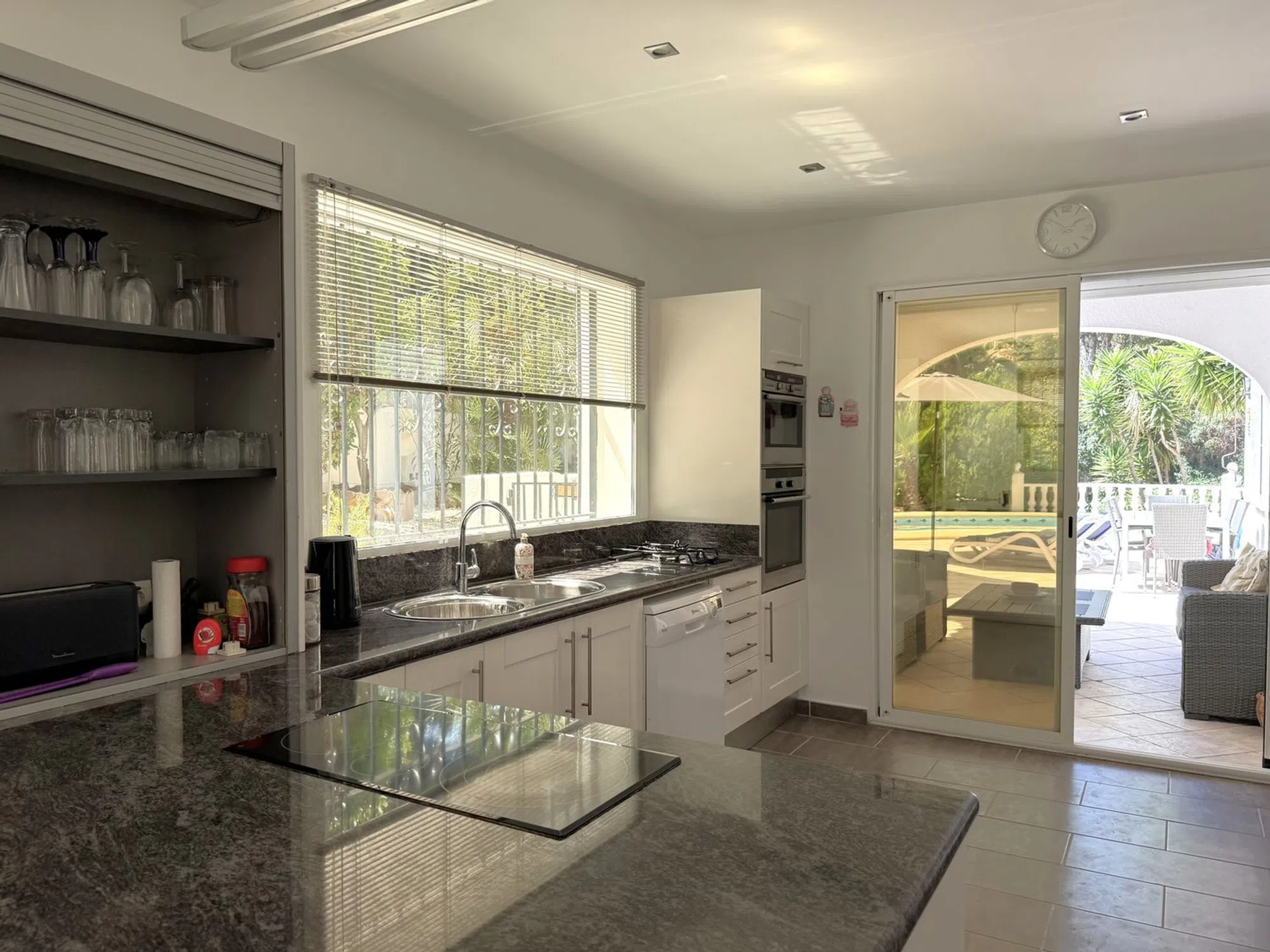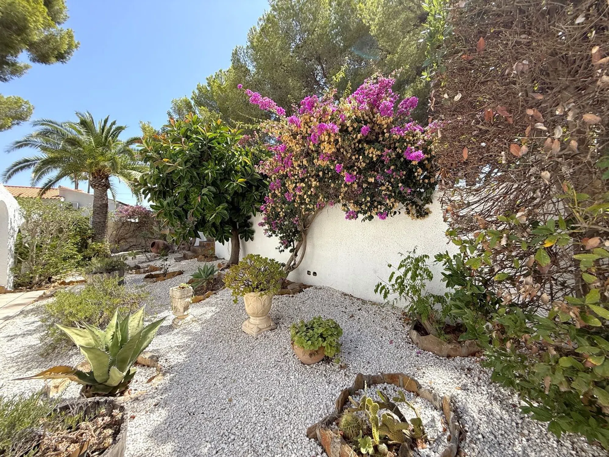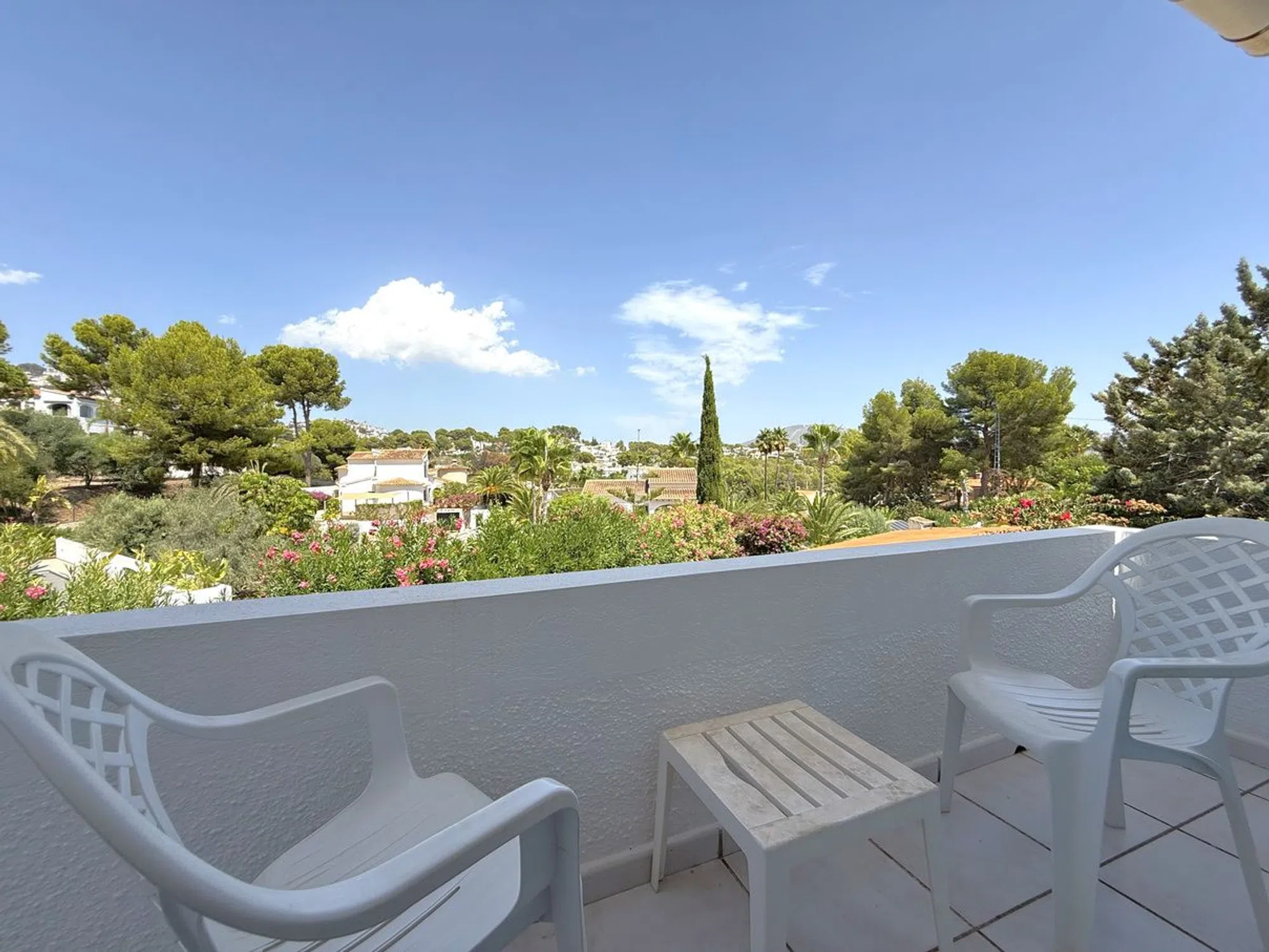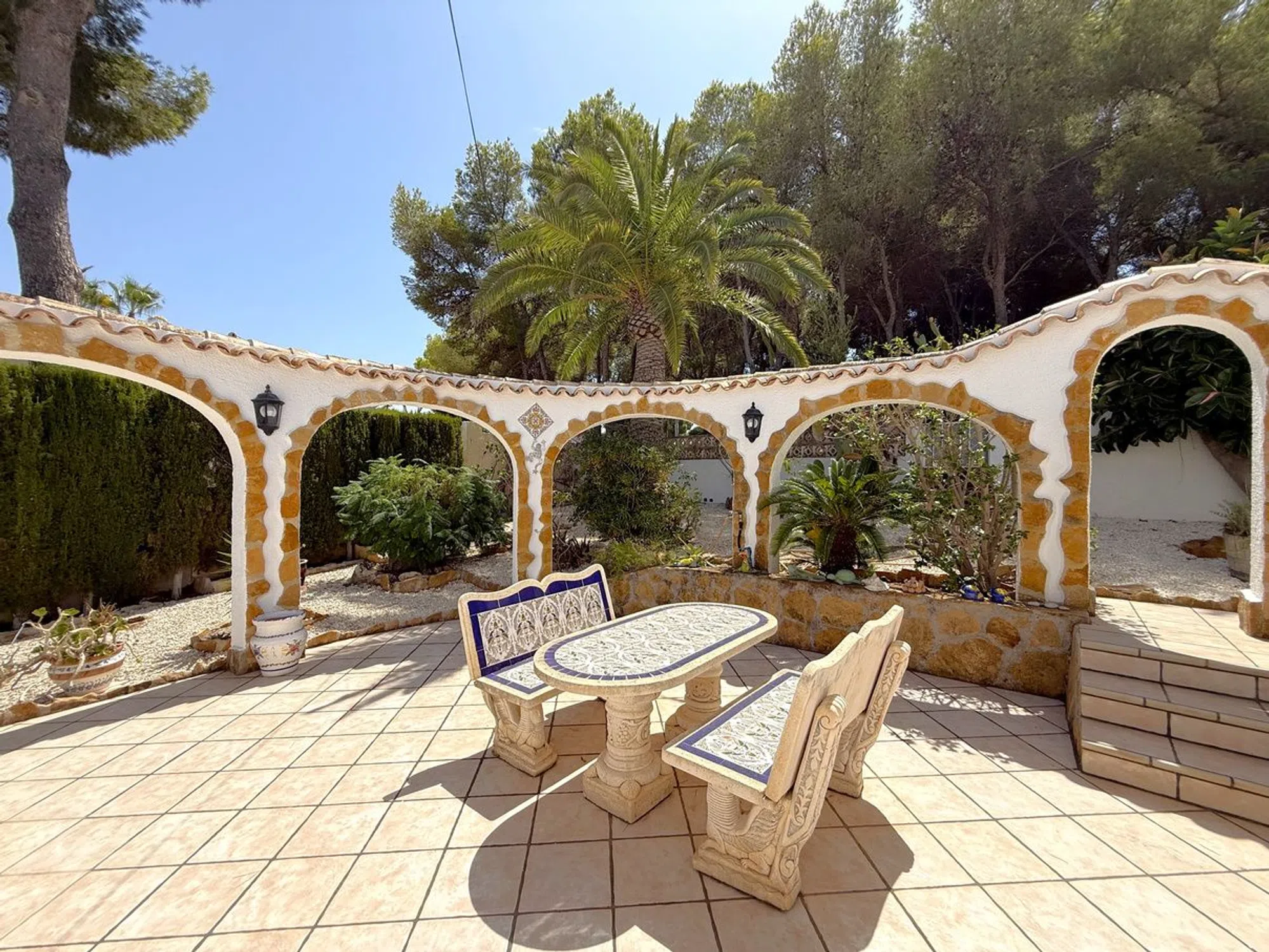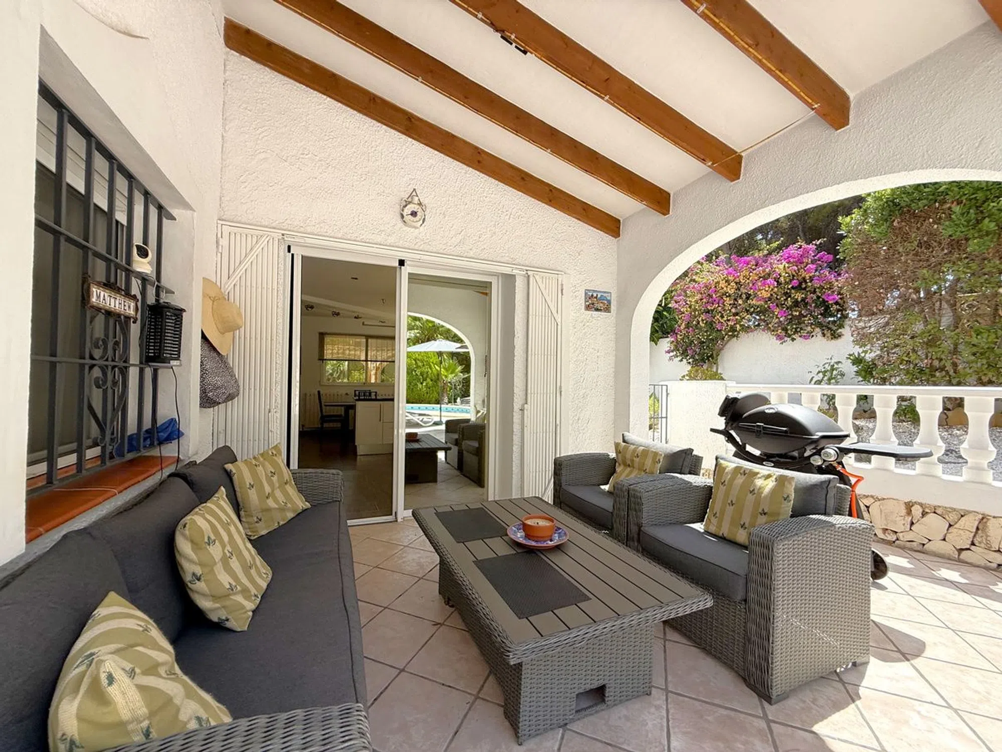 Esta villa de tres dormitorios y dos baños, cuidadosamente mantenida, se encuentra a un corto paseo del centro de Moraira y ofrece el equilibrio perfecto entre comodidad moderna y encanto mediterráneo. Una entrada privada conduce a un amplio aparcamiento, dos garajes y un gran taller. Unas escaleras ascienden a un distintivo patio en terrazas, creando una entrada acogedora. En el interior, la cocina de concepto abierto está totalmente equipada con amplias superficies de trabajo, despensa y lavandería, conectando con un luminoso comedor. Las puertas acristaladas se abren a una terraza cubierta con vistas a la piscina en forma de riñón de 8 x 4, soleadas terrazas y jardines maduros. El amplio salón cuenta con una chimenea central y acceso directo a una terraza con bonitas vistas. La suite principal incluye vestidor y baño en suite, mientras que otros dos amplios dormitorios comparten un elegante baño familiar, uno de ellos con acceso directo a la terraza. Otros detalles destacados incluyen calefacción central de gas, aire acondicionado frío/calor, doble acristalamiento con mosquiteras, ducha exterior, calefacción solar para la piscina y cubierta, iluminación LED en el jardín, valla de seguridad opcional para la piscina y una terraza en la azotea de 42 m² con vistas panorámicas. Se incluye el mobiliario principal. Esta villa realmente lo tiene todo.