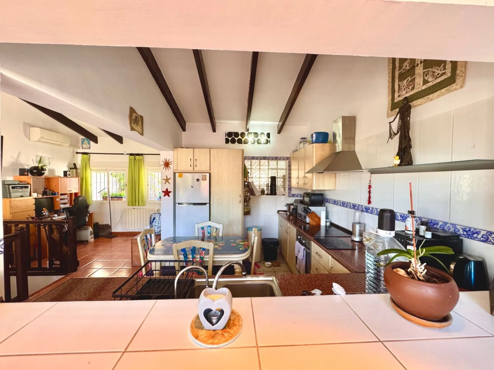 Acogedor adosado tipo dúplex en tranquila urbanización con piscina en MorairaTe presentamos este encantador adosado tipo dúplex en Moraira, situado en una pequeña y tranquila urbanización de solo 13 casas. Un entorno ideal para quienes buscan paz y comodidad, a tan solo 1,8 km del centro de Moraira y sus playas. A solo 500–600 metros se encuentra la zona de Tabaira, donde podrás ir andando a restaurantes, supermercado y otros servicios, lo que convierte esta vivienda en una opción perfecta tanto para vivir todo el año como para disfrutar de las vacaciones. La urbanización ofrece una bonita piscina comunitaria, jardines bien cuidados y zona de aparcamiento junto a la entrada del adosado. En este punto también se encuentra una terraza orientada al oeste, ideal para relajarse al atardecer o disfrutar del sol de la tarde. Distribución de la viviendaEsta casa tipo dúplex se distribuye en dos plantas comunicadas interiormente, con espacios luminosos y funcionales: Planta principal: hall de entrada, un espacio actualmente utilizado como despacho, salón-comedor con cocina abierta y acceso a una terraza de unos 6 x 1,5 metros. Planta inferior: dos dormitorios dobles, uno de ellos con salida directa a una terraza-jardín privativa de fácil mantenimiento, un espacio perfecto para disfrutar en familia, cenar al aire libre o preparar una barbacoa. En esta planta también se encuentran un baño completo, un aseo con ducha y una habitación adicional sin ventana, ideal como trastero o dormitorio auxiliar. Características destacadasUrbanización muy tranquila y cuidada, con solo 13 viviendas. Piscina y jardines comunitarios. Ventanas de aluminio con doble acristalamiento. Aire acondicionado frío/calor en el salón-comedor. Parking privado junto a la entrada. Este adosado en Moraira combina tranquilidad, cercanía a los servicios y un entorno natural único. Una vivienda lista para entrar a vivir, con el encanto del Mediterráneo y la comodidad de estar a solo 1,8 km del centro de Moraira. Además, desde la terraza en la planta principal se disfrutan vistas abiertas a la naturaleza, un rincón ideal para relajarse y conectar con el entorno Contáctanos para más información o para concertar una visita.