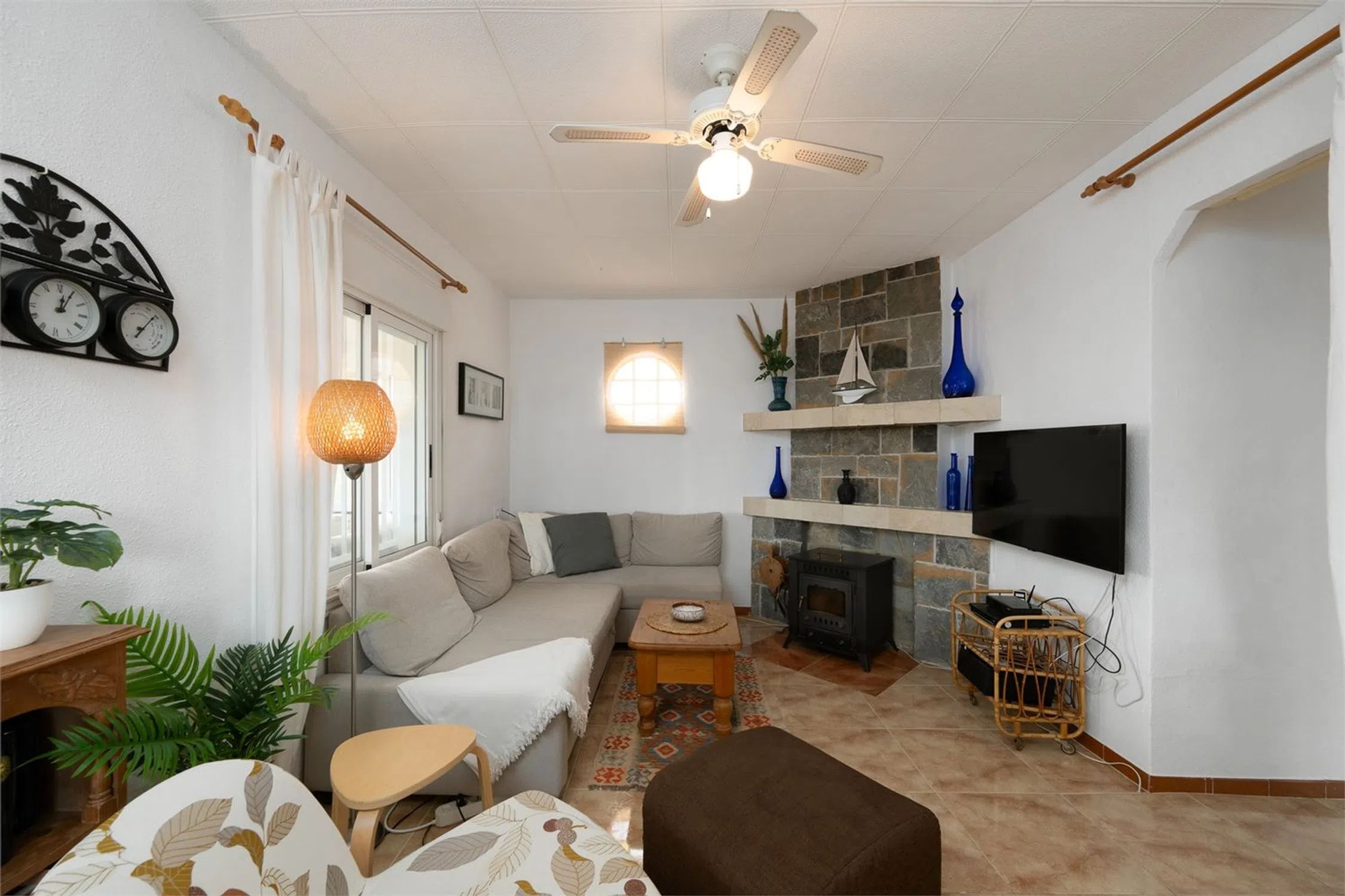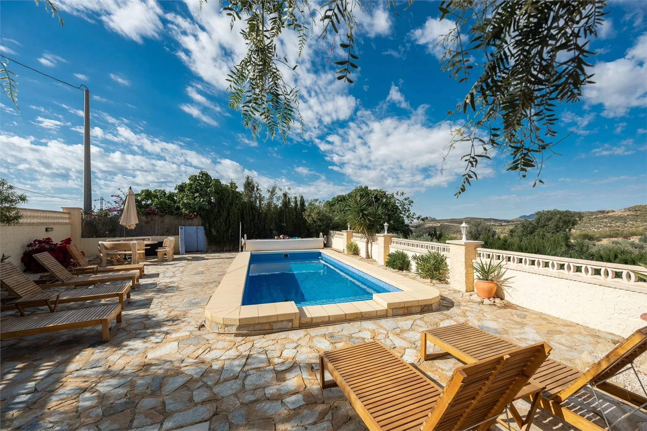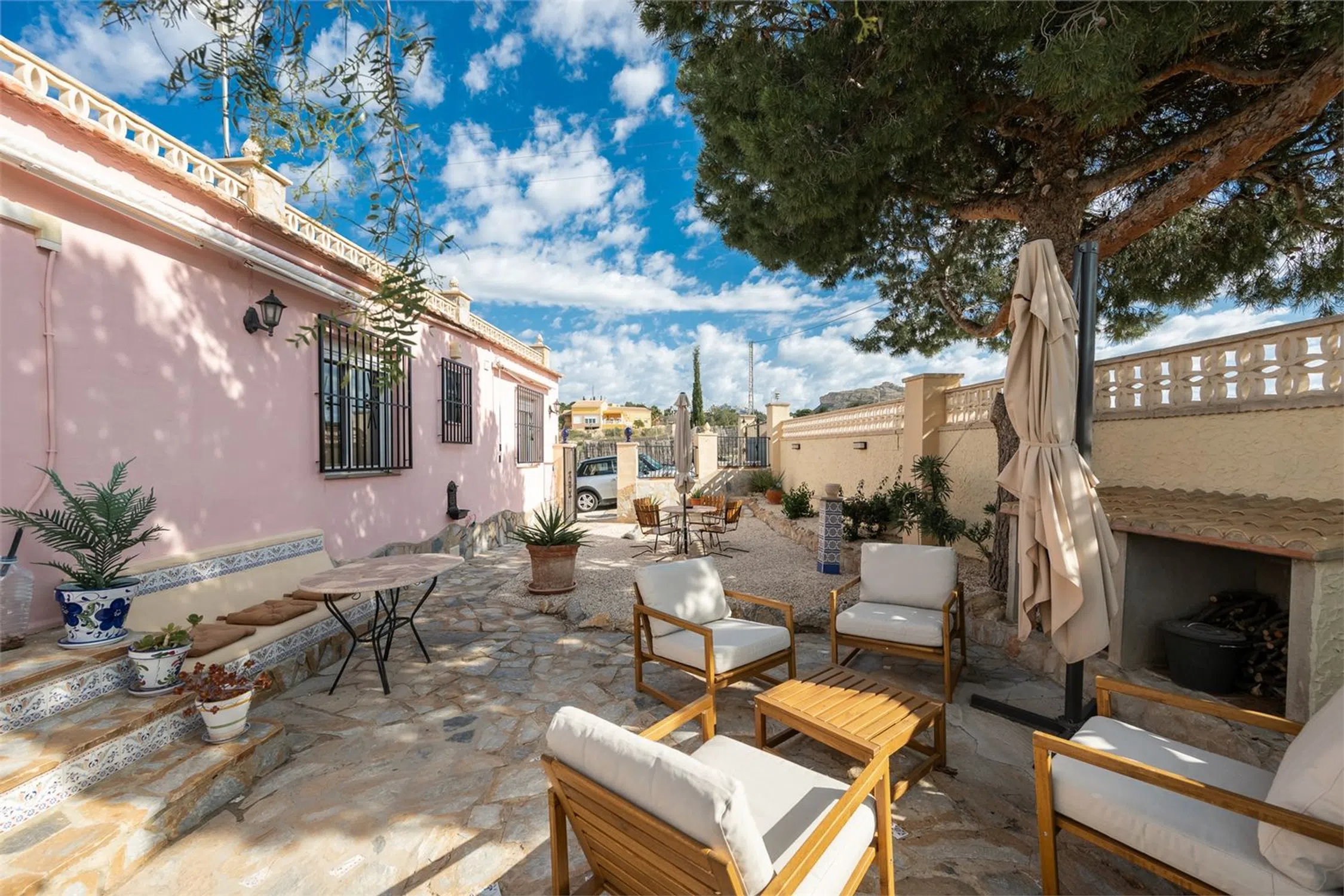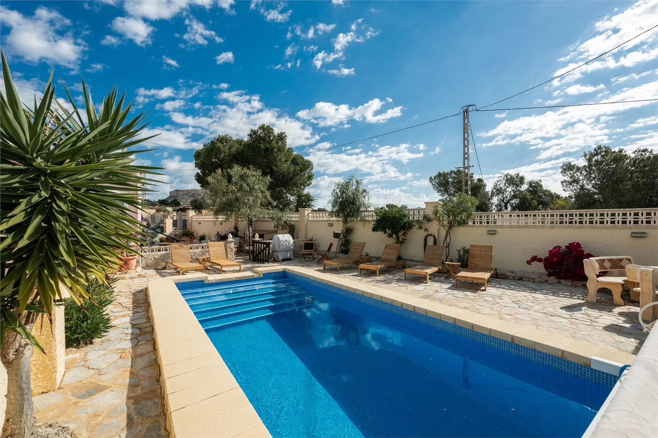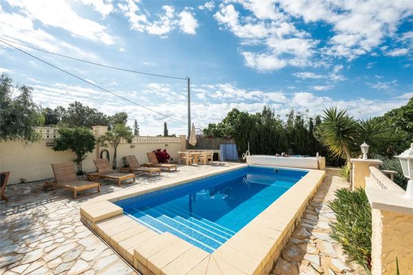 Chalet con piscina y vistas! Esta encantadora villa de dos plantas se encuentra en una parcela de aproximadamente 2000 m² y cuenta con tres dormitorios, dos baños y un amplio garaje. La vivienda cuenta con camas adicionales gracias a la incorporación de sofás cama, lo que da un total de 8 plazas para dormir en la casa principal y 4 plazas en la zona de invitados. La casa cuenta con piscina privada, jacuzzi y una vegetación madura alrededor de la propiedad que proporciona un entorno exterior privado y verde. Aquí vivirá en un oasis de paz rodeado de montañas, pero cerca de todo lo necesario para disfrutar de una maravillosa vida bajo el sol. La casa se distribuye en dos plantas y presenta una distribución sencilla y funcional. Los dormitorios se distribuyen entre las plantas, lo que permite tanto el alojamiento familiar como las instalaciones para invitados. La planta baja cuenta con cocina independiente, salón y dormitorio con baño, perfecto para invitados o para actividades de alquiler. La casa se mantiene en un nivel excelente y está lista para entrar a vivir de inmediato. Hay aire acondicionado instalado en casi toda la casa y el salón también tiene chimenea. Hay agradables zonas para pasar tiempo al aire libre y en el interior con familiares y amigos, y el precioso jardín ofrece amplio espacio para organizar barbacoas, fiestas en la piscina y un parque infantil. Junto a la casa también hay una terraza acristalada, perfecta para los meses más frescos. La villa también cuenta con un práctico garaje con trastero. La villa se encuentra en una zona tranquila a las afueras de Alicante. La playa más cercana está a unos 20-25 minutos en coche. El aeropuerto de Alicante-Elche está a unos 30 minutos en coche, lo que facilita el acceso incluso a quienes viajan diariamente o reciben visitas internacionales. El centro de Alicante se encuentra a unos 30 minutos, donde podrá disfrutar de una amplia oferta gastronómica, cultural y nocturna. RESIDENCIA Jardín El jardín está bien cuidado y tiene una superficie de aproximadamente 2000 m². Está parcialmente pavimentado y es de fácil mantenimiento, pero también cuenta con césped, árboles y plantas para disfrutar. Hay una amplia piscina privada con tumbonas. En el jardín hay varias zonas de estar y, en la parte trasera de la casa, un comedor más amplio y un jacuzzi. Desde la parcela se disfruta de una hermosa vista a las montañas y a los numerosos olivos. Planta superior Porche acristalado Una luminosa sala exterior con otra zona de sofás y mesa de comedor. Salón Una amplia sala con amplio espacio para varias zonas de estar o muebles de comedor. Cuenta con chimenea y ventanas en diferentes direcciones que dejan entrar la luz. Hay un split de aire acondicionado instalado. Aseo Inodoro completamente alicatado con lavabo, ducha y ventana. Recibidor En el recibidor hay un aparato de aire acondicionado, muy práctico para refrescar o calentar los dormitorios. Dormitorio 1 Amplio dormitorio con paredes pintadas de blanco, ventilador de techo, armarios empotrados y espacio para una cama doble. Dormitorio 2 Un dormitorio un poco más pequeño, pero con armario empotrado, ventilador de techo y espacio para dos camas individuales. Planta inferior Casa de invitados Salón Una bonita habitación con muebles claros, espacio para un grupo de sofás, un sillón y un mueble de TV. Dormitorio 3 Un amplio dormitorio con espacio para armarios y una cama doble. Baño 2 Un baño completamente alicatado y fresco. Cocina Cocina completa con espacio de almacenamiento y todos los electrodomésticos. Ventanas y buenas encimeras. Garaje Un amplio garaje que también funciona como trastero y lavadero.