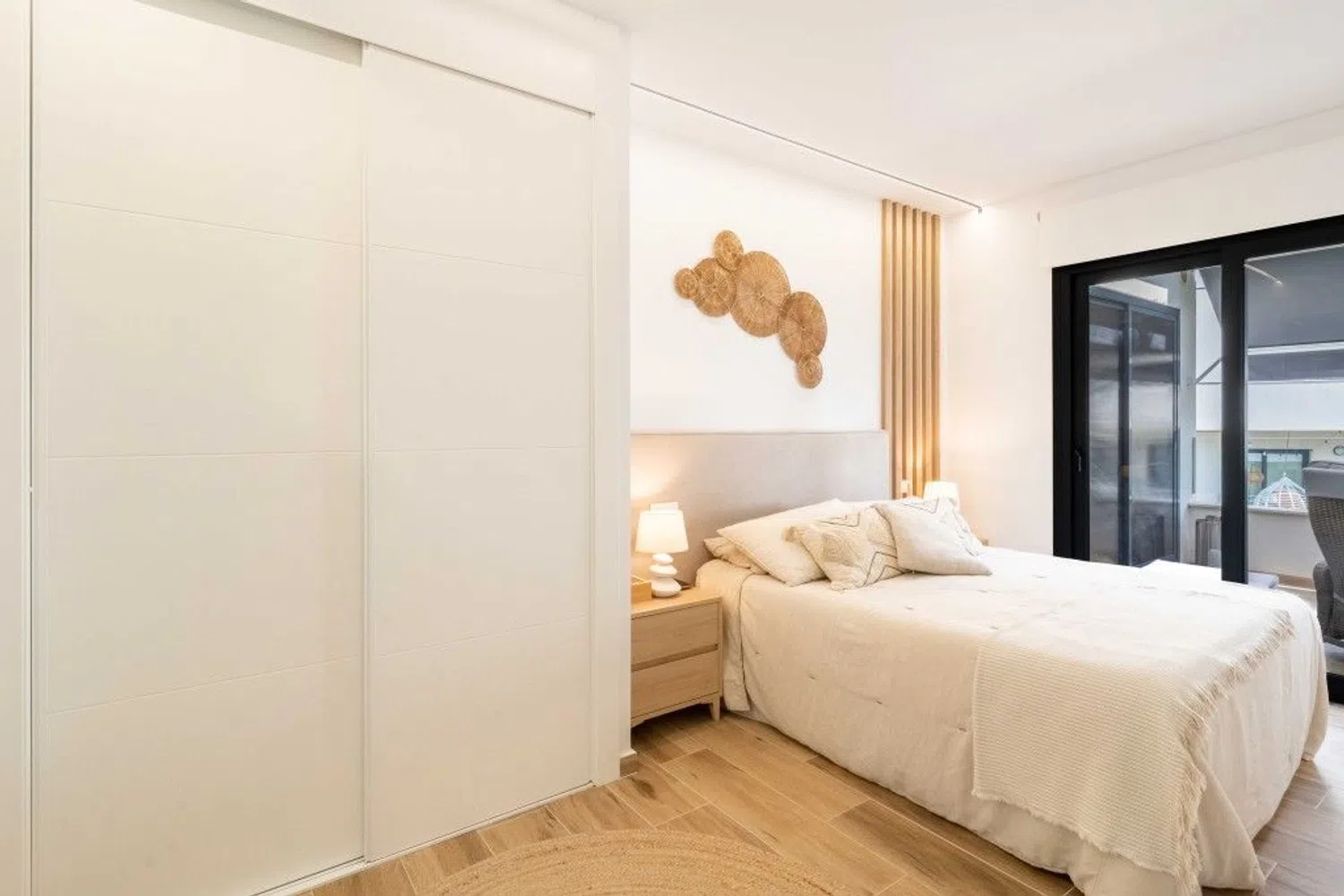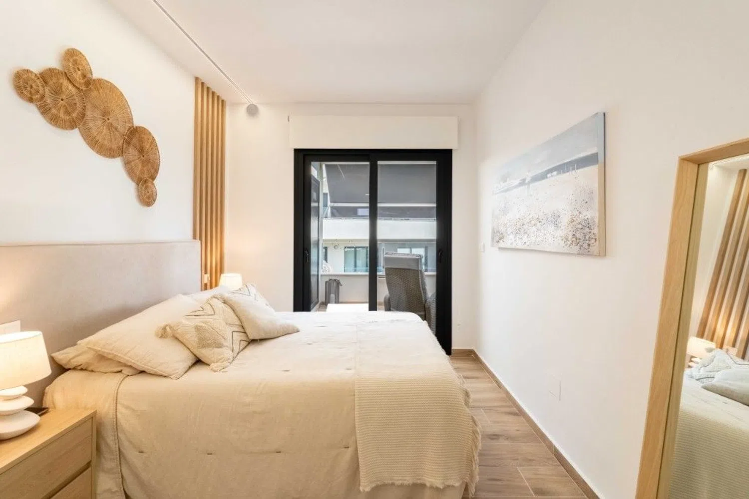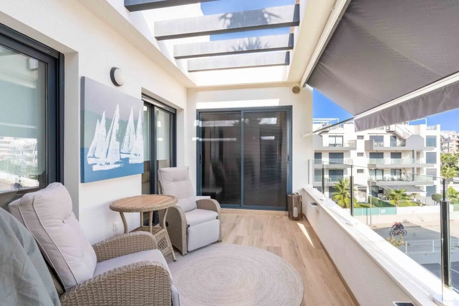 Przestronny i jasny apartament został starannie urządzony oraz umeblowany z wyczuciem stylu. Składa się z salonu z jadalnią i dużymi drzwiami prowadzącymi na taras, w pełni wyposażonej otwartej kuchni, pięknej i przestronnej głównej sypialni z dostępem do tarasu oraz prywatnej łazienki, a także drugiej sypialni dla gości i osobnej łazienki. Wewnątrz znajduje się schody prowadzące na fantastyczny taras na dachu, z którego roztacza się widok na odległe morze. Taras wyposażony jest w przyjemną strefę wypoczynkową z rozsuwanym zadaszeniem, część do opalania oraz strefę jadalną z kuchnią na świeżym powietrzu, idealną do spożywania posiłków na zewnątrz.