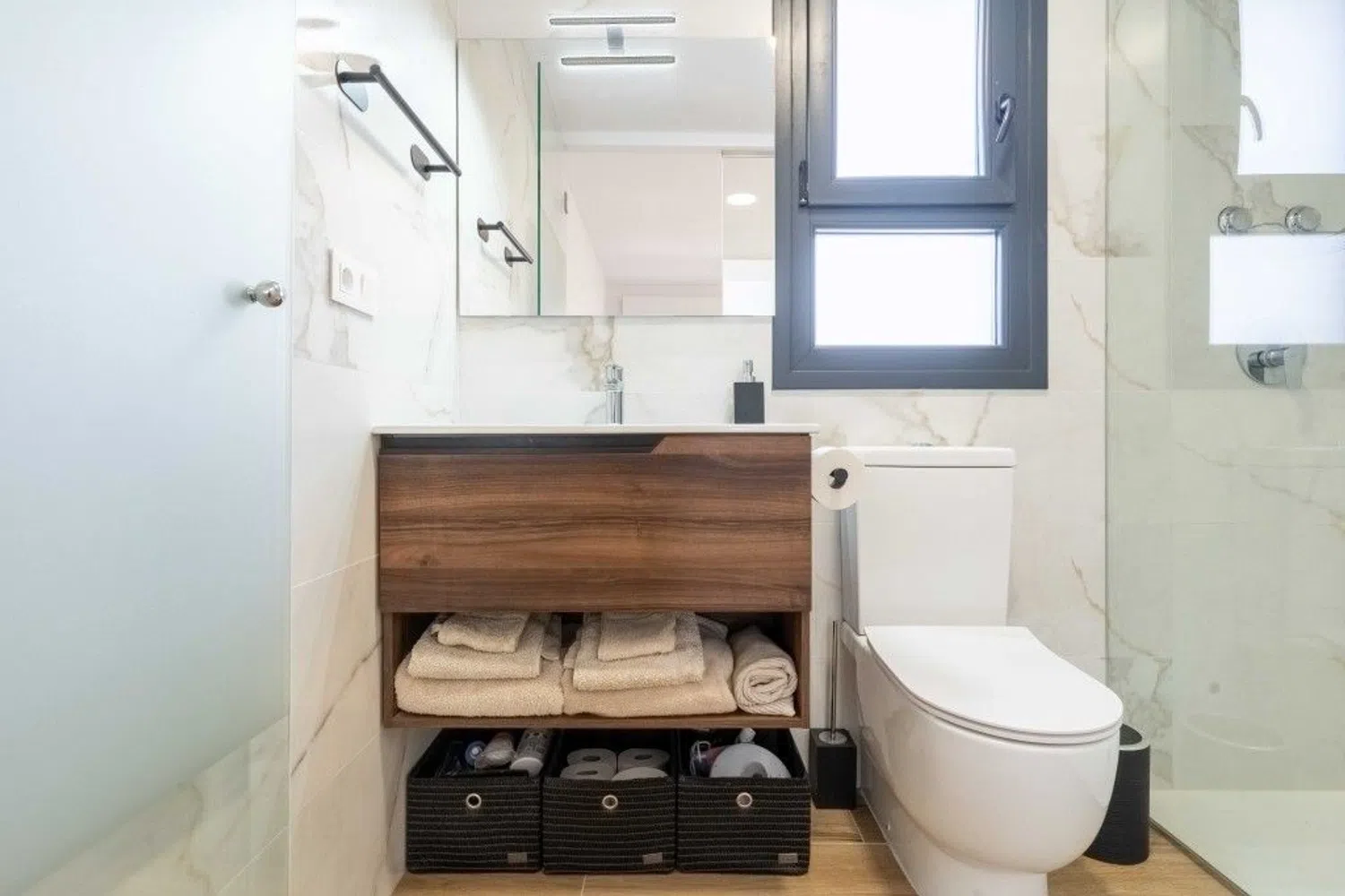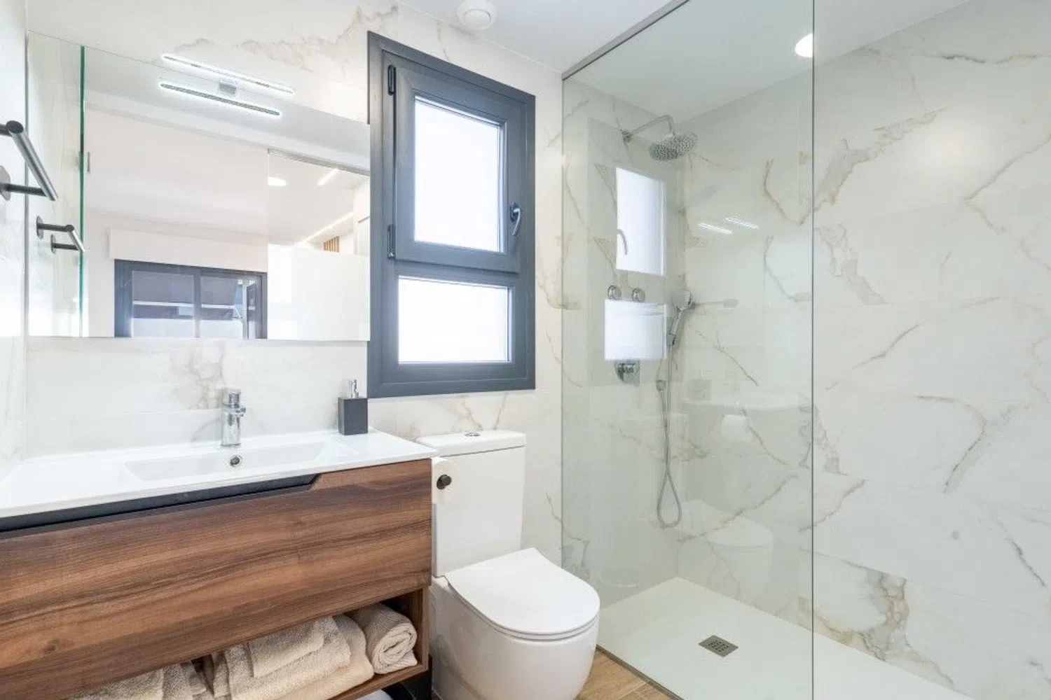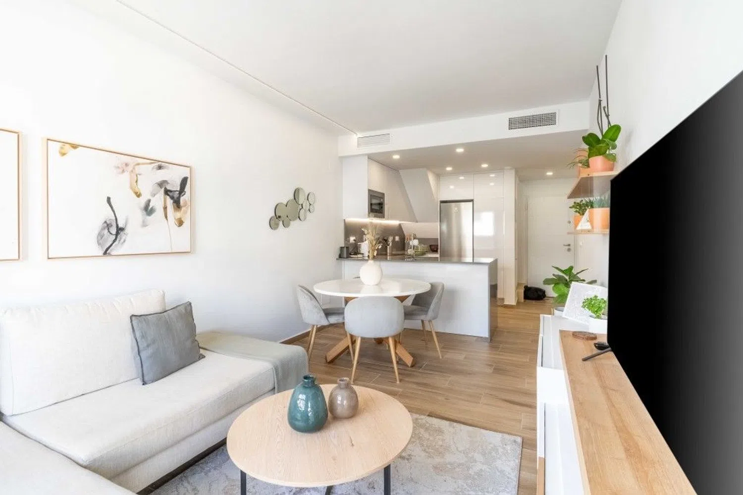 Przestronny i jasny apartament został starannie urządzony oraz umeblowany z wyczuciem stylu. Składa się z salonu z jadalnią i dużymi drzwiami prowadzącymi na taras, w pełni wyposażonej otwartej kuchni, pięknej i przestronnej głównej sypialni z dostępem do tarasu oraz prywatnej łazienki, a także drugiej sypialni dla gości i osobnej łazienki. Wewnątrz znajduje się schody prowadzące na fantastyczny taras na dachu, z którego roztacza się widok na odległe morze. Taras wyposażony jest w przyjemną strefę wypoczynkową z rozsuwanym zadaszeniem, część do opalania oraz strefę jadalną z kuchnią na świeżym powietrzu, idealną do spożywania posiłków na zewnątrz.