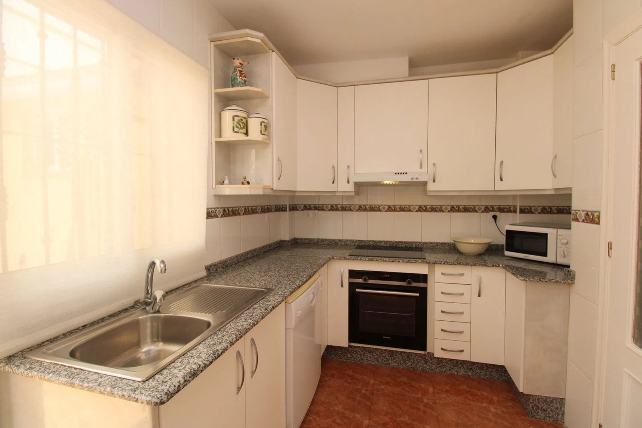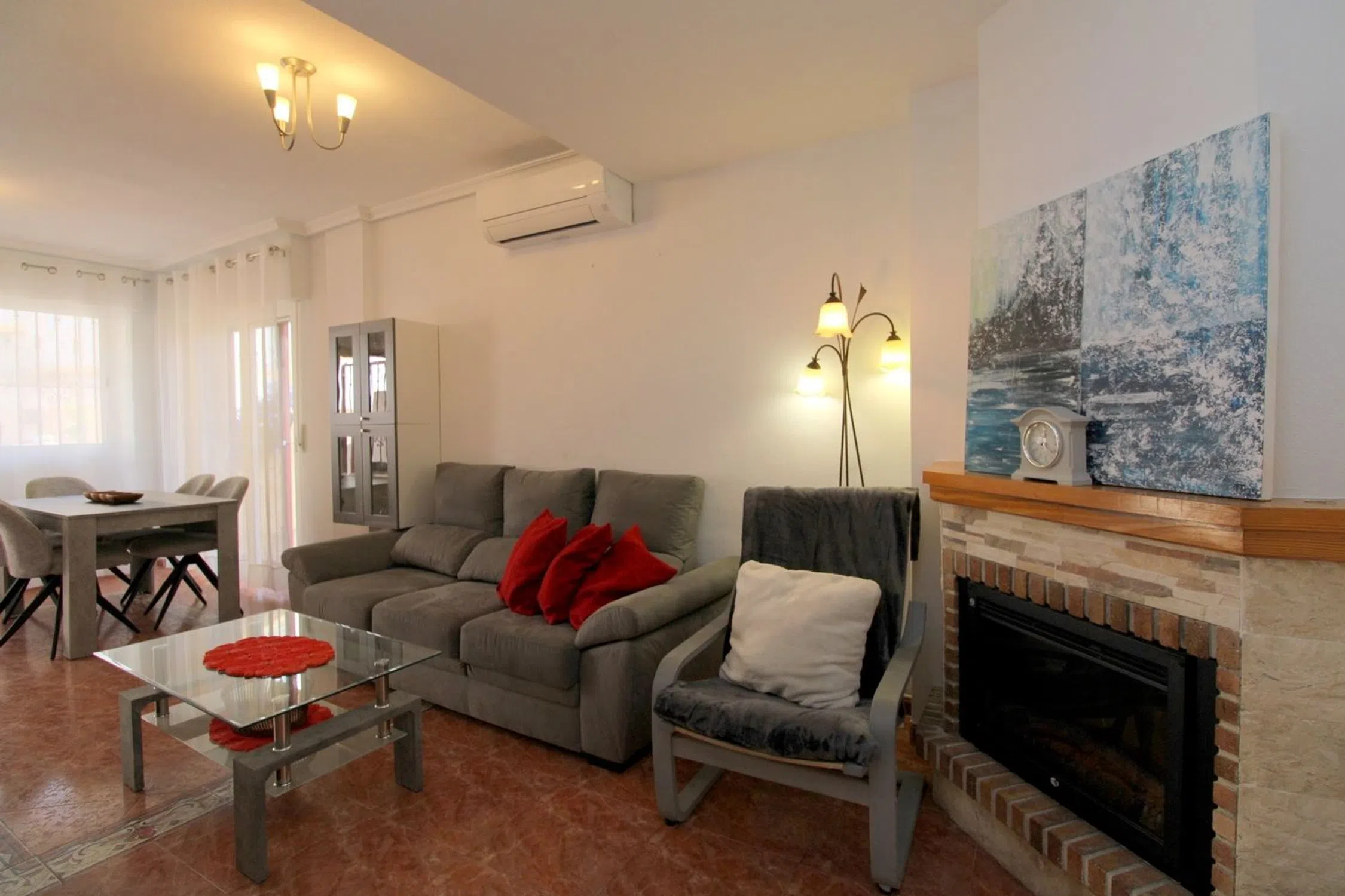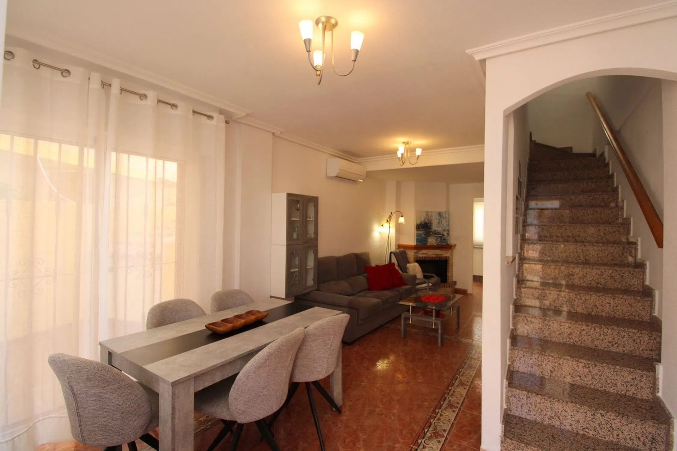 Esta espaciosa y bien cuidada villa adosada de 3 dormitorios y 2,5 baños está situada en una fantástica ubicación, en una comunidad cerrada en el corazón de La Zenia. A poca distancia a pie de una gran selección de servicios, incluyendo el impresionante centro comercial Zenia Boulevard y varias hermosas playas con bandera azul. La propiedad está situada en una esquina, lo que le permite disponer de una zona ajardinada exterior más amplia de lo habitual. El interior de la propiedad consta de un salón-comedor con chimenea eléctrica, una cocina independiente de buen tamaño y un jardín trasero con un práctico lavadero/aseo. Las escaleras internas del salón conducen a la primera planta, que cuenta con un dormitorio doble y un dormitorio de matrimonio con una terraza envolvente que une ambas habitaciones desde el exterior y un cuarto de baño familiar. Las escaleras internas conducen a la planta superior, que consta de un amplio dormitorio principal con baño en suite y una terraza soleada. Aquí se disfruta del sol durante todo el día, lo que lo convierte en un espacio perfecto para disfrutar del sol en privado en cualquier momento. El jardín trasero ofrece un gran espacio para disfrutar con la familia y los amigos, hacer una barbacoa y disfrutar del agradable clima mediterráneo. Las escaleras del jardín trasero conducen a un amplio sótano privado, que cuenta con un garaje y un trastero. Otras ventajas son el aire acondicionado frío y caliente y una atractiva piscina comunitaria. La villa se vende amueblada. Por qué nos encanta: Se trata de una bonita propiedad en el corazón de La Zenia. Se puede ir andando a la mayoría de los servicios, lo que la hace ideal para uso vacacional. La ubicación en esquina dentro de la urbanización le proporciona un espacio exterior adicional, perfecto para su uso durante todo el año.