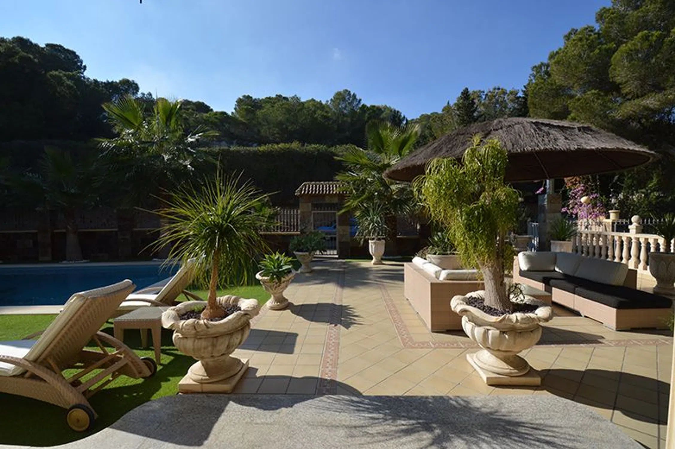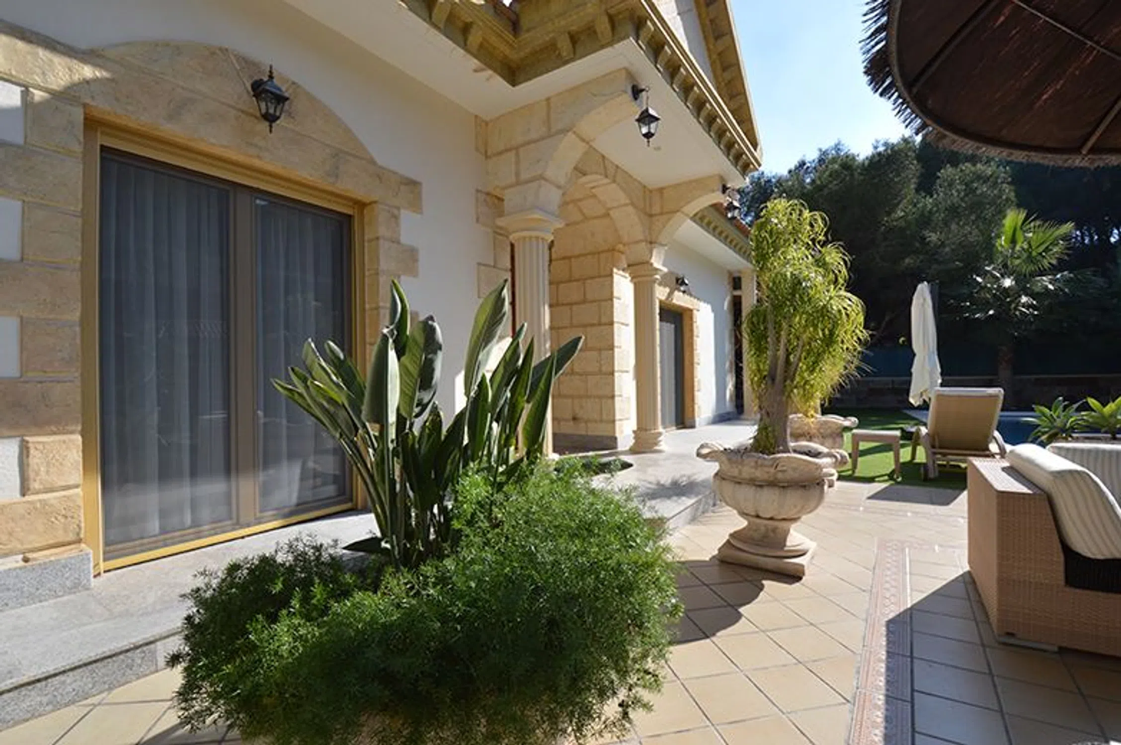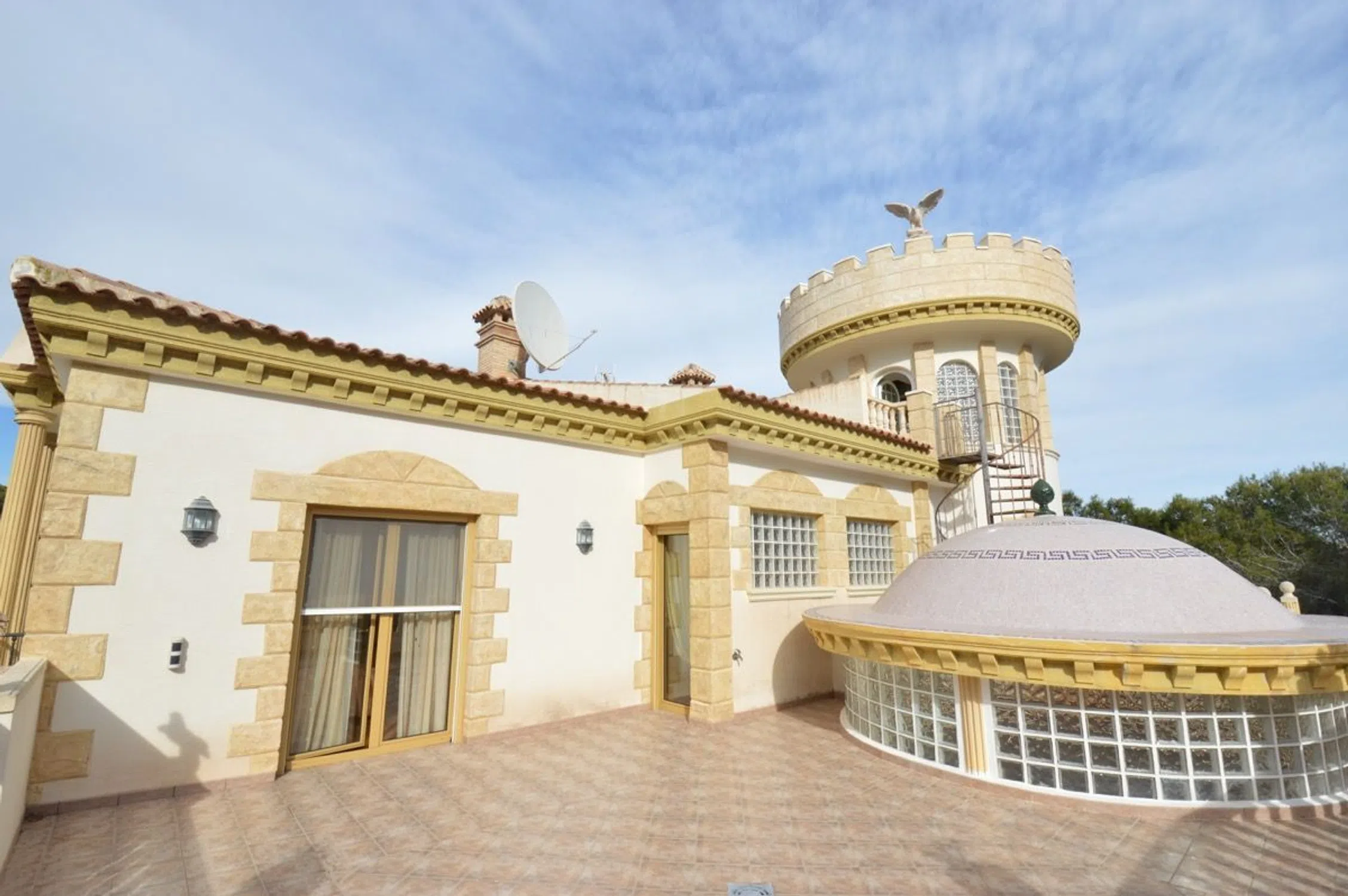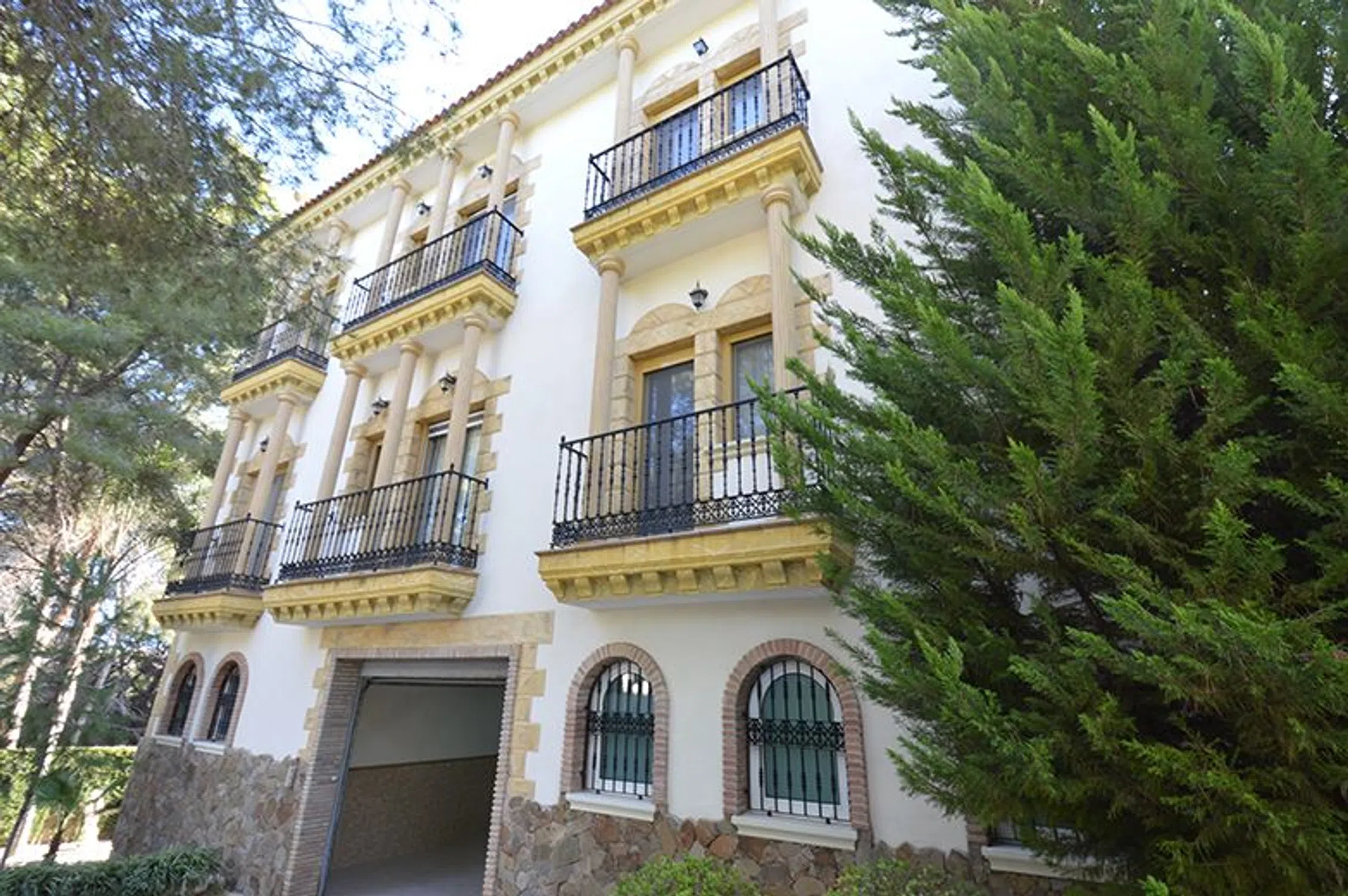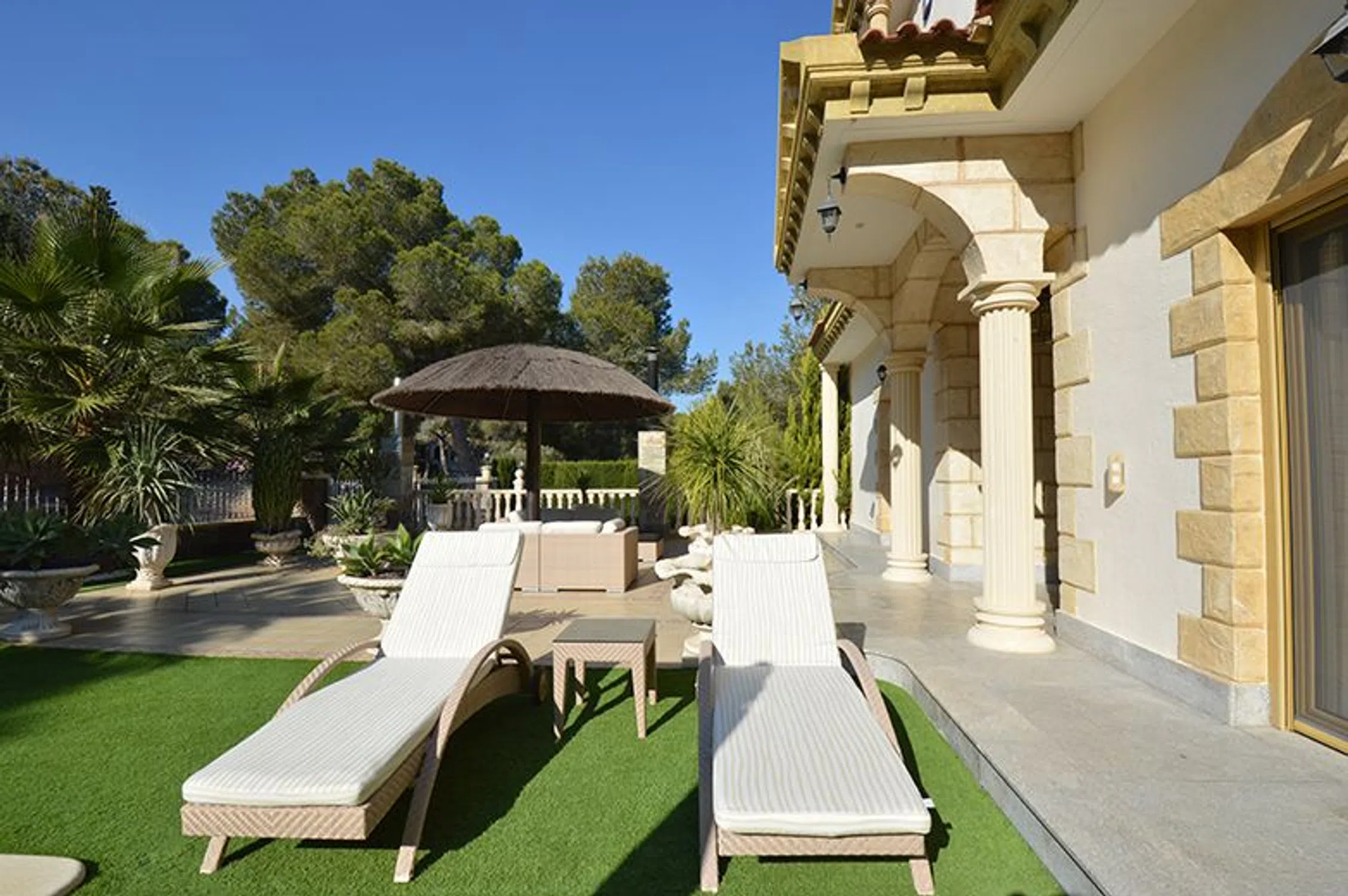 Chalet de lujo en Costa Blanca Villa a 100 m del mar en Campoamor, Orihuela Costa Visita virtual, click aquí. Esta impresionante villa de lujo se ubica en una gran parcela de 890m2 a solo 200 m de la playa en la lujosa urbanización Campoamor en el término de Orihuela. Se trata de una casa en dos plantas más el sótano, con una superficie construida de 575m2 de altísima calidad. Una villa especial en el corazón de Campoamor: Desde fuera, la fachada de esta singular propiedad recuerda más a la de un castillo que un chalet cualquiera. Detalles como el torreón donde los más aventureros pueden disfrutar de unas impresionantes vistas o los pequeños balcones de los que dispone cada dormitorio, junto con una fachada simétrica y decorada con columnas dan a esta gran villa su impronta inequívoca. Entrando al jardín desde la tranquila calle, donde se ubica este chalet a escasos metros del mar, le da la bienvenida una zona de estar al aire libre bajo una gran sombrilla a su izquierda y una piscina de 12m x 6m a su derecha. Al fondo hay un porche con su barbacoa. Entrando en la villa, enseguida llama la atención el suelo de mármol con cuidados mosaicos y detalles de madera que dan a toda la villa un aire sofisticado y rústico. Hacia la izquierda está la cocina y a la derecha se abre al amplísimo salón con comedor y bar. Desde aquí hay acceso al jardín, la piscina y el porche cubierto con barbacoa. A lo largo del pasillo encontrará un baño para invitados, un dormitorio completo con su baño privado y al fondo el ascensor que conecta todas las plantas de este chalet de lujo en Campoamor. En la planta alta hay 3 dormitorios, cada uno con su propio baño. Destaca sobre todo el dormitorio principal por su gran amplitud y su exclusivo baño con jacuzzi, rodeado de columnas de mármol verde. Cada dormitorio tiene acceso a un pequeño balcón y en el caso del dormitorio principal a la gran terraza que existe en la segunda planta. Desde todas las estancias se puede disfrutar de la pinada que rodea la casa y que es tan conocida y característica de esta exclusiva zona de Campoamor. La casa viene completamente amueblada y cuenta con ascensor, aire acondicionado, calefacción central, bodega, garaje para varios coches y un sótano que hará las delicias de cualquier persona que busque un gran espacio para disfrutar ya sea de su hobby, una buena fiesta, o cualquier otra finalidad. La casa es perfecta para una gran familia. La zona de Campoamor, Orihuela Costa: Campoamor es una de las zonas de Orihuela Costa donde puede encontrar chalets de lujo cerca del mar y de la playa. Sus cuidadas calles están rodeadas de villas con grandes jardines y amplios espacios, que junto con la poca distancia que les separa del mar y de una concurrida zona de ocio de Campoamor, donde podrá encontrar todo lo necesario, hacen de Campoamor una de las mejores zonas para vivir. Si desea recibir más información o concertar una visita, no dude en ponerse en contacto con Mevilla.