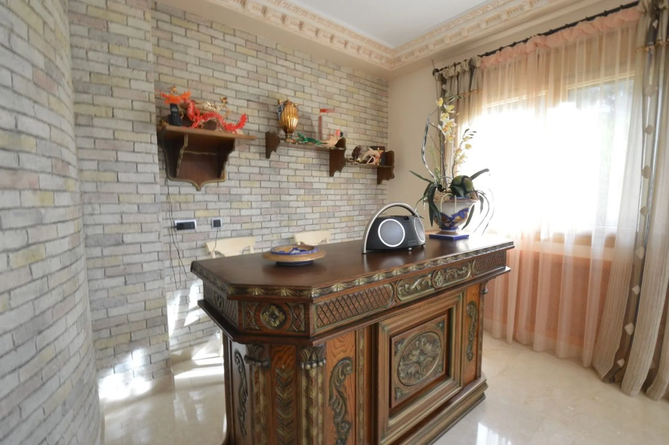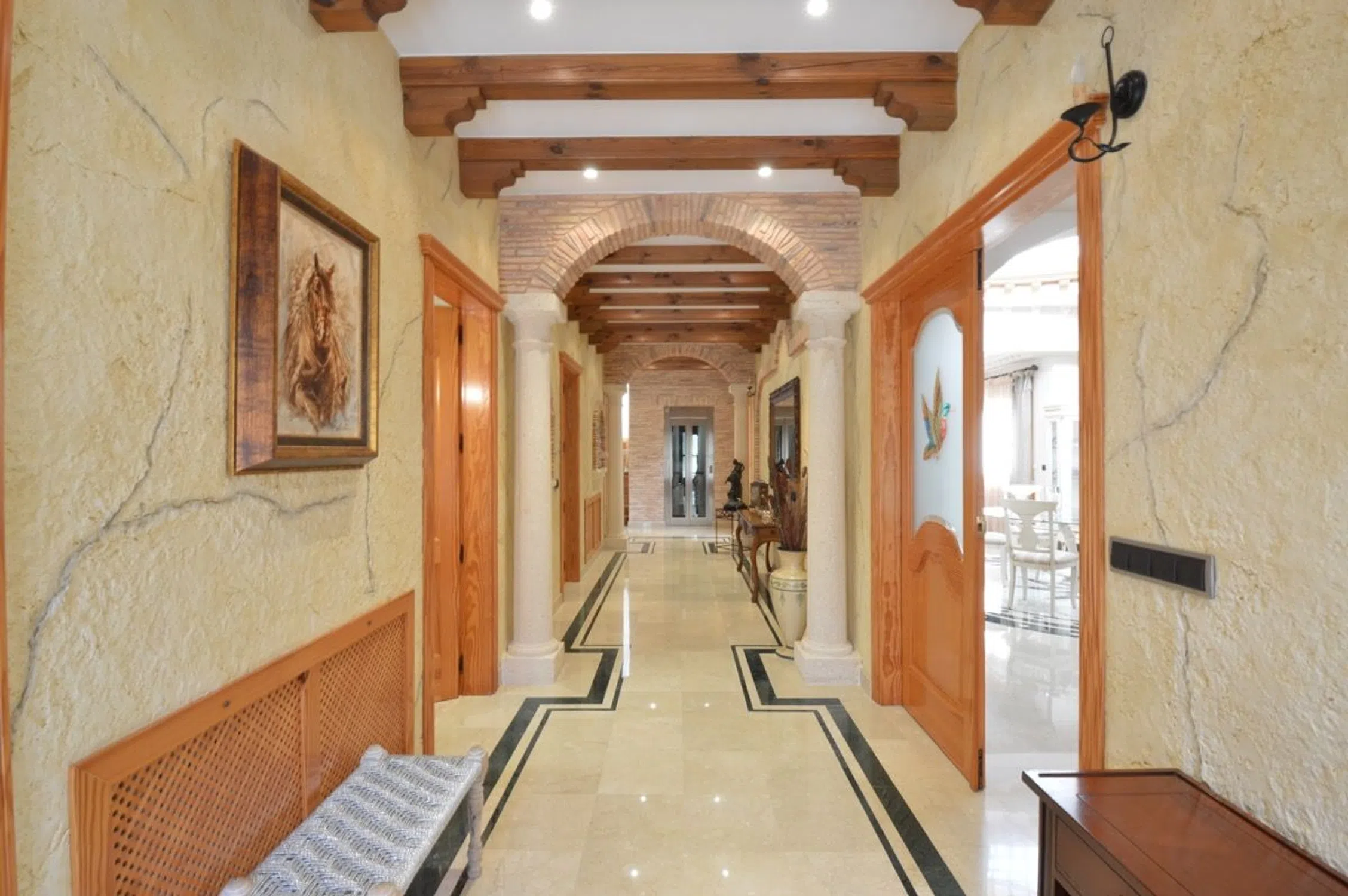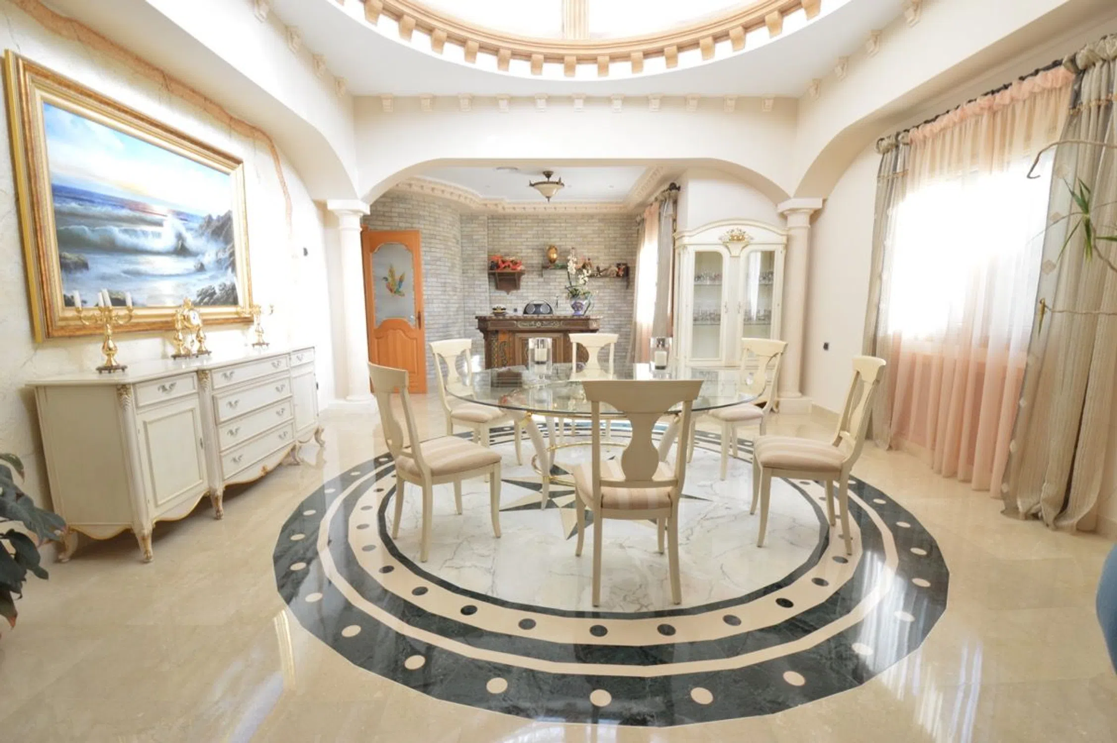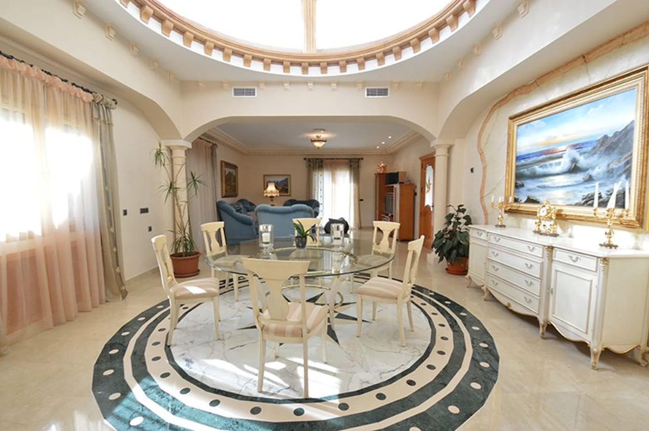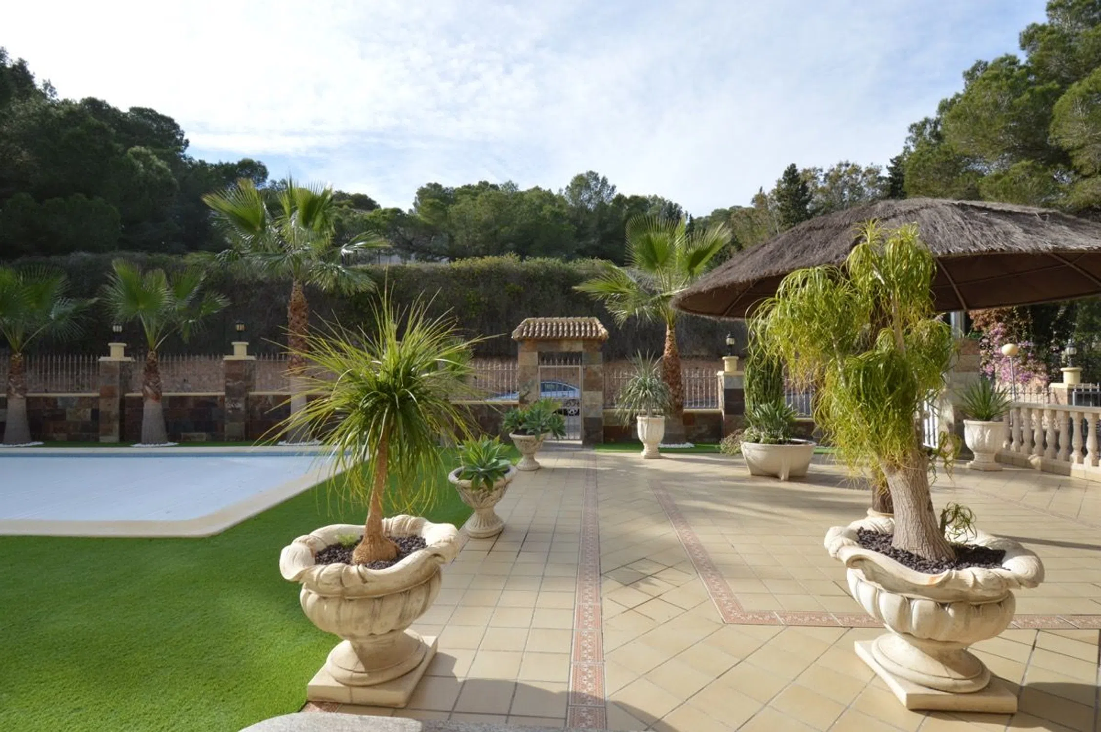 Chalet de lujo en Costa Blanca Villa a 100 m del mar en Campoamor, Orihuela Costa Visita virtual, click aquí. Esta impresionante villa de lujo se ubica en una gran parcela de 890m2 a solo 200 m de la playa en la lujosa urbanización Campoamor en el término de Orihuela. Se trata de una casa en dos plantas más el sótano, con una superficie construida de 575m2 de altísima calidad. Una villa especial en el corazón de Campoamor: Desde fuera, la fachada de esta singular propiedad recuerda más a la de un castillo que un chalet cualquiera. Detalles como el torreón donde los más aventureros pueden disfrutar de unas impresionantes vistas o los pequeños balcones de los que dispone cada dormitorio, junto con una fachada simétrica y decorada con columnas dan a esta gran villa su impronta inequívoca. Entrando al jardín desde la tranquila calle, donde se ubica este chalet a escasos metros del mar, le da la bienvenida una zona de estar al aire libre bajo una gran sombrilla a su izquierda y una piscina de 12m x 6m a su derecha. Al fondo hay un porche con su barbacoa. Entrando en la villa, enseguida llama la atención el suelo de mármol con cuidados mosaicos y detalles de madera que dan a toda la villa un aire sofisticado y rústico. Hacia la izquierda está la cocina y a la derecha se abre al amplísimo salón con comedor y bar. Desde aquí hay acceso al jardín, la piscina y el porche cubierto con barbacoa. A lo largo del pasillo encontrará un baño para invitados, un dormitorio completo con su baño privado y al fondo el ascensor que conecta todas las plantas de este chalet de lujo en Campoamor. En la planta alta hay 3 dormitorios, cada uno con su propio baño. Destaca sobre todo el dormitorio principal por su gran amplitud y su exclusivo baño con jacuzzi, rodeado de columnas de mármol verde. Cada dormitorio tiene acceso a un pequeño balcón y en el caso del dormitorio principal a la gran terraza que existe en la segunda planta. Desde todas las estancias se puede disfrutar de la pinada que rodea la casa y que es tan conocida y característica de esta exclusiva zona de Campoamor. La casa viene completamente amueblada y cuenta con ascensor, aire acondicionado, calefacción central, bodega, garaje para varios coches y un sótano que hará las delicias de cualquier persona que busque un gran espacio para disfrutar ya sea de su hobby, una buena fiesta, o cualquier otra finalidad. La casa es perfecta para una gran familia. La zona de Campoamor, Orihuela Costa: Campoamor es una de las zonas de Orihuela Costa donde puede encontrar chalets de lujo cerca del mar y de la playa. Sus cuidadas calles están rodeadas de villas con grandes jardines y amplios espacios, que junto con la poca distancia que les separa del mar y de una concurrida zona de ocio de Campoamor, donde podrá encontrar todo lo necesario, hacen de Campoamor una de las mejores zonas para vivir. Si desea recibir más información o concertar una visita, no dude en ponerse en contacto con Mevilla.