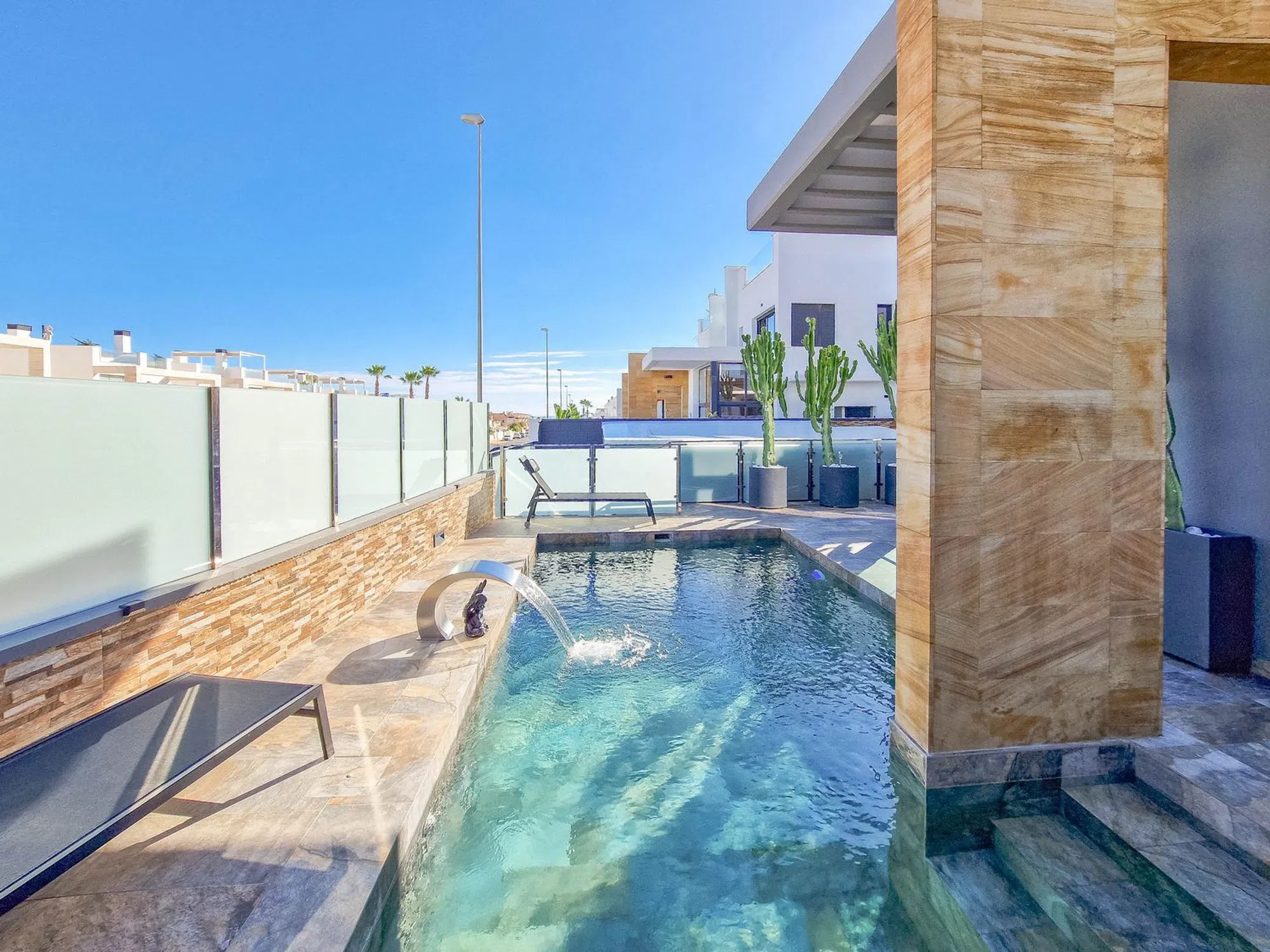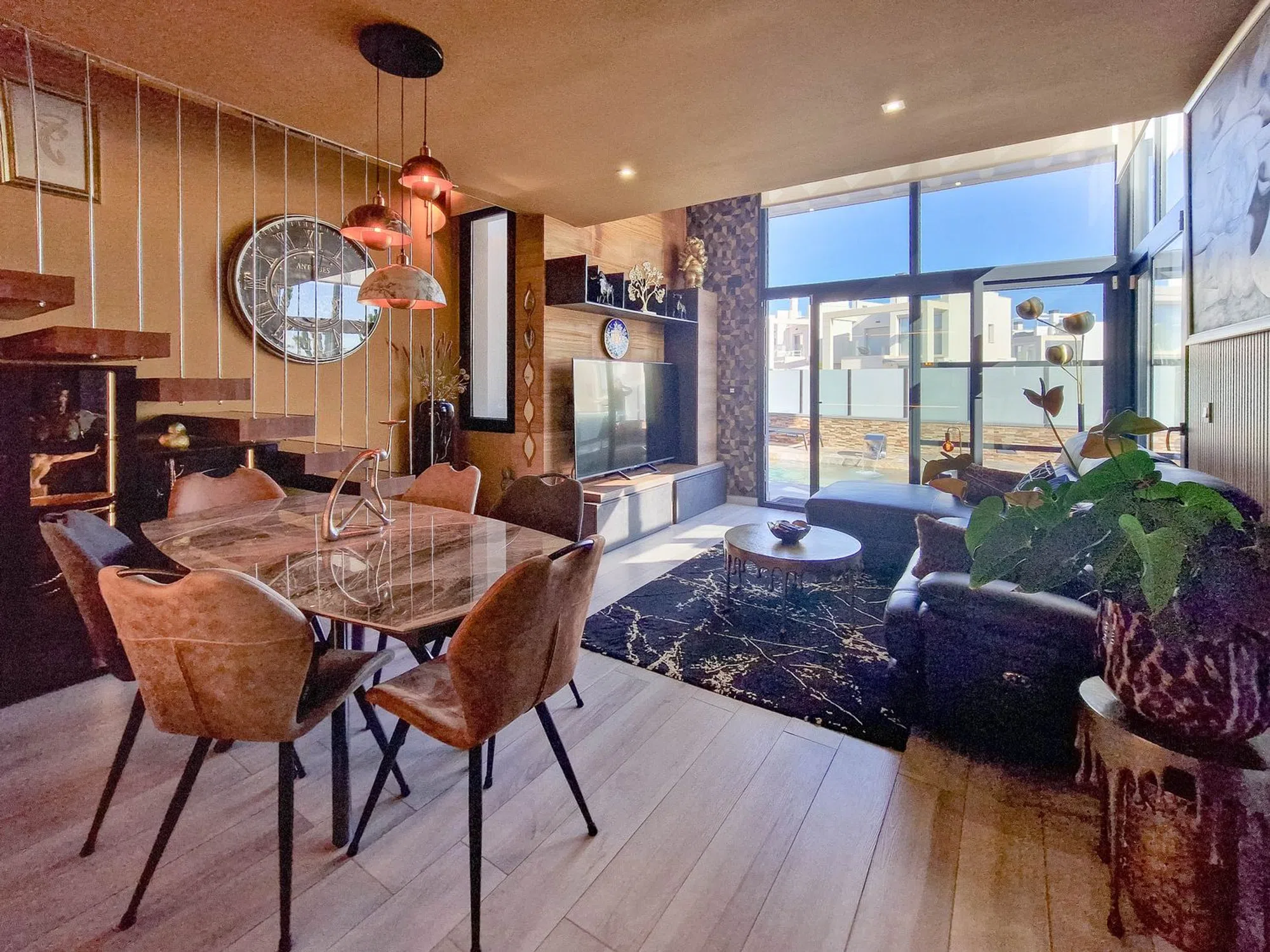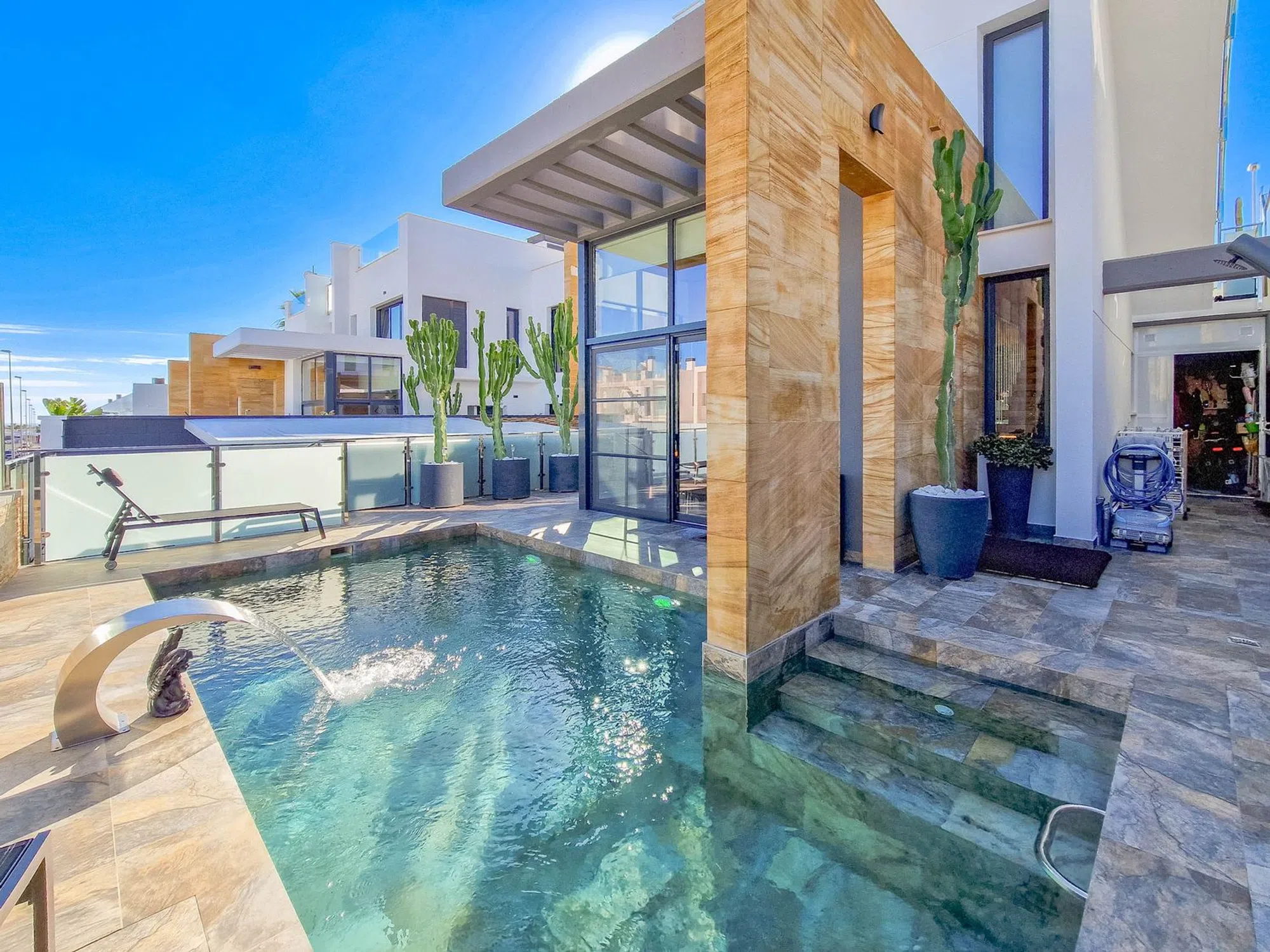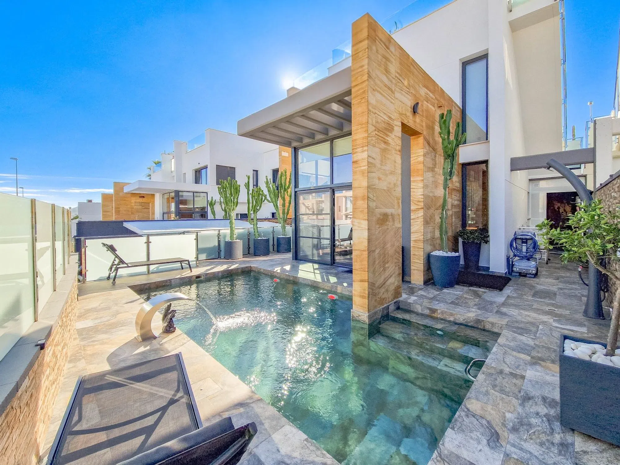Chalet con piscina privada Hermosa villa en Lomas de Cabo Roig con piscina privada, 3 dormitorios y 3 baños. Su interior destaca por un diseño moderno y decoración elegante con doble altura de techo en la sala de estar y escaleras de bonito diseño hasta la planta superior. Dispone de solárium con vistas al mar, perfecto para disfrutar del clima mediterráneo, paneles solares instalados y aparcamiento dentro de la propiedad. Excelente ubicacion muy cerca de una zona de restaurantes, bares y supermercado. las playas de Cabo Roig a escazos 5 minutos en coche. Una vivienda ideal para quienes buscan estilo, confort y privacidad en una ubicación privilegiada.