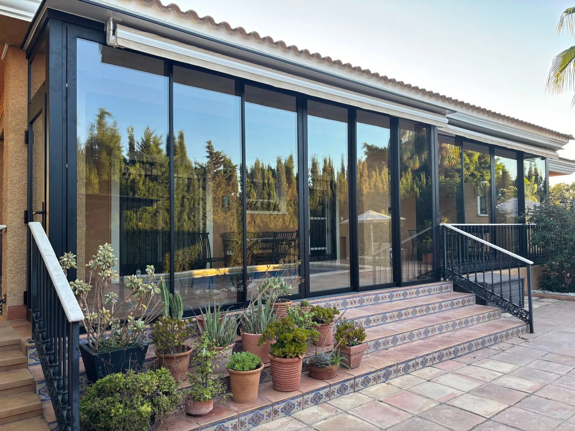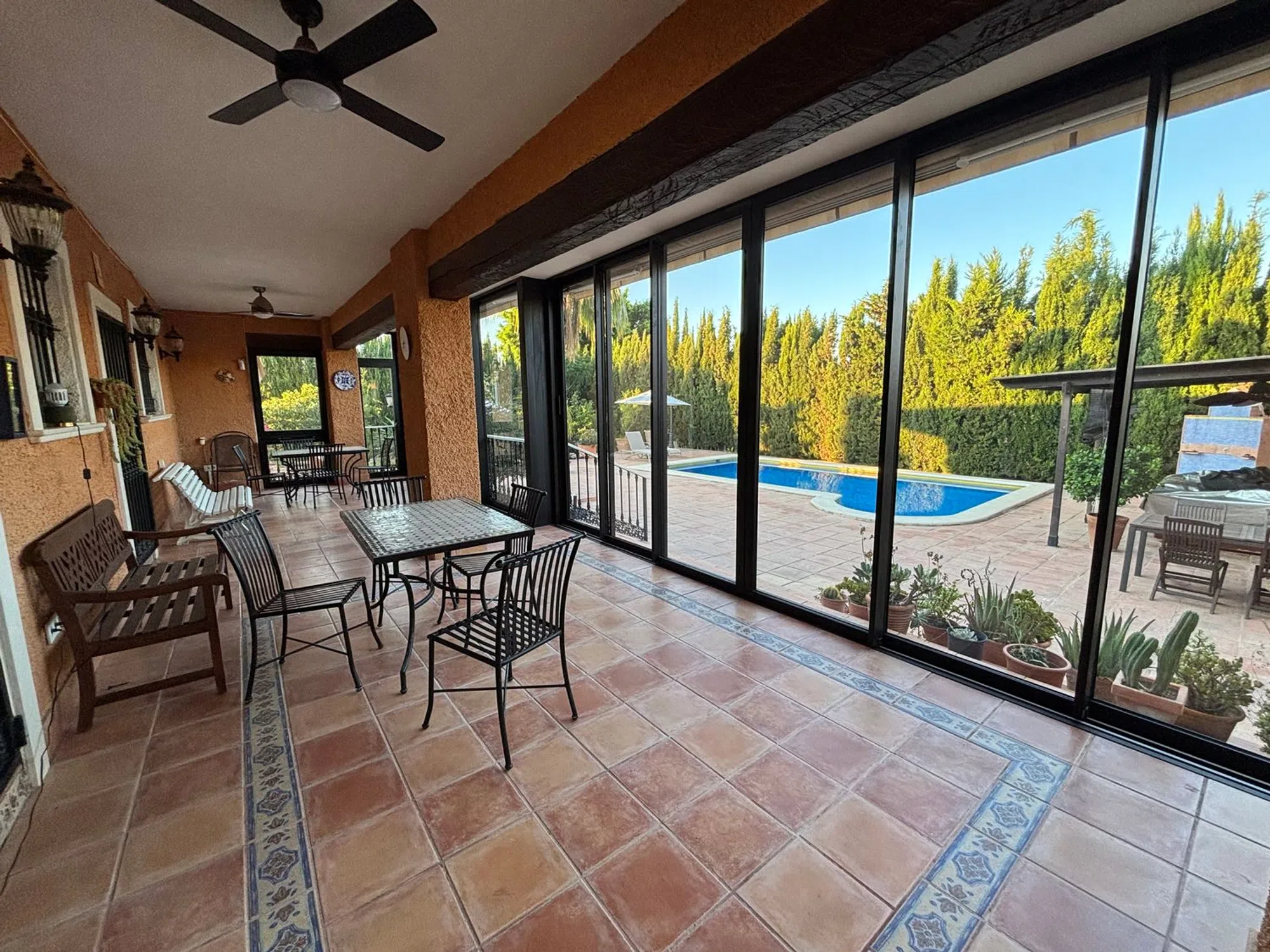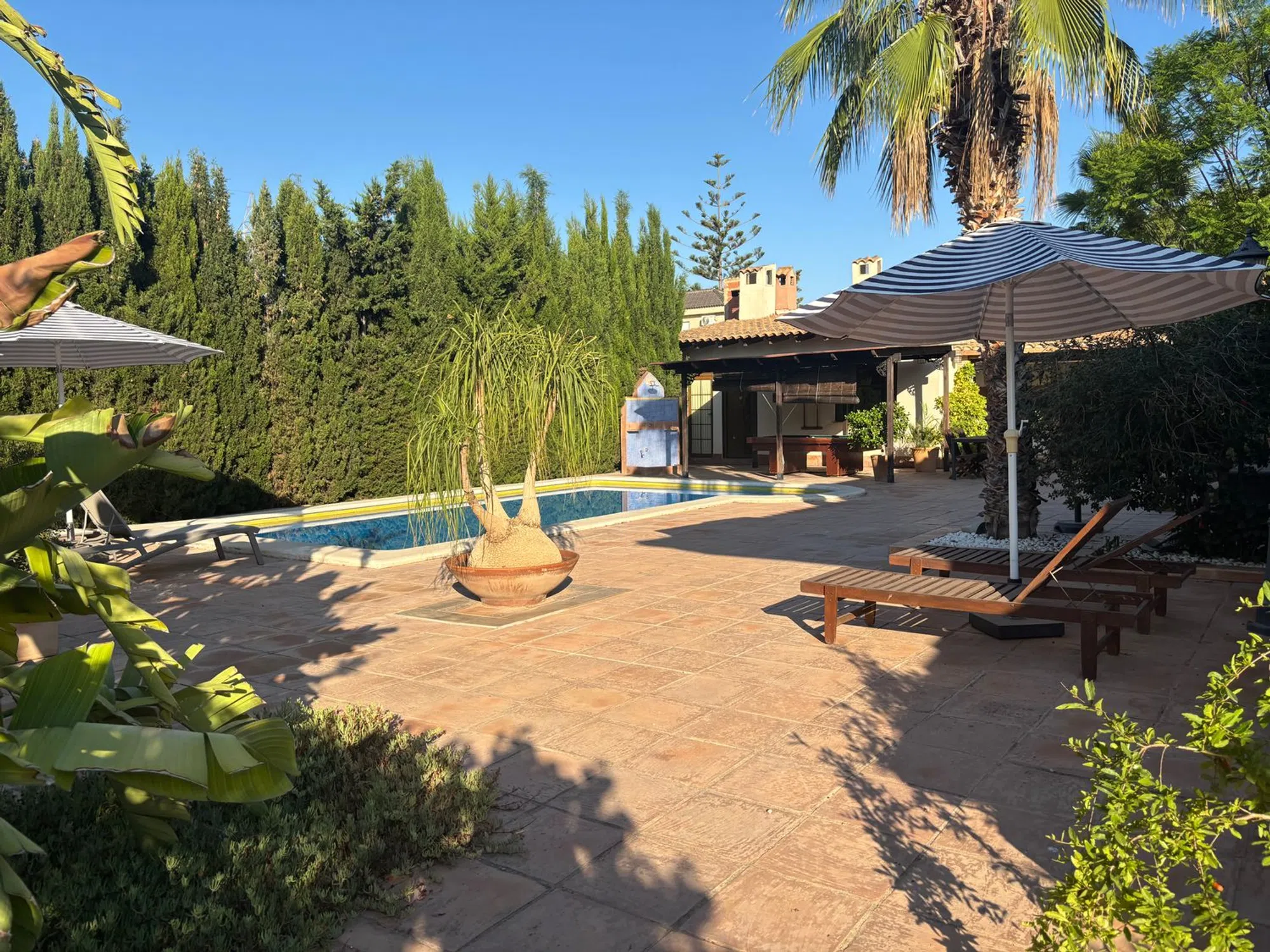 Excepcional chalet independiente en una sola planta con detalles de calidad difíciles de encontrar en la provincia de Alicante. Destaca su amplio jardín soleado, con bonita piscina, zona de chill out y diferentes especies de plantas, arboles y flores. En esta zona exterior además existe un edificio anexo con una segunda cocina con horno de leña y un baño, además de una zona de barbacoa. Todo ello muy cuidado y agradable para disfrutar. Mirando al jardín se encuentra un práctico porche que por la orientación, dimensiones y su cerramiento móvil de alta calidad, proporciona un área aprovechable todo el año. La vivienda principal consta de amplio salón con chimenea de mármol, 4 habitaciones, una de ellas con vestidor y baño en suite, gran cocina y un tercer cuarto de baño (2 interiores y uno en zona exterior). En el semisótano hay un estudio loft multiusos, así como un práctico trastero. La parcela está localizada a pocos metros de una parada de bus y de las tiendas de Los Girasoles La calefacción por radiadores con caldera de gasoil exterior, el aire acondicionado en splits repartidos por varias áreas de la casa, los toldos eléctricos y la calidad de los materiales de la construcción interna y externa, completan una oferta excepcional. ABSTENERSE AGENCIAS POR FAVOR.