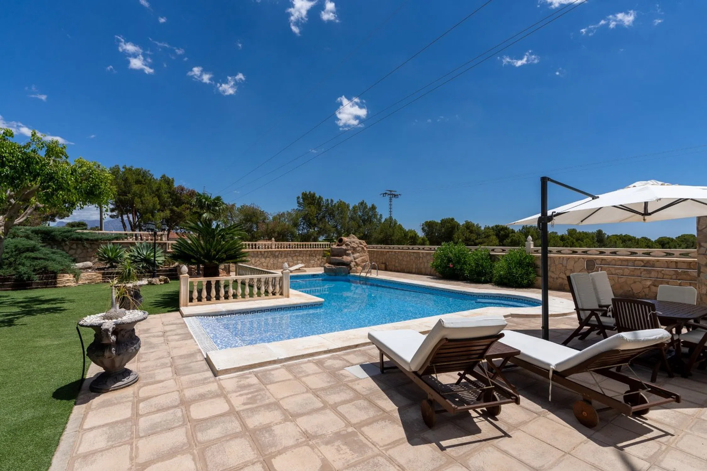 ¡Tu Paraíso en San Vicente del Raspeig te Espera! Estamos orgullosos de presentar este fabuloso y exclusivo chalet en San Vicente del Raspeig, donde la comodidad, el espacio y el diseño se combinan para ofrecerte un hogar verdaderamente acogedor. Situada en una parcela de 2050m² meticulosamente cuidada, esta espectacular propiedad de 450m² está rodeada de árboles, palmeras, y zonas exteriores ideales para disfrutar del clima soleado de Alicante. Al lado de la estupenda piscina con cascada de agua y jacuzzi, encontrarás una acogedora mesa perfecta para desayunos al aire libre. Al otro costado, los pinos y mesas de madera invitan a compartir momentos inolvidables con familiares y amigos. Además, el exterior cuenta con una casa con un amplio comedor, barbacoa y horno de leña. Interiores Lujosos y Funcionales Al entrar, te recibe una hermosa terraza que da paso a un amplio salón-comedor, diseñado con detalles únicos. La cocina independiente, equipada con todo lo necesario, tiene salida a la terraza. Esta planta también incluye un baño completo y un despacho. En la primera planta encontrarás dos habitaciones. La primera cuenta con una terraza privada con vistas panorámicas de la parcela. La habitación principal tiene un balcón privado, baño en suite con jacuzzi, y un amplio vestidor. El sótano ofrece un amplio salón con barra, bodega, tres habitaciones con armarios empotrados, un cuarto de lavandería y un baño totalmente equipado. Calidad y Confort Esta propiedad única ha sido construida con materiales de primera calidad, ofreciendo el mejor aislamiento térmico. Cuenta con ventanas de doble acristalamiento, persianas motorizadas, calefacción por radiadores, y suelos de tarima flotante y gres porcelánico. Además, esta estupenda vivienda está perfectamente comunicada con la ciudad y las playas, disponiendo de todos los servicios necesarios a poca distancia. ¡Contáctanos! No pierdas la oportunidad de vivir en esta exclusiva vivienda en San Vicente del Raspeig. Ponte en contacto con nosotros, el equipo de Costa Blanca Eiendom estará encantado de ayudarte a hacer realidad tu sueño.