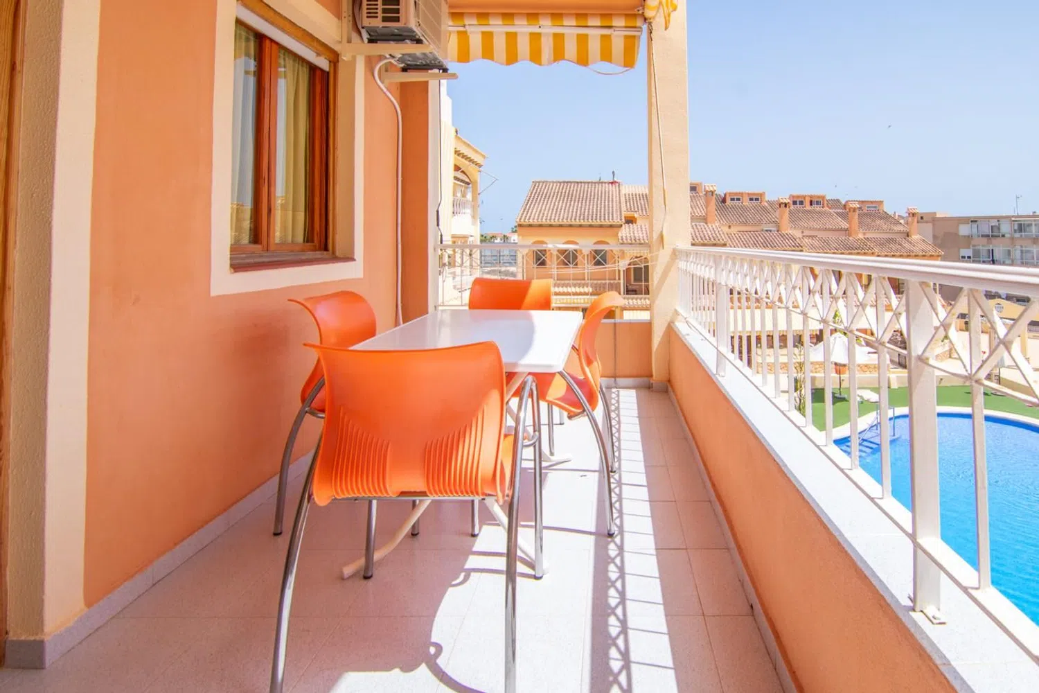 Dysponuje wspaniałym tarasem z widokiem na basen oraz bezpośrednim dostępem do przestronnego salonu połączonego z jadalnią, co razem z w pełni wyposażoną kuchnią stwarza przyjemną atmosferę. Główna sypialnia jest przestronna i posiada wbudowaną szafę, a druga sypialnia mieści dwie łóżka. Łazienka jest w pełni wyposażona, z nowoczesnym prysznicem.