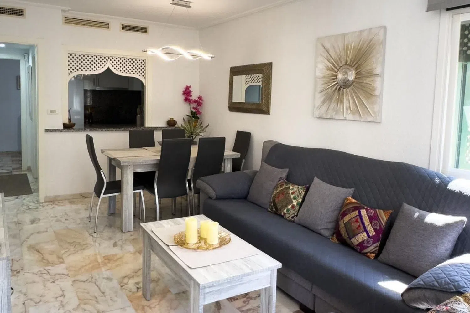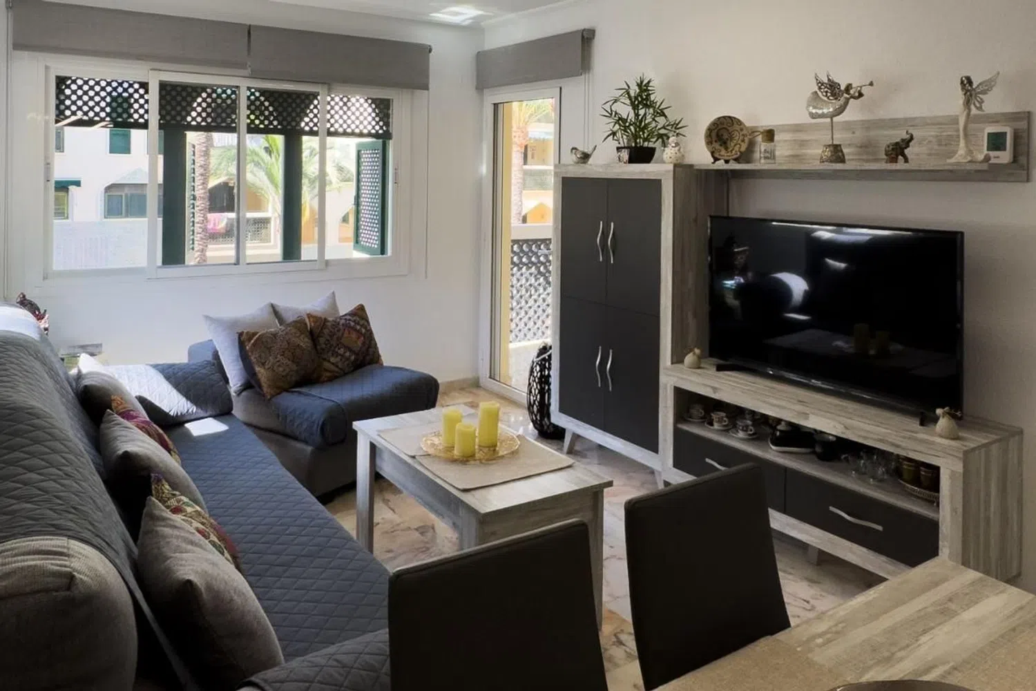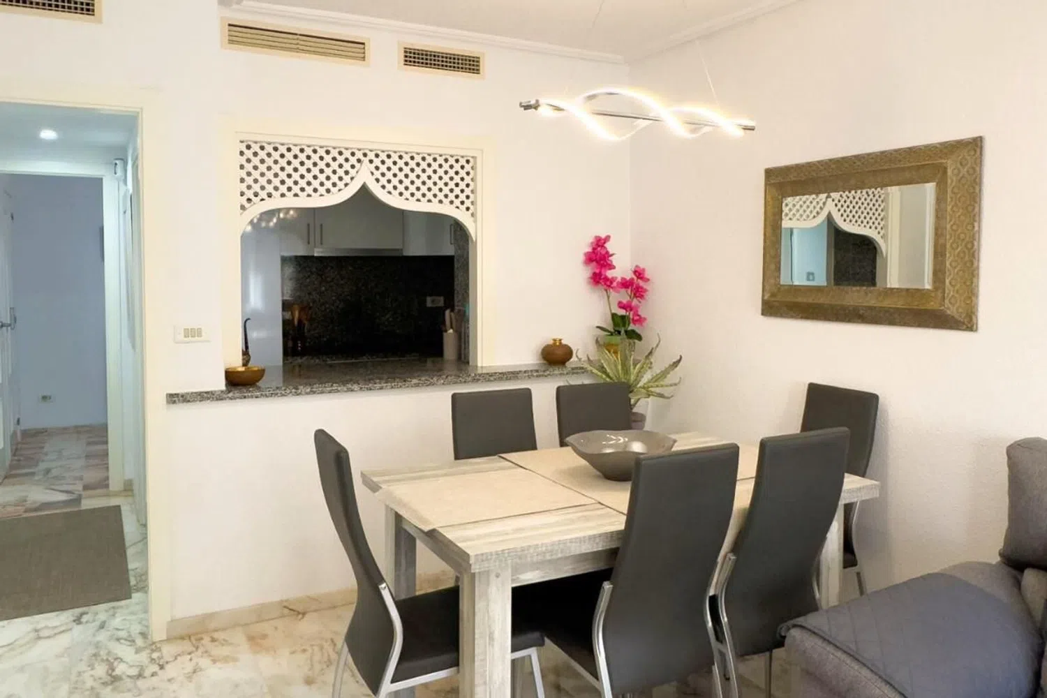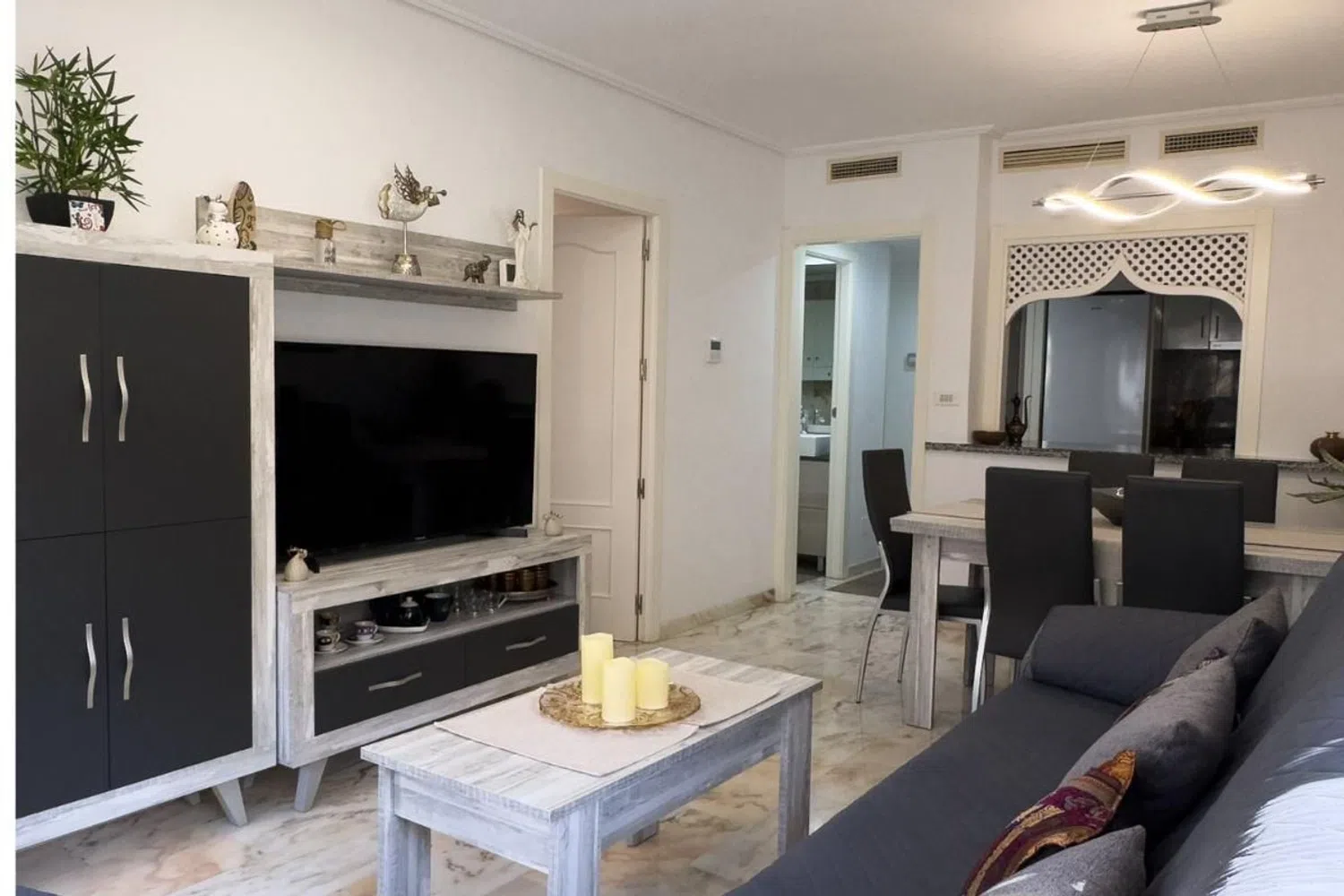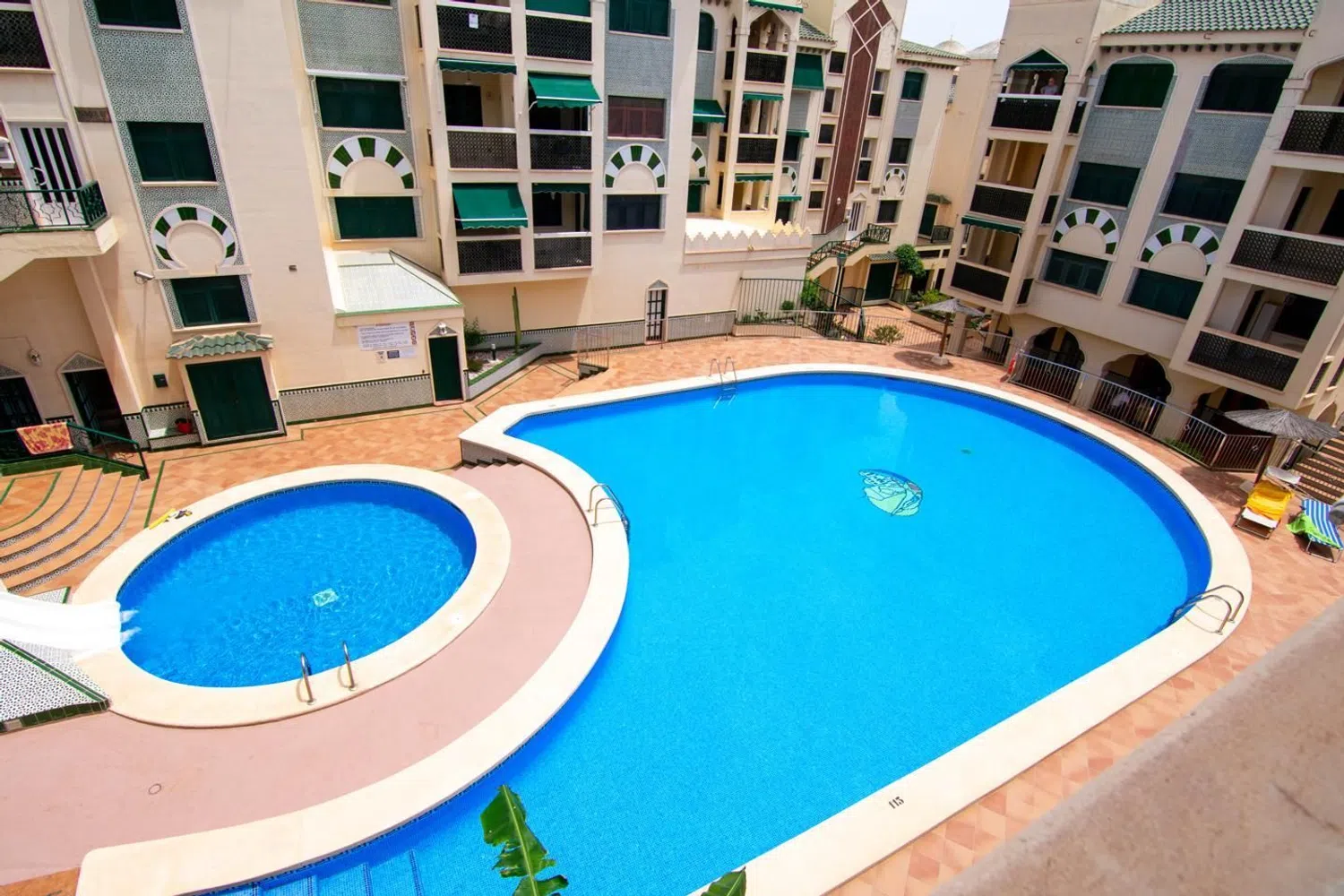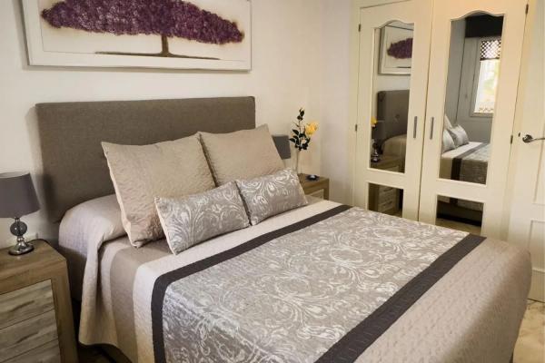 W tym apartamencie znajdują się dwie przestronne sypialnie z wbudowanymi szafami, które są umeblowane, oraz w pełni wyposażona łazienka z prysznicem. Całość mieści się w zamkniętym kompleksie z doskonałymi udogodnieniami, w tym wieloma basenami, w tym zjeżdżalniami, a także doskonałymi przestrzeniami rekreacyjnymi, co czyni go idealnym miejscem do korzystania z wspaniałego klimatu regionu. Lokalizacja mieszkania jest bardzo korzystna, znajduje się w spokojnej okolicy cieszącej się dużym zainteresowaniem, zaledwie krok od najpiękniejszej plaży, a w pobliżu znajduje się centrum handlowe z różnorodnymi usługami, w tym supermarketem, kinem i siłownią. Dodatkowo, blisko do centrum, które oferuje bogaty wybór usług oraz atrakcji gastronomicznych i rekreacyjnych.