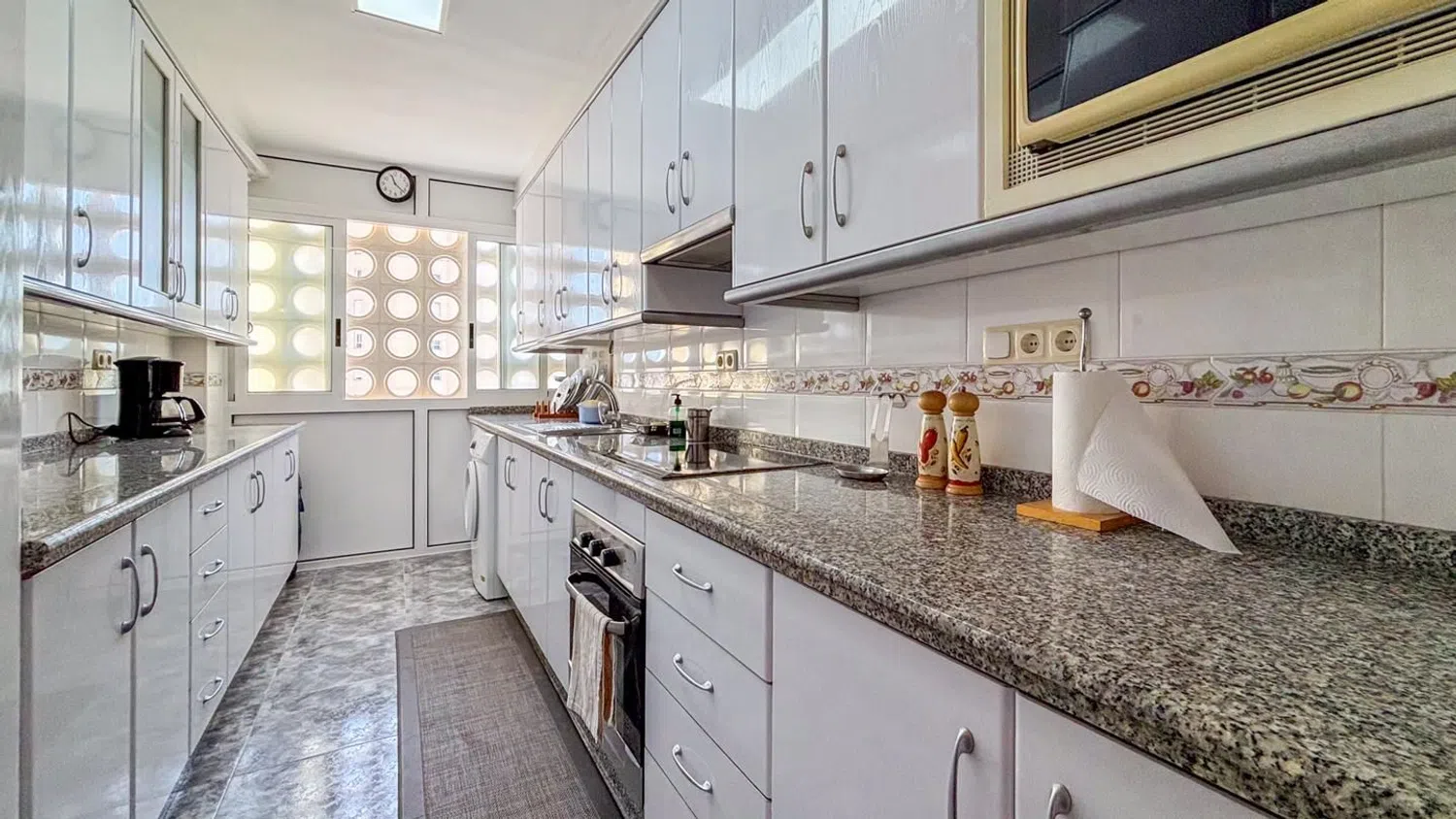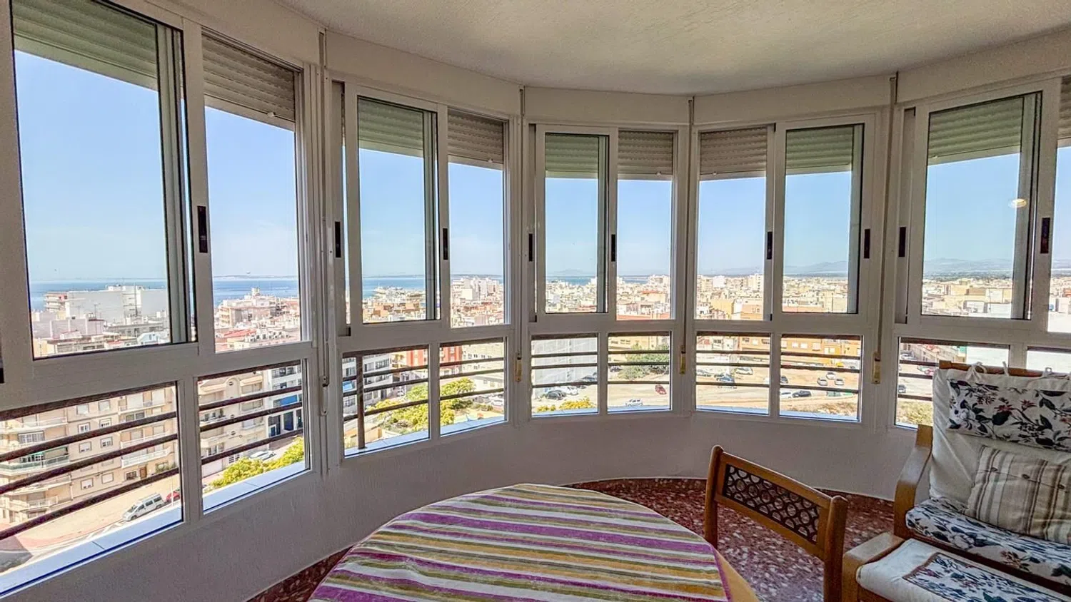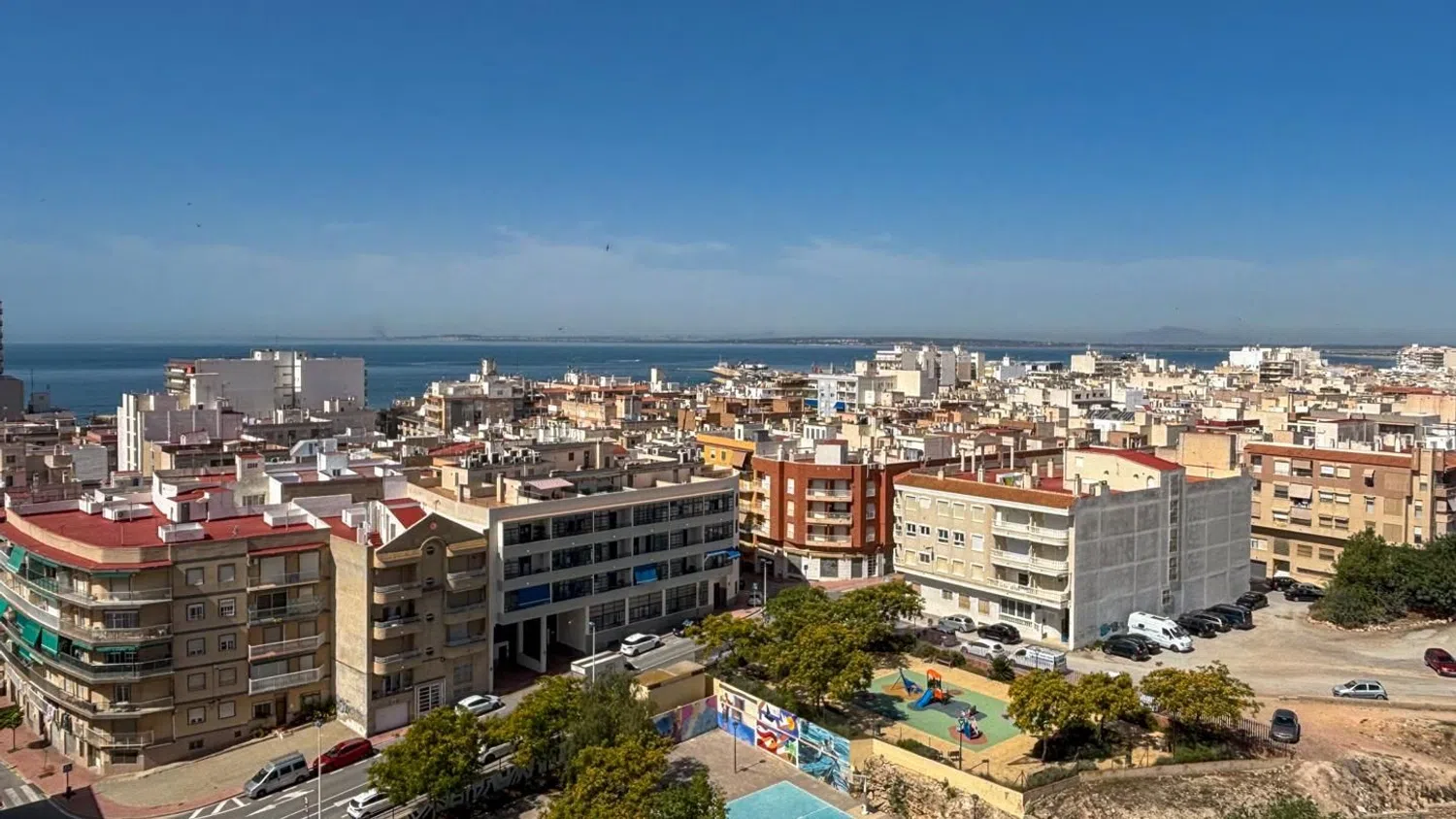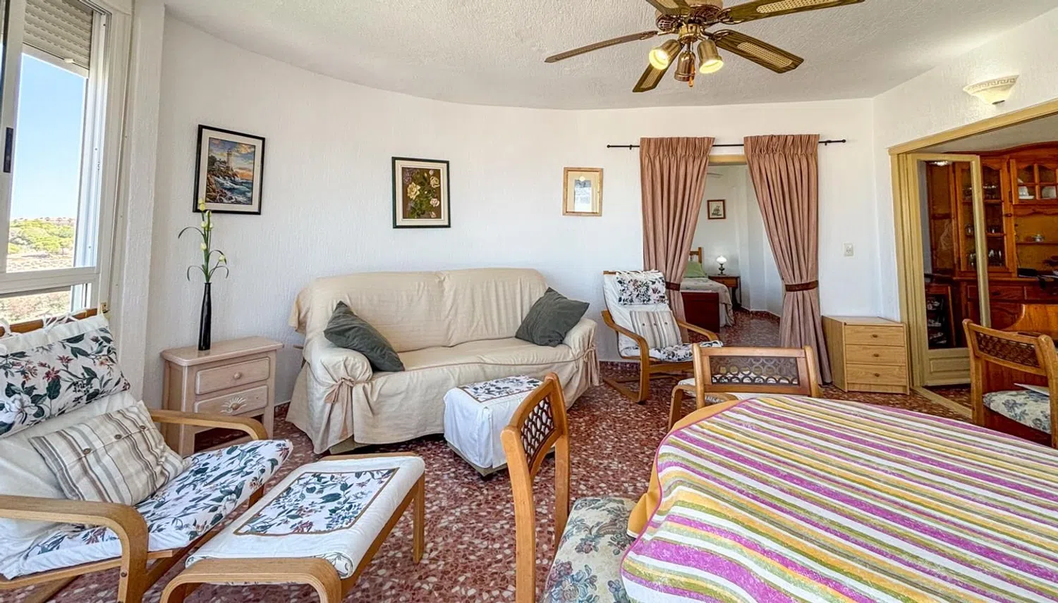 Przestronny apartament z 3 sypialniami i 2 łazienkami, oferujący malownicze widoki na morze, położony zaledwie kilka kroków od plaży. Znajduje się na ósmej piętrze budynku z windą, co zapewnia wygodny dostęp. Mieszkanie dysponuje dwiema miejscami parkingowymi - jedno zamknięte i prywatne, a drugie w strefie wspólnej. W okolicy dostępne są liczne zacienione tereny, dzięki bujnej roślinności oraz drzewom, a także różnorodne udogodnienia, takie jak boisko do koszykówki, place zabaw oraz wspólne prysznice.