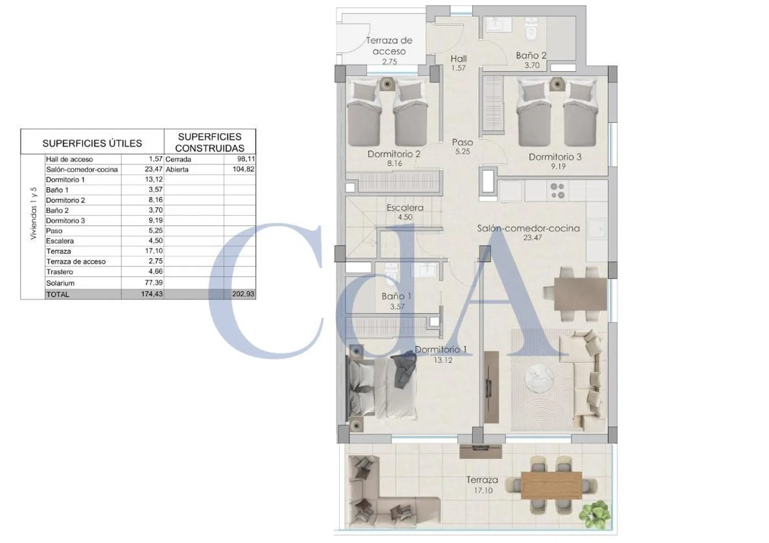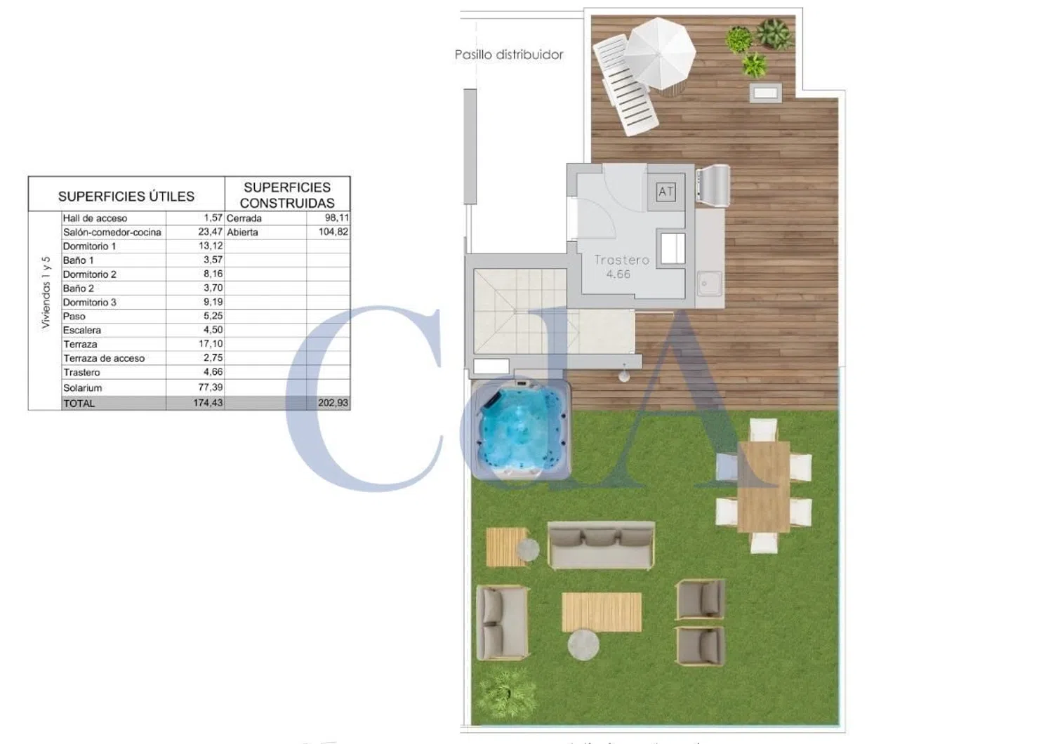 Ten piękny, narożny apartament na piątym piętrze o powierzchni 203 m2 oferuje trzypokojowe wnętrza oraz dwa nowoczesne łazienki. Na jego tarasie o powierzchni 17 m2 oraz rozległym solarium o powierzchni 77 m2 można podziwiać zapierające dech w piersiach widoki na morze, a także korzystać z jacuzzi.