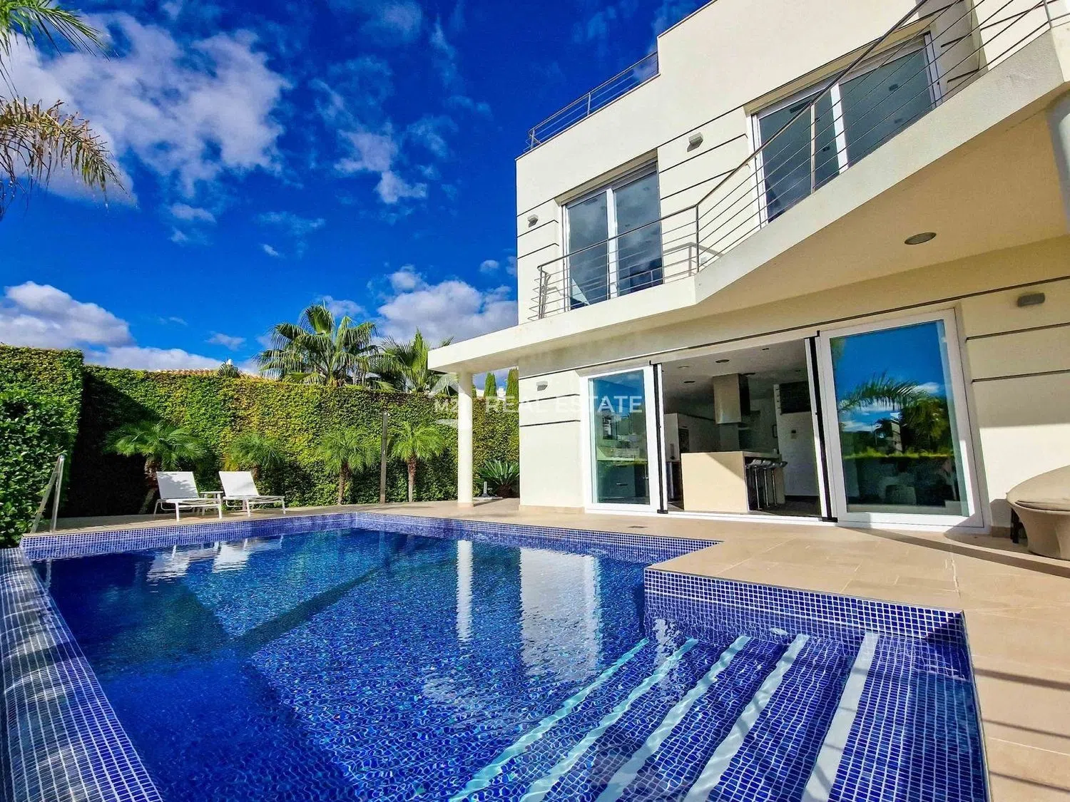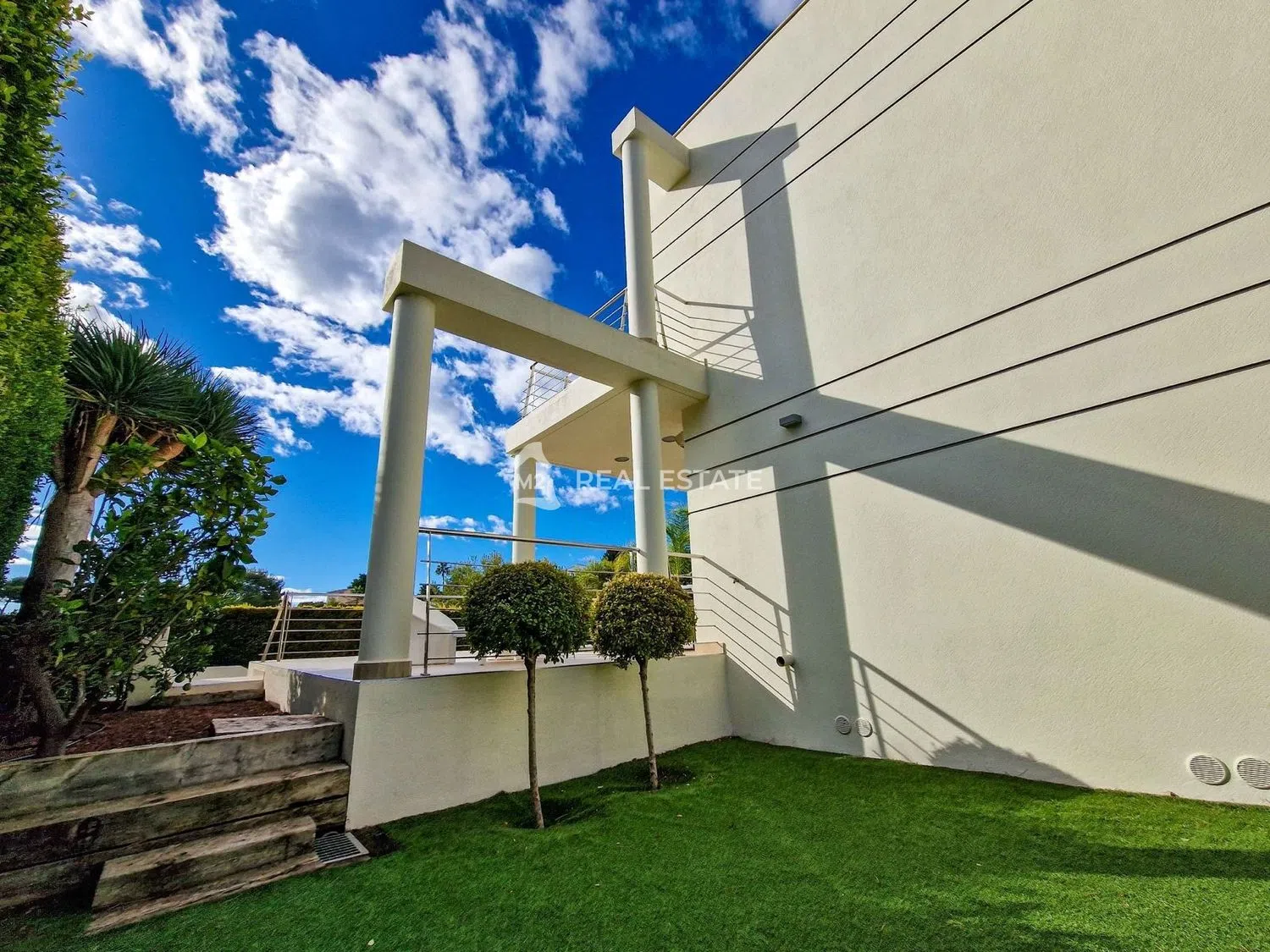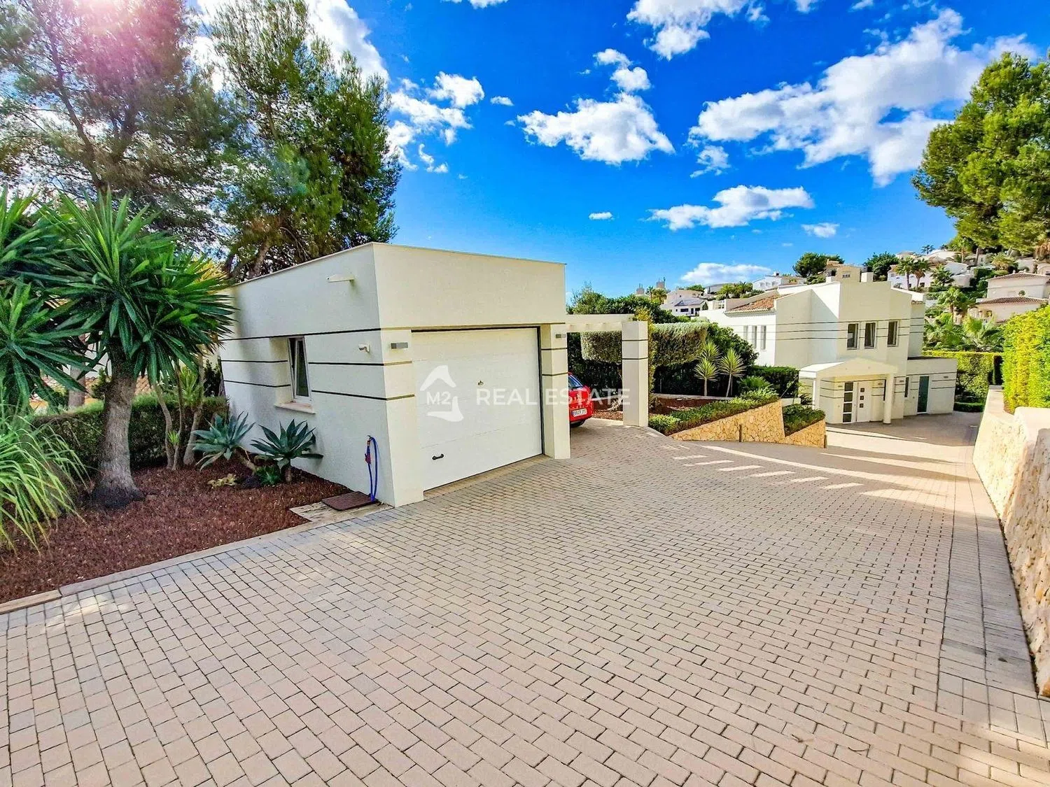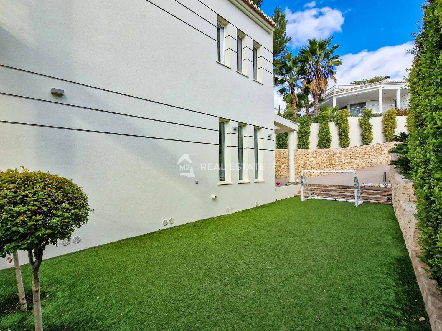 Na zewnątrz willa otoczona jest ekskluzywnym, zadbanym ogrodem, z wydzielonym dojazdem wyłożonym kostką oraz naturalnym murkiem kamiennym, który dodaje uroku i prywatności. Znajduje się tutaj również strefa z sztuczną trawą, idealna dla dzieci do zabawy w bezpiecznym otoczeniu. Ta luksusowa nieruchomość sprzedawana jest w pełni umeblowana, co umożliwia łatwe wprowadzenie się i natychmiastowe cieszenie się życiem w tym regionie.