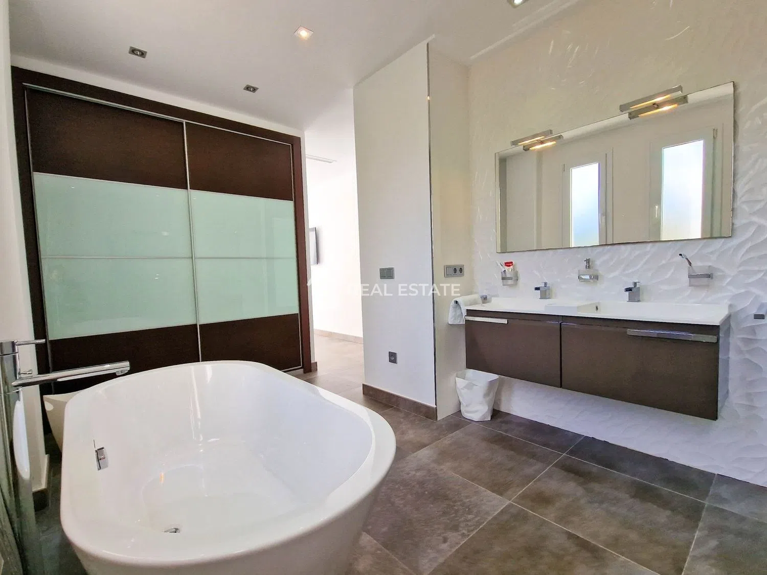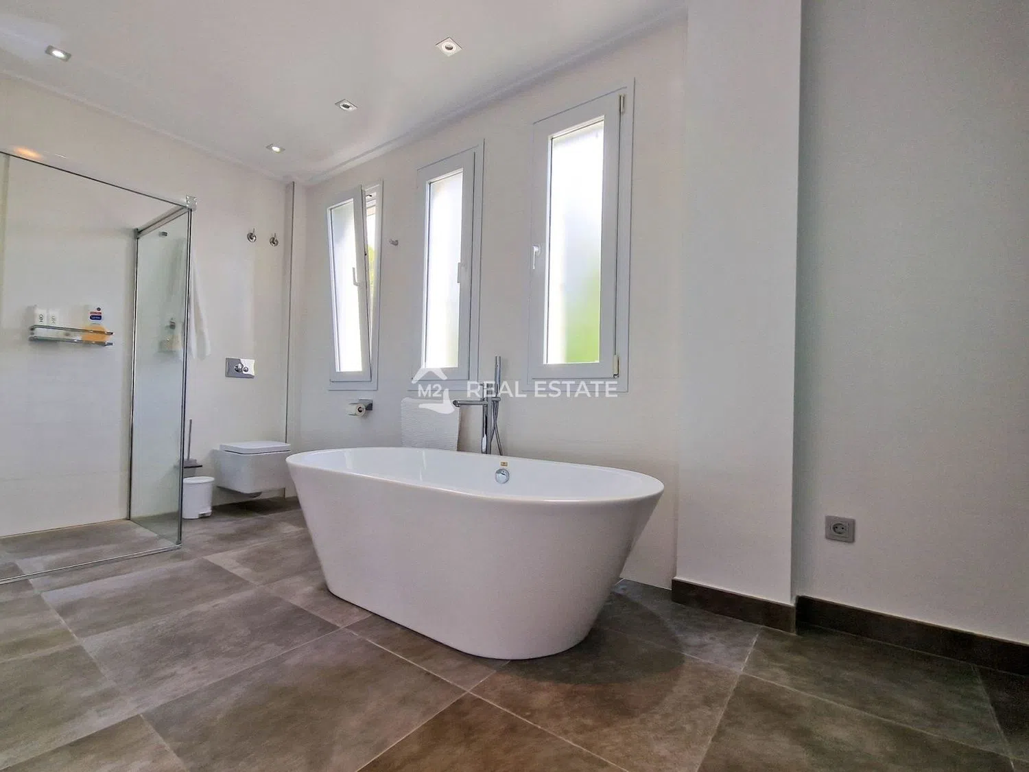 Pierwsze piętro to przestrzeń przeznaczona na główną sypialnię z prywatną łazienką, w której znajduje się wanna i prysznic, oraz wyjście na prywatny taras z pięknymi widokami na morze. Oprócz tego znajdują się tutaj trzy pokoje gościnne, z których dwa mają dostęp do własnego tarasu. Elegancka łazienka z prysznicem i dwoma umywalkami dopełnia ten poziom. Wejście do nieruchomości zawiera garaż z automatyczną bramą, co zapewnia maksymalną wygodę oraz dodatkową wiatę garażową dla kolejnego pojazdu.