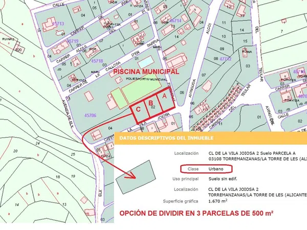 PARCELA C. Suelo urbano frente a Hotel Sester en residencial "Ciudad Jardín" de Torremanzanas, rodeado de chalets y junto a piscina municipal. Esquina calle Finestrat y Villajoyosa. Torremanzanas es un pueblo con encanto, para disfrutar de una tranquilidad sin precedentes en plena naturaleza. Puedes vivir todo el año ya que al norte está Alcoy, a tan solo 15 minutos; al sur Alicante, a 40 minutos y al este Villajoyosa y Benidorm a 30 minutos o pasar temporadas para poder disfrutar de sus fiestas, su mercado dominical, sus bosques, su cocina, así como sus rutas para realizar senderismo, ciclismo.. . disfrutando de un sano y revitalizante aire puro. El clima en verano es muy agradable y por la noche puedes taparte. NO TE LO PIENSES, LA TORRE ES ÚNICA!