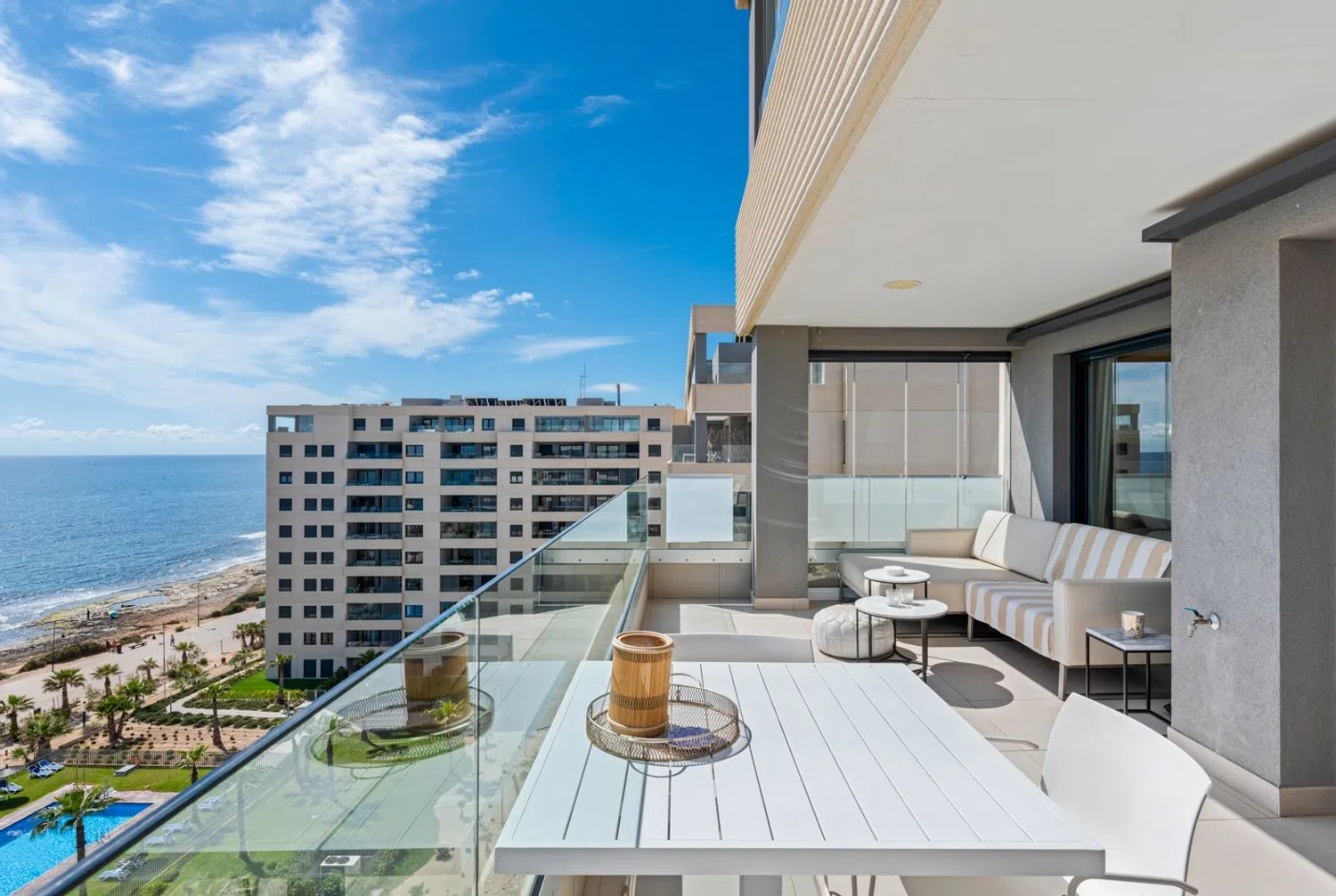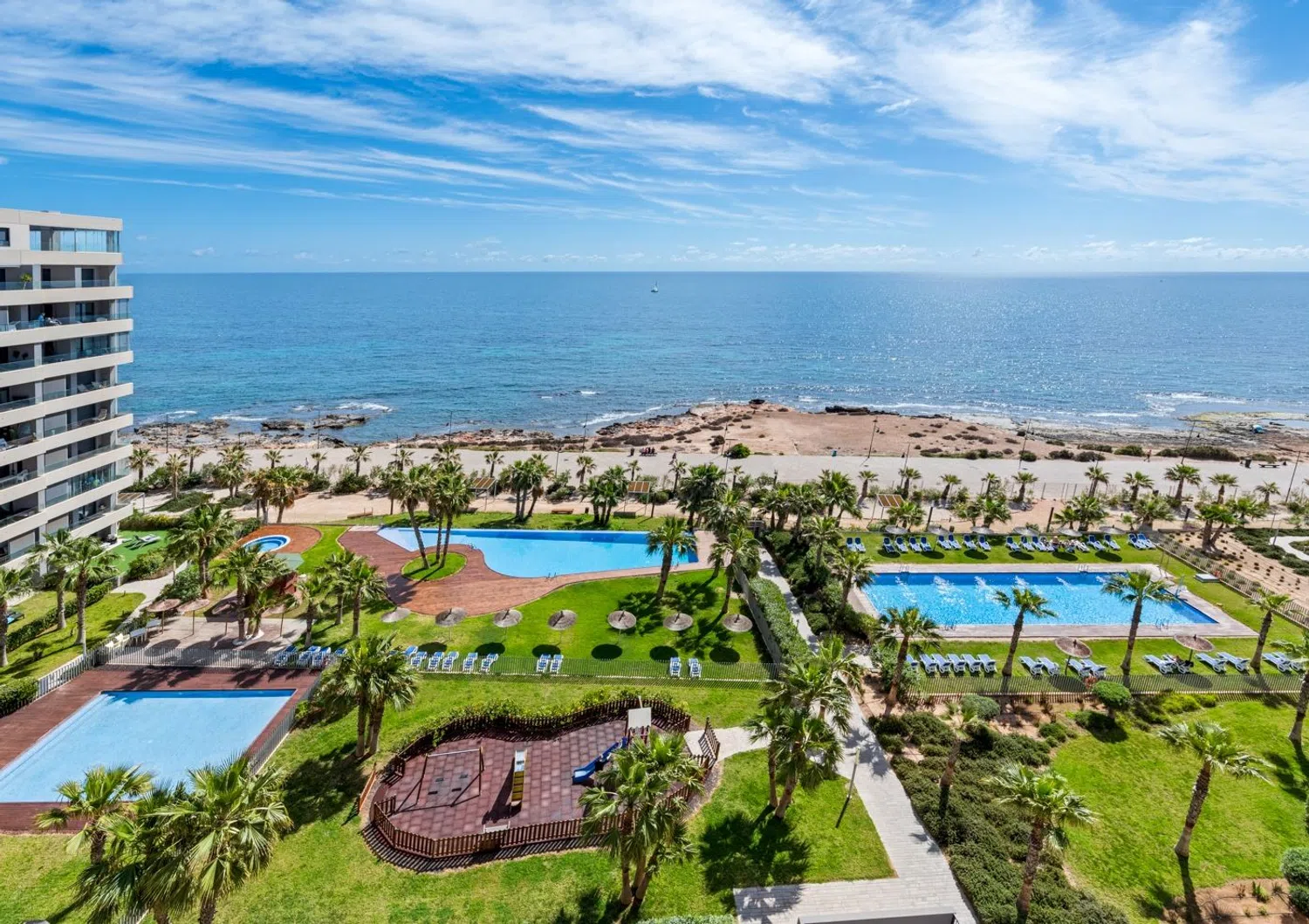 W nowoczesnej strefie wspólnej tego pięknego ośrodka znajdują się: trzy baseny (w tym jeden podgrzewany, dostępny przez cały rok), jacuzzi, leżaki, plac zabaw dla dzieci, strefa dla najmłodszych oraz kort do padla. Apartament wyposażony jest w: klimatyzację (chłodzenie i ogrzewanie), windę, pełne umeblowanie, markizę, prywatne miejsce parkingowe oraz zamknięty schowek. Skontaktuj się z nami, aby umówić się na wizytę (wideo).