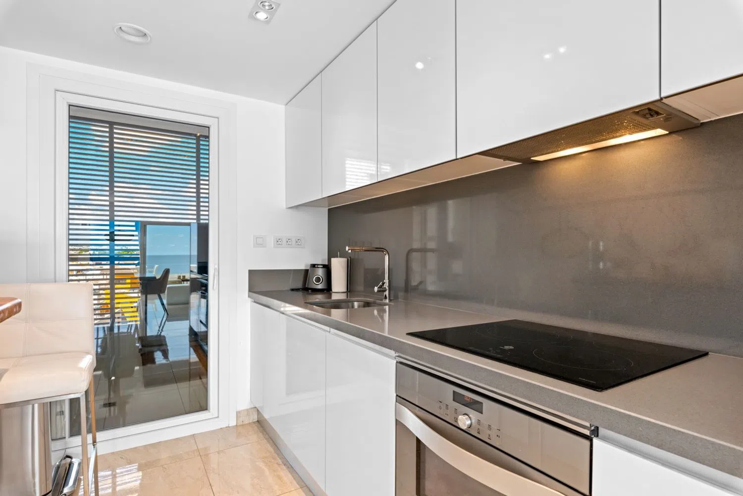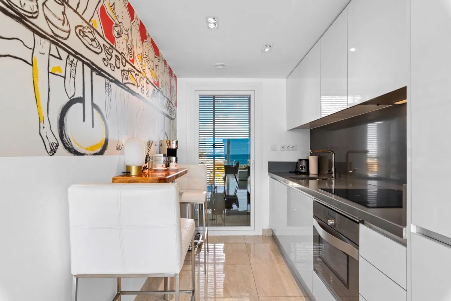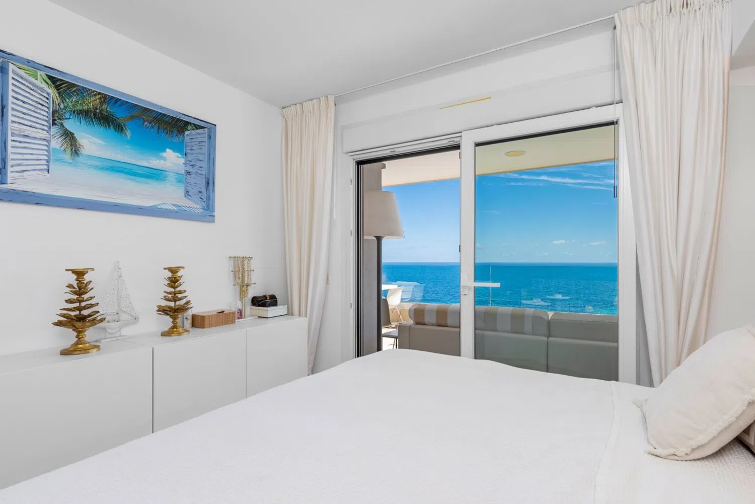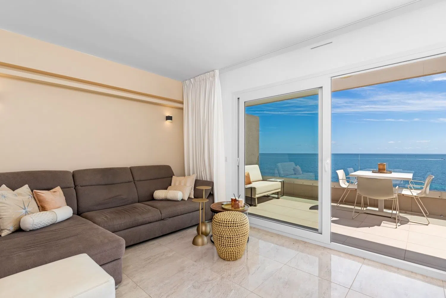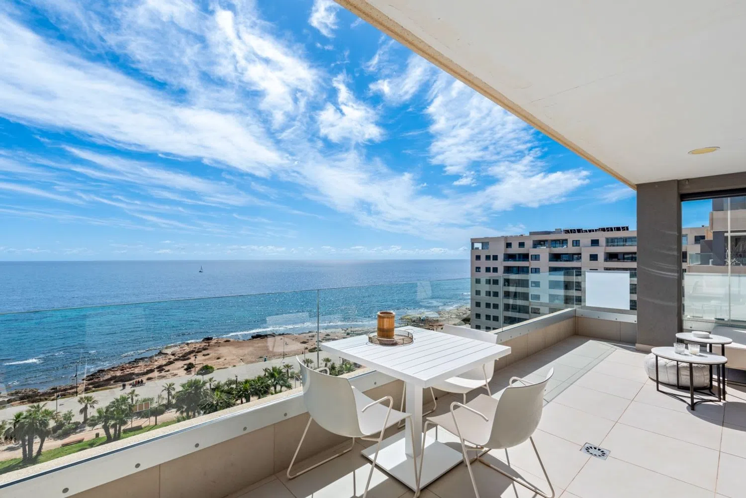 Ten apartament jest w pełni wyposażony w różne dodatki i umeblowany zgodnie z ukazanymi na zdjęciach aranżacjami. Składa się z dwóch sypialni i dwóch łazienek, z których jedna jest w komplecie. Wszystkie pomieszczenia zapewniają spektakularne widoki na morze i znajdują się zaledwie 50 metrów od plaży. Po wejściu do apartamentu od razu zwraca uwagę przestronny salon oraz nowoczesna, otwarta kuchnia, a przede wszystkim duże przeszklenia, przez które możemy podziwiać piękne, panoramiczne widoki na morze. Można tu również cieszyć się przestronnym tarasem, gdzie króluje słońce, morze i spokój.