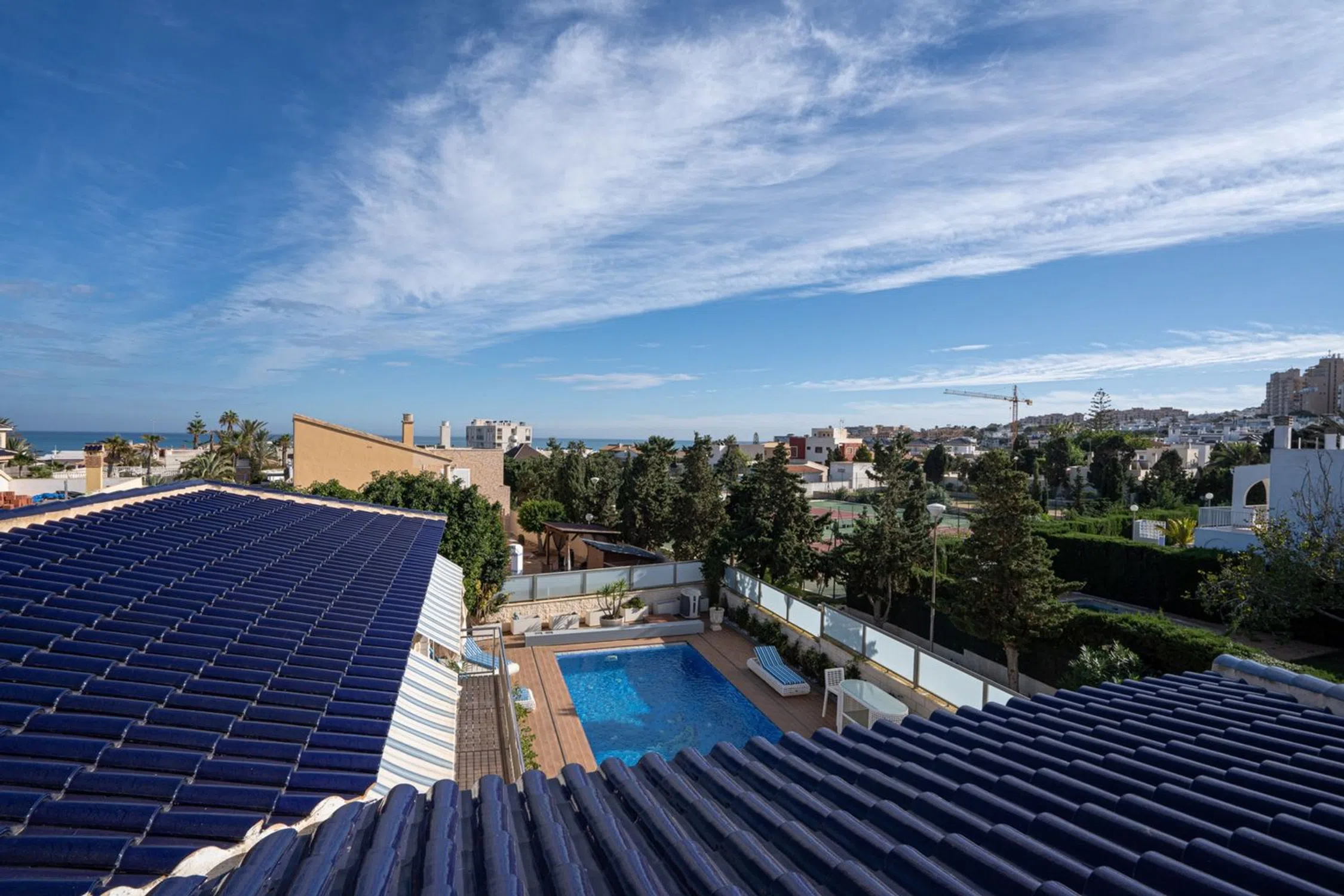 La villa consta de tres plantas. En la planta de entrada hay tres dormitorios, dos baños, un aseo, un cuarto de ducha, salón y cocina, y acceso a una gran terraza tanto desde el salón como desde el dormitorio. Arriba hay dos dormitorios, un baño y un acogedor balcón con fantásticas vistas de los alrededores y del Mar Mediterráneo. Si baja las escaleras al sótano, hay una gran sala común, un vestidor que se puede utilizar como dormitorio, lavadero y, por último, pero no menos importante, un encantador spa con sauna finlandesa, sauna turca y ducha. En la gran parcela, hay increíbles zonas para pasar el rato, espacio para aparcar varios coches y una zona de piscina realmente agradable y acogedora. La casa pertenece a una comunidad con jardín y pista de tenis compartidos. En la zona inmediata hay una gran selección de restaurantes, bares, tiendas y todos los servicios necesarios para su estancia en Torrevieja. Para los amantes de la playa, a pocos minutos a pie se encuentra la popular playa de La Mata con sus chiringuitos. Aquí podrá disfrutar de sus días. La casa está ubicada en una zona con vida y movimiento durante todo el año. Torrevieja ofrece una amplia gama de entretenimiento para toda la familia y todas las edades, como karts, bolos, cine, compras, golf, etc. Todo para todos los intereses. La ciudad cuenta con una gran oferta culinaria con restaurantes y bares de alta calidad. El centro de Torrevieja también tiene un acogedor puerto y la ciudad está viva todo el año. Para aquellos que buscan una villa grande y única en una ubicación fantástica. Bienvenido a casa.