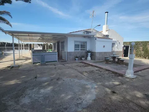 NO SE ALQUILA. Preciosa casa de 2 dormitorios con piscina, agua corriente y energía solar. Estamos orgullosos de ofrecer esta encantadora villa española en el campo a las afueras de Villena, con 2 dormitorios, 1 baño principal y un WC exterior para los huéspedes que utilicen la piscina, etc. Al entrar por el camino de grava, lo recibe un largo camino de entrada hacia el área de estacionamiento principal (cochera) y una gran puerta de acceso a la casa. Está completamente vallada, por lo que es ideal si tiene perros, etc. , e incluye una zona vallada para perrera, otra perrera, trastero solar, casa principal con WC exterior y piscina de 7x4 m con escalera romana. En la parte trasera de la propiedad hay un área grande, actualmente diseñada como una pista de BMX/Motor cross, pero se podría convertir en un jardín con bastante facilidad, si fuera necesario. Al ingresar a la casa principal, lo recibe una sala de estar de buen tamaño con comedor y un arco a la cocina. Este tiene el baño familiar principal al frente. De vuelta al salón, hay dos dormitorios que parten de este, ambos con dos camas individuales. En el exterior de la casa hay un gran porche cubierto que rodea ambos lados, lo que brinda mucha sombra y espacio para vivir al aire libre. Mire el vídeo para comprender el diseño, etc.