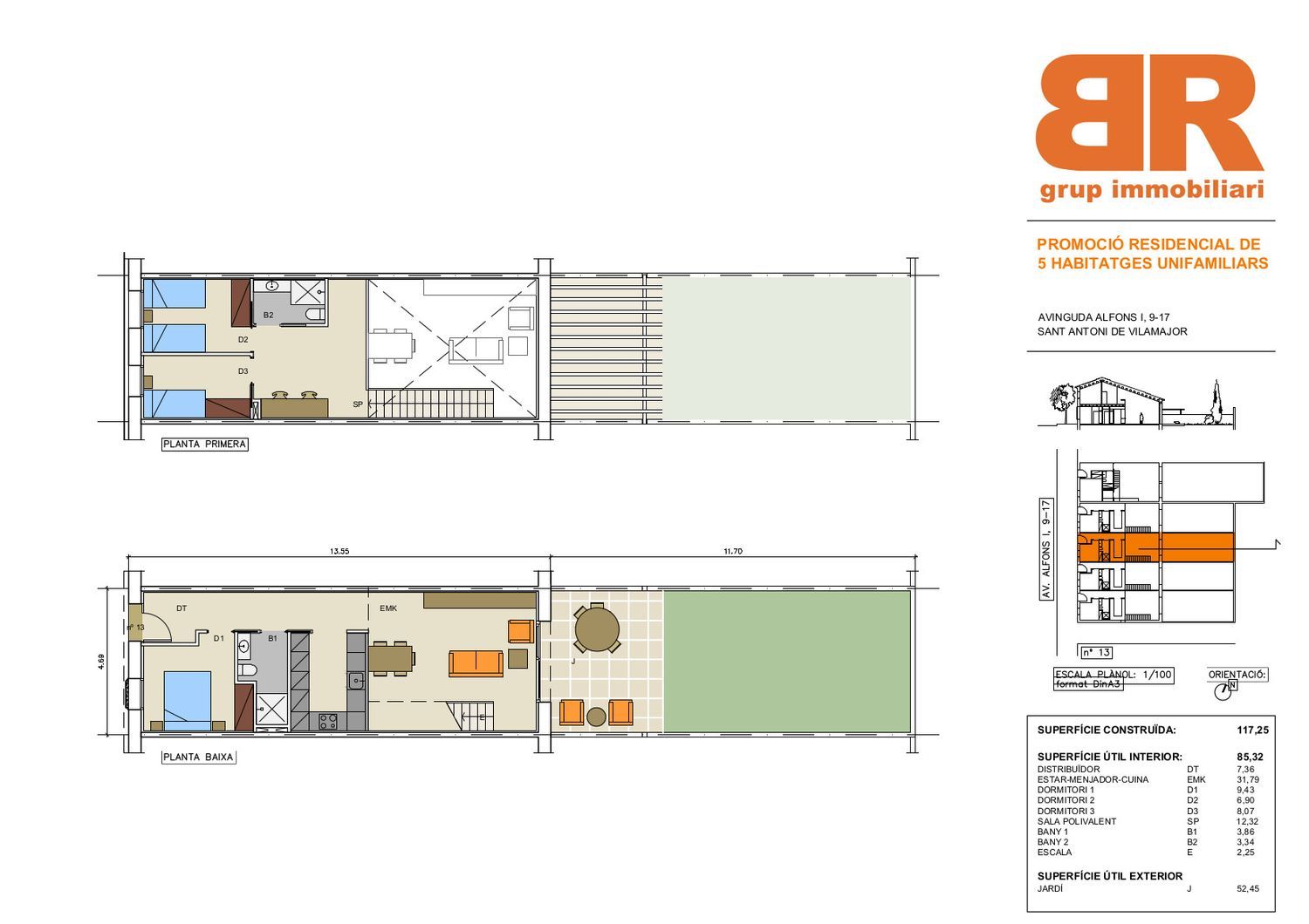 Casa de 2 plantas con 3 dormitorios dobles y 2 baños, con más de 100 m2 construidos (88,61 m2 superficie interior útil) y un espacioso jardín privado.En la primera planta tenemos el dormitorio principal, un baño completo y una amplia sala con cocina, salón y comedor.A través de esta sala de accede al jardín de la vivienda, con un amplio porche y un amplio espacio que puede equiparse con piscina, barbacoa, etc.La planta superior cuenta con 2 habitaciones (una de ellas dobles) y un baño completo, así como un espacio abierto de uso polivalente con vistas al salón comedor y al jardín, que puede acondicionarse como zona de ocio, estudio o despacho.